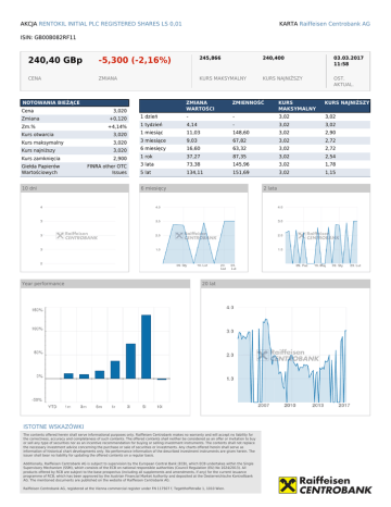 KARTA Raiffeisen Centrobank AG AKCJA RENTOKIL INITIAL PLC REGISTERED SHARES LS 0,01 ISIN: GB00B082RF11 240,40 GBp -5,300 (-2,16%) 245,866 240,400 03.03.2017 11:58 CENA ZMIANA KURS MAKSYMALNY KURS NAJNIŻSZY OST. AKTUAL. NOTOWANIA BIEŻĄCE Cena 3,020 ZMIANA WARTOŚCI ZMIENNOŚĆ KURS MAKSYMALNY KURS NAJNIŻSZY +0,120 1 dzień - - 3,02 3,02 +4,14% 1 tydzień 4,14 - 3,02 3,02 Kurs otwarcia 3,020 1 miesiąc 11,03 148,60 3,02 2,90 Kurs maksymalny 3,020 3 miesiące 9,03 67,82 3,02 2,72 3,020 6 miesięcy 16,60 63,32 3,02 2,72 2,900 1 rok 37,27 87,35 3,02 2,54 FINRA other OTC Issues 3 lata 73,38 145,96 3,02 1,78 5 lat 134,11 151,69 3,02 1,15 Zmiana Zm.% Kurs najniższy Kurs zamknięcia Giełda Papierów Wartościowych 10 dni Year performance 6 miesięcy 2 lata 20 lat ISTOTNE WSKAZÓWKI The contents offered herein shall serve informational purposes only. Raiffeisen Centrobank makes no warranty and will accept no liability for the correctness, accuracy and completeness of such contents. The offered contents shall neither be considered as an offer or invitation to buy or sell any type of securities nor as an incentive recommendation for buying or selling investment instruments. The contents shall not replace the necessary investment advice concerning the purchase or sale of securities or investments. Any charts offered herein shall serve as information of historical chart developments only. No performance information of the described investment instruments are given herein. The issuer shall bear no liability for updating the offered contents on a regular basis. Additionally, Raiffeisen Centrobank AG is subject to supervision by the European Central Bank (ECB), which ECB undertakes within the Single Supervisory Mechanism (SSM), which consists of the ECB on national responsible authorities (Council Regulation (EU) No 1024/2013). All products offered by RCB are subject to the base prospectus (including all supplements and amendments, if any) for the current issuance programme of RCB, which has been approved by the Austrian Financial Market Authority and deposited at the Oesterreichische Kontrollbank AG. The mentioned documents are published on the website of Raiffeisen Centrobank AG. Raiffeisen Centrobank AG, registered at the Vienna commercial register under FN 117507 f, Tegetthoffstraße 1, 1010 Wien. Powered by TCPDF (www.tcpdf.org)