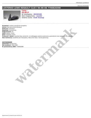 Informacje o produkcie Utworzono 03-03-2017 LUSTERKO LEWE RENAULT CLIO I 94-98 OE 7700826598 Cena : 68,88 zł Nr katalogowy : A6164166 Stan magazynowy : wysoki Średnia ocena : brak recenzji w at ZASTOSOWANIE Samochód: Renault Clio I Rok produkcji: 1994-1998 Nr porównawczy OEM: 7700826598 er m ar k Przedmiot: lusterko zewnętrzne kompletne Strona: lewa (po stronie kierowcy) Nadwozie: hatchback Regulacja: mechaniczna Podgrzewanie: nie Szkło: płaskie, chrom Kolor: obudowa czarna Producent / jakość: wysokiej klasy zamiennik, nie odbiegający jakością wykonania, parametrami oraz wyglądem od oryginału Stan techniczny: przedmiot jest nieużywany, fabrycznie nowy z roczną gwarancją Wygenerowano w programie www.oscGold.com