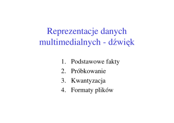 Reprezentacje danych multimedialnych - dźwięk 1. 2. 3. 4. Podstawowe fakty Próbkowanie Kwantyzacja Formaty plików Dźwięk – podstawowe fakty • Dźwięk – ciągła fala zgęszczeń i rozrzedzeń rozchodząca się w powietrzu • Wykazuje normalne własności falowe (odbicie, ugięcie itp.) • Prędkość rozchodzenia w powietrzu v(T) = ( 331 + T [°C] ) m/sek • Charakterystyki fali: częstotliwość, amplituda • Człowiek moŜe słyszeć dźwięki z zakresu częstotliwości: 16 Hz ÷ 20 kHz (długości fal 21.3 m ÷ 1.7 cm). Dźwięk – podstawowe fakty c.d. Miara intensywności: SPL = 10 log(P/P0) dB, P0 = 10-12 W/m2 Intensywność – nieliniowa funkcja mocy (podwojenie mocy to zmiana o 10 log(2) dB = 3 dB Przykładowe intensywności: • • • • • • 0 dB – próg słyszalności 30 dB – cichy dom 60 dB – biuro, rozmowa 80 dB – głośna ulica 120 dB – koncert rockowy; dyskomfort 140 dB – granica bólu Digitalizacja Rejestrując dźwięk uzyskujemy sygnał analogowy. V t Digitalizacja – zamiana na dyskretny ciąg liczb. Dyskretna siatka w kierunku czasowym – próbkowanie, w kierunku sygnału – kwantyzacja. t 1 3 4 5 6 3 0 -3 -4 1 3 1 0 2 0 -4 0 Jakość digitalizacji ZaleŜy od ilości poziomów kwantyzacji i częstości próbkowania Kwantyzacja – zaleŜy od ilości bitów przeznaczonych na reprezentację numeru progu kwantyzacji Kwantyzacja N-bitowa – 2N poziomów 8 bitów – 256 poziomów kwantyzacji 16 bitów – 65536 poziomów kwantyzacji Błąd kwantyzacji = wartość sygnału – wartość najbliŜszego poziomu kwantyzacji ≤ połowa odległości między poziomami Jak często naleŜy próbkować? fo fp = fo fp = 1.5 fo aliasing Aliasing • Gdy częstość próbkowania za mała – przekłamania w odtworzeniu częstości z próbek – aliasing f alias = f samp − f true , dla f true < f samp < 2 f true • Ogólnie: obserwowana częstość – najniŜsza moŜliwa częstość sinusoidy, która ma te same próbki co dana sinusoida wejściowa fsamp = 8 kHz Twierdzenie Nyquista H.Nyquist (1928), C.E. Shanon (1949) Aby móc dokładnie odtworzyć ciągły sygnał o ograniczonym paśmie z jego próbek, naleŜy zastosować częstość próbkowania równą co najmniej podwojonej najwyŜszej częstości sygnału. Wnioski: – aby przenieść całe pasmo akustyczne naleŜy wziąć fp ≥ 40 kHz (stosuje się 44.1 kHz) – aby dobrze przenieść mowę (100 Hz ÷ 3.5 kHz) naleŜy wziąć fp ≥ 7 kHz (stosuje się 8 kHz) – aby uniknąć aliasingu naleŜy zastosować filtr dolnoprzepustowy z częstością obcięcia fo = fp/2 Jakość kwantyzacji Dla układów analogowych miara jakości sygnału – SNR: SNR = 10 log (Vs2 / Vn2) Miara jakości kwantyzacji – SQNR: SQNR = 10 log (Vs2 / Vqe2) Dla kwantyzacji N-bitowej: sygnał: – 2N-1 ÷ 2N-1 błąd kwantyzacji: ½ (w najgorszym razie) SQNR = 20 log(2N) = N * 20 log(2) = 6.02 * N (dB) N=8, SQNR = 48 dB N=16, SQNR = 96 dB Filtrowanie audio Przed próbkowaniem i konwersją AD – filtr pasmowy (dolnoprzepustowy, 2 fhigh < fobc < fsamp ) Po stronie dekodera DA pojawiają się znów wysokie częstości – konieczny filtr dolnoprzepustowy Kwantyzacja nieliniowa Do tej pory – przedziały kwantyzacji równej szerokości (kwantyzacja liniowa) Nie odpowiada to ludzkiej wraŜliwości – prawo Webera (związek miedzy zmianą wraŜenia i zmianą sygnału): ∆s ∆r ∝ s Po scałkowaniu: r = k ln(s / s0 ) Ze względów percepcyjnych – lepiej kwantyzować tak, by uzyskać równe odstępy w r (więcej poziomów tam, gdzie większa wraŜliwość Kwantyzacja nieliniowa – c.d. Nieliniowa transformacja od sygnału s do teoretycznej wielkości r; kwantyzacja jednorodna w r Najczęściej stosowane w telefonii: • u-law (USA, Japonia) • A-law (Europa) Kwantyzacja nieliniowa – c.d. Jakość – przepustowość Typ fp [kHz] Bit/ prób. Ile kan. Pasmo Przep. [kB/s] 1 min. danych Telefon 8 8 1 200 – 3.400 Hz 8 480 kB CD 44.1 16 2 20 Hz – 20 kHz 172.3 10 MB DVD audio 192 (max) 24 (max) 6 0 – 96 kHz 1200 (max) 70 MB (max) Typowe formaty danych: *.wav, *.aiff, *.au – pliki kodowane PCM dla Windows, Mac, Unix *.mp3, *.ra, *.wma, *.ogg – formaty strumieniowe Format WAVE Opracowany przez Microsoft format zapisu audio – szczególny przypadek specyfikacji RIFF (pochodnej EA IFF) Ogólna struktura pliku – nagłówek specyfikujący typ i rozmiar pliku, szereg róŜnego rodzaju porcji (chunks) opisujących strukturę i wartości danych W WAVE – obowiązkowe porcje typu ”fmt ” i ”data”; segment formatu musi poprzedzać dane. Wszystkie liczby specyfikowane w porządku od najmłodszego do najstarszego bytu (little endian). Formaty AIFF i AU – podobne 4 4 4 ChunkID ChunkSize Format napis "RIFF" rozmiar pozostałej części pliku napis "WAVE" ================================================================================ 4 4 2 2 4 4 2 2 2 X Subchunk1ID napis "fmt " Subchunk1Size rozmiar ozostałej części porcji (16 dla PCM) AudioFormat PCM = 1 (i.e. Linear quantization) NumChannels Mono = 1, Stereo = 2, etc. SampleRate 8000, 44100, etc. ByteRate = SampleRate * NumChannels * BitsPerSample/8 BlockAlign = NumChannels * BitsPerSample/8 BitsPerSample 8 bits = 8, 16 bits = 16, etc. ExtraParamSize gdy PCM, to tego nie ma ExtraParams ewentualne dodatkowe dane (gdy nie PCM) ================================================================================ 4 4 * Subchunk2ID napis "data" Subchunk2Size = NumSamples * NumChannels * BitsPerSample/8 Data dane próbek dźwięku Format WAVE – c.d. Dodatkowe fakty: • Dane próbek muszą się mieścić w parzystej liczbie bajtów • Próbki 8-bitowe są składowane jako liczby bez znaku: 0 .. 255 • Próbki 16-bitowe są składowane jako liczby ze znakiem: -32768 .. 32767 Przykład: nagłówek pewnego pliku ma postać: 52 49 46 46 24 08 00 00 57 41 56 45 66 6d 74 20 10 00 00 00 01 00 02 00 22 56 00 00 88 58 01 00 04 00 10 00 64 61 74 61 00 08 00 00 00 00 00 