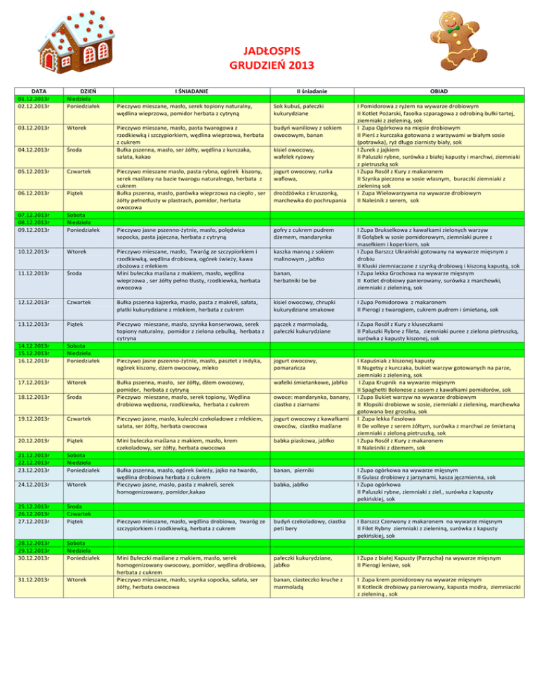 JADŁOSPIS GRUDZIEŃ 2013 DATA 01.12.2013r 02.12.2013r DZIEŃ Niedziela Poniedziałek 03.12.2013r Wtorek 04.12.2013r Środa 05.12.2013r Czwartek 06.12.2013r Piątek 07.12.2013r 08.12.2013r 09.12.2013r Sobota Niedziela Poniedziałek 10.12.2013r Wtorek 11.12.2013r Środa 12.12.2013r I ŚNIADANIE II śniadanie OBIAD Pieczywo mieszane, masło, serek topiony naturalny, wędlina wieprzowa, pomidor herbata z cytryną Sok kubuś, pałeczki kukurydziane Pieczywo mieszane, masło, pasta twarogowa z rzodkiewką i szczypiorkiem, wędlina wieprzowa, herbata z cukrem Bułka pszenna, masło, ser żółty, wędlina z kurczaka, sałata, kakao budyń waniliowy z sokiem owocowym, banan Pieczywo mieszane masło, pasta rybna, ogórek kiszony, serek maślany na bazie twarogu naturalnego, herbata z cukrem Bułka pszenna, masło, parówka wieprzowa na ciepło , ser żółty pełnotłusty w plastrach, pomidor, herbata owocowa jogurt owocowy, rurka waflowa, Pieczywo jasne pszenno-żytnie, masło, polędwica sopocka, pasta jajeczna, herbata z cytryną gofry z cukrem pudrem dżemem, mandarynka Pieczywo mieszane, masło, Twaróg ze szczypiorkiem i rzodkiewką, wędlina drobiowa, ogórek świeży, kawa zbożowa z mlekiem Mini bułeczka maślana z makiem, masło, wędlina wieprzowa , ser żółty pełno tłusty, rzodkiewka, herbata owocowa kaszka manną z sokiem malinowym , jabłko Czwartek Bułka pszenna kajzerka, masło, pasta z makreli, sałata, płatki kukurydziane z mlekiem, herbata z cukrem kisiel owocowy, chrupki kukurydziane smakowe I Zupa Pomidorowa z makaronem II Pierogi z twarogiem, cukrem pudrem i śmietaną, sok 13.12.2013r Piątek Pieczywo mieszane, masło, szynka konserwowa, serek topiony naturalny, pomidor z zielona cebulką, herbata z cytryna pączek z marmoladą, pałeczki kukurydziane I Zupa Rosół z Kury z kluseczkami II Paluszki Rybne z fileta, ziemniaki puree z zielona pietruszką, surówka z kapusty kiszonej, sok 14.12.2013r 15.12.2013r 16.12.2013r Sobota Niedziela Poniedziałek Pieczywo jasne pszenno-żytnie, masło, pasztet z indyka, ogórek kiszony, dżem owocowy, mleko jogurt owocowy, pomarańcza 17.12.2013r Wtorek wafelki śmietankowe, jabłko 18.12.2013r Środa Bułka pszenna, masło, ser żółty, dżem owocowy, pomidor, herbata z cytryną Pieczywo mieszane, masło, serek topiony, Wędlina drobiowa wędzona, rzodkiewka, herbata z cukrem 19.12.2013r Czwartek Pieczywo jasne, masło, kuleczki czekoladowe z mlekiem, sałata, ser żółty, herbata owocowa jogurt owocowy z kawałkami owoców, ciastko maślane 20.12.2013r Piątek Mini bułeczka maślana z makiem, masło, krem czekoladowy, ser żółty, herbata owocowa babka piaskowa, jabłko I Kapuśniak z kiszonej kapusty II Nugetsy z kurczaka, bukiet warzyw gotowanych na parze, ziemniaki z zieleniną, sok I Zupa Krupnik na wywarze mięsnym II Spaghetti Bolonese z sosem z kawałkami pomidorów, sok I Zupa Bukiet warzyw na wywarze drobiowym II Klopsiki drobiowe w sosie, ziemniaki z zieleniną, marchewka gotowana bez groszku, sok I Zupa lekka Fasolowa II De volleye z serem żółtym, surówka z marchwi ze śmietaną ziemniaki z zieloną pietruszką, sok I Zupa Rosół z Kury z makaronem II Naleśniki z dżemem, sok 21.12.2013r 22.12.2013r 23.12.2013r Sobota Niedziela Poniedziałek banan, pierniki 24.12.2013r Wtorek Bułka pszenna, masło, ogórek świeży, jajko na twardo, wędlina drobiowa herbata z cukrem Pieczywo jasne, masło, pasta z makreli, serek homogenizowany, pomidor,kakao 25.12.2013r 26.12.2013r 27.12.2013r Środa Czwartek Piątek Pieczywo mieszane, masło, wędlina drobiowa, twaróg ze szczypiorkiem i rzodkiewką, herbata z cukrem budyń czekoladowy, ciastka peti bery I Barszcz Czerwony z makaronem na wywarze mięsnym II Filet Rybny ziemniaki z zieleniną, surówka z kapusty pekińskiej, sok 28.12.2013r 29.12.2013r 30.12.2013r Sobota Niedziela Poniedziałek pałeczki kukurydziane, jabłko I Zupa z białej Kapusty (Parzycha) na wywarze mięsnym II Pierogi leniwe, sok 31.12.2013r Wtorek Mini Bułeczki maślane z makiem, masło, serek homogenizowany owocowy, pomidor, wędlina drobiowa, herbata z cukrem Pieczywo mieszane, masło, szynka sopocka, sałata, ser żółty, herbata owocowa banan, ciasteczko kruche z marmoladą I Zupa krem pomidorowy na wywarze mięsnym II Kotlecik drobiowy panierowany, kapusta modra, ziemniaczki z zieleniną , sok kisiel owocowy, wafelek ryżowy drożdżówka z kruszonką, marchewka do pochrupania banan, herbatniki be be owoce: mandarynka, banany, ciastko z ziarnami babka, jabłko I Pomidorowa z ryżem na wywarze drobiowym II Kotlet Pożarski, fasolka szparagowa z odrobiną bułki tartej, ziemniaki z zieleniną, sok I Zupa Ogórkowa na mięsie drobiowym II Pierś z kurczaka gotowana z warzywami w białym sosie (potrawka), ryż długo ziarnisty biały, sok I Żurek z jajkiem II Paluszki rybne, surówka z białej kapusty i marchwi, ziemniaki z pietruszką sok I Zupa Rosół z Kury z makaronem II Szynka pieczona w sosie własnym, buraczki ziemniaki z zieleniną sok I Zupa Wielowarzywna na wywarze drobiowym II Naleśnik z serem, sok I Zupa Brukselkowa z kawałkami zielonych warzyw II Gołąbek w sosie pomidorowym, ziemniaki puree z masełkiem i koperkiem, sok I Zupa Barszcz Ukraiński gotowany na wywarze mięsnym z drobiu II Kluski ziemniaczane z szynką drobiową i kiszoną kapustą, sok I Zupa lekka Grochowa na wywarze mięsnym II Kotlet drobiowy panierowany, surówka z marchewki, ziemniaki z zieleniną, sok I Zupa ogórkowa na wywarze mięsnym II Gulasz drobiowy z jarzynami, kasza jęczmienna, sok I Zupa ogórkowa II Paluszki rybne, ziemniaki z ziel., surówka z kapusty pekińskiej, sok