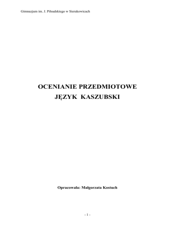 Gimnazjum im. J. Piłsudskiego w Sierakowicach OCENIANIE PRZEDMIOTOWE JĘZYK KASZUBSKI Opracowała: Małgorzata Kostuch -1- Gimnazjum im. J. Piłsudskiego w Sierakowicach OCENIANIE PRZEDMIOTOWE Z JĘZYKA KASZUBSKIEGO OPRACOWANO NA PODSTAWIE PROGRAMU „GÔDÓM I PISZÃ PÒ KASZËBSKÙ” Spis treści: I. II. III. IV. V. VI. VII. VIII. Wstęp. Cele oceniania. Obszary aktywności podlegające ocenie. Zasady oceniania. Kryteria wymagań. Formy sprawdzania wiadomości. Sposób ustalania oceny semestralnej i końcowej. Kontrakt z uczniami dotyczący sposobu oceniania. I. Wstęp. Opracowanie kryteriów oceniania z języka kaszubskiego pozwoliło na skonkretyzowanie i ujednolicenie wymagań w stosunku do uczniów , określenia zakresu podstawowych wiadomości i umiejętności oraz wymagań na pozostałe oceny. Oceny są jawne, obiektywne, a przede wszystkim motywujące, gdyż misją zajęć kaszubskich jest umożliwienie poznania przez uczniów własnego dziedzictwa kulturowego, pokazanie piękna języka kaszubskiego oraz poczynienie starań w celu zachowania obyczajów i języka przodków. Realizuje się to w systemie zajęć lekcyjnych oraz przez wszelką pozalekcyjną aktywność. Dlatego też wystawiając ocenę trzeba wziąć pod uwagę nie tylko stopień opanowania w mowie i piśmie języka, ale też sukcesy ucznia w konkursach, przeglądach twórczości. II. Ocenianie osiągnięć uczniów w zakresie języka kaszubskiego ma na celu : - zmierzenie wyników pracy ucznia, - ujawnienie jego osiągnięć i braków, - zmotywowanie i wspieranie w dalszej pracy, - docenienie jego wysiłków w zakresie poznania dziedzictwa kulturowego i opanowania w mowie i piśmie podstaw języka kaszubskiego, - dostarczenie rodzicom informacji o zdolnościach , predyspozycjach i trudnościach dziecka, - ukierunkowanie dziecka pod względem dalszego rozwoju jego zdolności i zainteresowań, - umożliwienie nauczycielom doskonalenia i korekty organizacji i metod pracy dydaktyczno – wychowawczej. -2- Gimnazjum im. J. Piłsudskiego w Sierakowicach III. Kontroli i ocenie podlegają: - karty pracy - zeszyt przedmiotowy - aktywność na lekcji - odpowiedzi ustne - recytacja wierszy - czytanie tekstów lirycznych i epickich - samodzielne wyszukiwanie informacji z różnych źródeł, - osiągnięcia uczniów w konkursach językowych i twórczości kaszubskiej. IV. Zasady oceniania: 1. Wymagania edukacyjne i system oceniania są znane uczniom, rodzicom i nauczycielom. 2. Ocena jest jawna i uzasadniona. 3. Na bieżąco zapisuje się oceny w dzienniku. 4. Uczeń jest sprawdzany w zakresie czterech sprawności językowych: a) czytanie b) rozumienie ze słuchu c) mówienie d) pisanie 5. Preferuje się wszystkie formy ustnych wypowiedzi i wykorzystanie słownictwa w praktyce. 6. Uczniowie mają obowiązek prowadzenia zeszytu i gromadzenia materiałów otrzymanych na lekcjach. 7. Ocenie podlega pozalekcyjna kaszubska działalność dziecka. 8. Nauczyciel może nagrodzić dziecko za nadobowiązkowe przygotowanie materiałów na lekcje. 9. Nauczyciel indywidualizuje pracę z uczniem odpowiednio do potrzeb rozwojowych, edukacyjnych oraz możliwości psychofizycznych ucznia. 10.Nauczyciel dostosowuje wymagania edukacyjne do indywidualnych potrzeb rozwojowych i edukacyjnych oraz możliwości psychofizycznych ucznia posiadającego orzeczenie o potrzebie kształcenia specjalnego na podstawie tego orzeczenia, posiadającego opinię poradni psychologicznopedagogicznej na podstawie tej opinii. System oceniania z języka kaszubskiego jest zgodny z ocenianiem wewnątrzszkolnym. Prace pisemne oceniane są punktowo. Punkty przeliczane są na procenty a następnie na oceny szkolne zgodnie z przyjętą w OW skalą. -3- Gimnazjum im. J. Piłsudskiego w Sierakowicach Sposób wystawiania oceny: (1) (2) (3-) (3) (3+) (4-) (4) (4+) (5-) (5) (6) 0% - 39 % punktów 40% - 50% punktów 51% - 55% punktów 56% - 65% punktów 66% - 70% punktów 71% - 75% punktów 76% - 80% punktów 81% - 85% punktów 86% - 90% punktów 91% - 99% punktów 100% punktów Wszystkie oceny cząstkowe mają przypisane wagi, czyli liczby określające orientacyjny wkład pracy ucznia w uzyskanie tej oceny. Stosowane są następujące wagi: 1 – niski stopień trudności uzyskania oceny 2 – średni stopień trudności uzyskania oceny 3 – wysoki stopień trudności uzyskania oceny Najwyższą wagę przypisujemy ocenom ze sprawdzianów, gdyż kontrola tą metodą obejmuje na ogół największy zakres treści nauczania. Najniższą wartość przypisujemy ocenom z prac domowych, nagradzając prace twórcze, przygotowane przez uczniów szczególnie zainteresowanych językiem kaszubskim. Rodzaj pracy sprawdzian, test dyktando, wypracowanie, recytacja wypowiedzi ustne, czytanie tekstów aktywność na lekcji praca na lekcji prowadzenie zeszytu przedmiotowego Waga 3 2 2 1 1 1 V. Kryteria wymagań przy stawianiu ocen uczniom: Klasa I: Ocena niedostateczna (poziom 1) Uczeń nie posiada wiadomości i podstaw z poziomu 2, nie interesuje się przedmiotem, nie wykazuje chęci poprawy. -4- Gimnazjum im. J. Piłsudskiego w Sierakowicach Ocena dopuszczająca (poziom 2) 1. Zasób wiadomości - mówienie: refleksyjne używanie poznanych słów kaszubskich i konstrukcji zdaniowych; poprawna artykulacja głosek kaszubskich, formułowanie pytań i odpowiedzi na nie, związanych z tekstem lub najbliższym otoczeniem, poprawne (pod względem dykcji, akcentu, intonacji, wymowy) formułowanie wypowiedzi o sobie, rodzinie, najbliższym otoczeniu lub na inny wybrany temat; - rozumienie: rozumienie tekstów o pewnym stopniu trudności i związanych z poznawanym materiałem; - czytanie: samodzielne czytanie tekstów z niezbyt skomplikowanym słownictwem; - pisanie: zapis krótkich tekstów i wyrazów, wykazywanie się znajomością podstawowych zasad pisowni. 2. Zainteresowanie przedmiotem. 3. Stosunek do lekcji j. kaszubskiego : bieżące uzupełnianie kart pracy i prowadzenie zeszytu, aktywność. 4