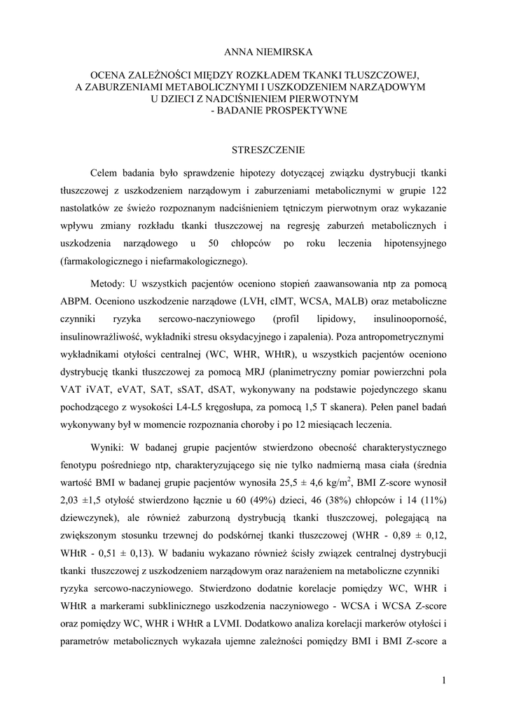 ANNA NIEMIRSKA OCENA ZALEśNOŚCI MIĘDZY ROZKŁADEM TKANKI TŁUSZCZOWEJ, A ZABURZENIAMI METABOLICZNYMI I USZKODZENIEM NARZĄDOWYM U DZIECI Z NADCIŚNIENIEM PIERWOTNYM - BADANIE PROSPEKTYWNE STRESZCZENIE Celem badania było sprawdzenie hipotezy dotyczącej związku dystrybucji tkanki tłuszczowej z uszkodzeniem narządowym i zaburzeniami metabolicznymi w grupie 122 nastolatków ze świeŜo rozpoznanym nadciśnieniem tętniczym pierwotnym oraz wykazanie wpływu zmiany rozkładu tkanki tłuszczowej na regresję zaburzeń metabolicznych i uszkodzenia narządowego u 50 chłopców po roku leczenia hipotensyjnego (farmakologicznego i niefarmakologicznego). Metody: U wszystkich pacjentów oceniono stopień zaawansowania ntp za pomocą ABPM. Oceniono uszkodzenie narządowe (LVH, cIMT, WCSA, MALB) oraz metaboliczne czynniki ryzyka sercowo-naczyniowego (profil lipidowy, insulinooporność, insulinowraŜliwość, wykładniki stresu oksydacyjnego i zapalenia). Poza antropometrycznymi wykładnikami otyłości centralnej (WC, WHR, WHtR), u wszystkich pacjentów oceniono dystrybucję tkanki tłuszczowej za pomocą MRJ (planimetryczny pomiar powierzchni pola VAT iVAT, eVAT, SAT, sSAT, dSAT, wykonywany na podstawie pojedynczego skanu pochodzącego z wysokości L4-L5 kręgosłupa, za pomocą 1,5 T skanera). Pełen panel badań wykonywany był w momencie rozpoznania choroby i po 12 miesiącach leczenia. Wyniki: W badanej grupie pacjentów stwierdzono obecność charakterystycznego fenotypu pośredniego ntp, charakteryzującego się nie tylko nadmierną masa ciała (średnia wartość BMI w badanej grupie pacjentów wynosiła 25,5 ± 4,6 kg/m2, BMI Z-score wynosił 2,03 ±1,5 otyłość stwierdzono łącznie u 60 (49%) dzieci, 46 (38%) chłopców i 14 (11%) dziewczynek), ale równieŜ zaburzoną dystrybucją tkanki tłuszczowej, polegającą na zwiększonym stosunku trzewnej do podskórnej tkanki tłuszczowej (WHR - 0,89 ± 0,12, WHtR - 0,51 ± 0,13). W badaniu wykazano równieŜ ścisły związek centralnej dystrybucji tkanki tłuszczowej z uszkodzeniem narządowym oraz naraŜeniem na metaboliczne czynniki ryzyka sercowo-naczyniowego. Stwierdzono dodatnie korelacje pomiędzy WC, WHR i WHtR a markerami subklinicznego uszkodzenia naczyniowego - WCSA i WCSA Z-score oraz pomiędzy WC, WHR i WHtR a LVMI. Dodatkowo analiza korelacji markerów otyłości i parametrów metabolicznych wykazała ujemne zaleŜności pomiędzy BMI i BMI Z-score a 1 parametrami gospodarki lipidowej i węglowodanowej: HDL, AUCins, AUCins/AUCglu oraz dodatnie pomiędzy BMI oraz BMI Z-score a UA i stęŜeniem leptyny. ZaleŜności pomiędzy antrometrycznymi wykładnikami otyłości centralnej a parametrami metabolicznymi dotyczyły nie tylko profilu lipidowego (ujemne korelacje między WC a stęŜeniem HDL oraz dodatnie między WHtR a stęŜeniem LDL), ale równieŜ wykładników insulinooporności (ujemne korelacje między WC i WHtR a AUCins oraz dodatnie między WC, WHR i WHtR a HOMAIR). Dodatkowo stwierdzono dodatnie korelacje pomiędzy WHR i WHtR a markerami odpowiedzi prozapalnej (hsCRP). Ponadto, obserwowano dodatnie korelacje pomiędzy całkowitą ilością VAT oraz iVAT a stęŜeniem TG, UA i hsCRP, jak i HOMA-IR oraz ujemną korelację ze stęŜeniem adiponektyny i stęŜeniem receptora leptyny. Wykazano równieŜ związek centralnej dystrybucji tkanki tłuszczowej z wykładnikami stresu oksydacyjnego (dodatnia korelacja pomiędzy eVAT a GSH oraz między VAT/SAT a ADMA). Po roku leczenia hipotensyjnego uzyskano normalizację ciśnienia tętniczego u 73,1% ocenianych wyjściowo 122 pacjentów, a w grupie chłopców poddanych dalszej dokładniejszej analizie, normalizację ciśnienia tętniczego stwierdzono u 68%. Dodatkowo stwierdzono u nich zmniejszenie częstości rytmu serca. Pomimo istotnego wzrostu masy i wysokości ciała WHR uległ istotnemu obniŜeniu, a takŜe stwierdzono tendencję do zmniejszenia WHtR oraz istotne zmniejszenie ilości VAT. Wśród wszystkich pacjentów stwierdzono istotne zmniejszenie częstości występowania LVH (35,2% vs 19,6%, p = 0,002) i uszkodzenia naczyniowego (27% vs 15%, p = 0,017), jednak w oddzielnej analizie podgrupy chłopców nie stwierdzono istotnych zmian częstości występowania uszkodzenia narządowego. Nie stwierdzono równieŜ zmian w zakresie częstości występowania zm. W analizie regresji stwierdzono, Ŝe głównym predyktorem regresji LVH i WCSA była zmiana dystrybucji tkanki tłuszczowej, polegająca na zmniejszeniu ilości trzewnej tkanki tłuszczowej, wyraŜona jako zmniejszenie WC (odpowiednio - R2 = 0,205; ß = 0,481; p = 0,005, R2 = 0,183; ß = 0,475; p = 0,03), natomiast główną determinantą regresji cIMT było zmniejszenie ilości tkanki trzewnej wewnątrzotrzewnowej, wyraŜone poprzez zmniejszenie iVAT/SAT (R2 = 0,472; ß = 0,476; p = 0,004). Wnioski: Centralna dystrybucja tkanki tłuszczowej stwierdzana u pacjentów z ntp jest ściśle związana z metabolicznymi czynnikami ryzyka sercowo-naczyniowego, stresem oksydacyjnym oraz uszkodzeniem narządowym w przebiegu nt. Regresja uszkodzenia narządowego w przebiegu terapii hipotensyjnej zaleŜy przede wszystkim od redystrybucji tkanki tłuszczowej, polegającej na zmniejszeniu ilości tkanki tłuszczowej trzewnej wewnątrzotrzewnowej oraz stosunku trzewnej do podskórnej tkanki tłuszczowej. 2