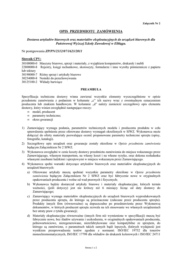 Załącznik Nr 2 OPIS PRZEDMIOTU ZAMÓWIENIA Dostawa artykułów biurowych oraz materiałów eksploatacyjnych do urządzeń biurowych dla Państwowej WyŜszej Szkoły Zawodowej w Elblągu. Nr postępowania ZP/PN/2312/07/1623/2011 Słownik CPV: 30100000-0 Maszyny biurowe, sprzęt i materiały, z wyjątkiem komputerów, drukarek i mebli 22800000-8 Rejestry, księgi rachunkowe, skoroszyty, formularze i inne wyroby piśmiennicze z papieru lub tektury 30190000-7 RóŜny sprzęt i artykuły biurowe 30234000-8 Nośniki do przechowywania 30125100-2 Wkłady barwiące PREAMBUŁA Specyfikacja techniczna dostawy winna zawierać wszystkie elementy wyszczególnione w opisie przedmiotu zamówienia z podaniem w kolumnie „c” ich nazwy wraz z ewentualnym oznaczeniem producenta lub znakiem handlowym. W kolumnie „d” naleŜy zamieścić szczegółowy opis elementu dostawy, który winien uwzględnić następujące rzeczy: • model, producent • parametry techniczne; • okres gwarancji 1) Zamawiający wymaga podania, parametrów technicznych modelu i producenta produktu w celu sprawdzenia spełnienia przez oferowane dostawy wymagań określonych w SIWZ. Wykonawca moŜe dołączyć do oferty materiały pozwalające ocenić proponowane parametry techniczne sprzętu (opisy, fotografie, katalogi). 2) Szczegółowy opis urządzeń oraz gwarancje zostały określone w Opisie przedmiotu zamówienia będącym Załącznikiem Nr 2 SIWZ. 3) Wykonawca uwzględni w cenie koszty dostawy przedmiotu zamówienia do miejsca wskazanego przez Zamawiającego, własnym transportem, na własny koszt i na własne ryzyko, oraz dokona rozładunku własnymi zasobami ludzkimi i sprzętowymi w miejscu wskazanym przez Zamawiającego. 4) Wykonawca spełni warunki dotyczące artykułów biurowych oraz materiałów eksploatacyjnych do urządzeń biurowych: a) Oferowane artykuły muszą spełniać wszystkie parametry określone w Opisie przedmiotu zamówienia będącym Załącznikiem Nr 2 SIWZ oraz być fabrycznie nowe w oryginalnych opakowaniach producenta i wolne od wad prawnych i fizycznych; b) Wykonawca będzie dostarczał artykuły biurowe i materiały eksploatacyjne, których termin waŜności, (jeśli dotyczy) jest nie krótszy niŜ 6 miesięcy licząc od daty dostawy do Zamawiającego; c) Zamawiający wymaga materiałów eksploatacyjnych do urządzeń biurowych wyprodukowanych przez producenta sprzętu, do którego są przeznaczone (zalecane przez producenta sprzętu). Produkty innych firm (równowaŜne) są dopuszczalne po przedstawieniu przez Wykonawcę dokumentów, w których producent sprzętu zezwala na ich stosowanie we własnych urządzeniach bez utraty praw z tytułu gwarancji; d) Materiały eksploatacyjne równowaŜne (innych firm niŜ wymienione w specyfikacji) muszą być fabrycznie nowe, bez śladów uŜywania i uszkodzenia, w oryginalnych opakowaniach producenta, pełnowartościowe, nieregenerowane, nierefabrykowane oraz kompatybilne ze sprzętem, do którego są zamówione, o parametrach takich samych bądź lepszych, (których wydajność jest wynikiem przeprowadzenia testów zgodnie z normami: ISO/IEC 19752 dla tonerów monochromomatycznych, ISO/IEC 17798 dla wkładów do drukarek kolorowych i ISO/IEC 24711 Strona 1 z 2 dla nabojów do drukarek atramentowych). Wszystkie elementy wchodzące w skład materiałów (np. kaseta, bęben światłoczuły, listwa podająca, listwa zbierająca, listwa czyszcząca, wałek grzewczy, wałek dociskowy, głowica drukująca, toner, atrament, tusz) muszą być fabrycznie nowe, nieregenerowane, nierefabrykowane, niewchodzące wcześniej (pierwotnie) w całości ani w części w skład innych materiałów (nieuŜywane). Muszą one posiadać znak firmowy producenta, etykiety zawierające numer katalogowy i termin jego waŜności. Wykonawca składając ofertę na produkty równowaŜne musi dołączyć stosowne certyfikaty/ dokumenty potwierdzające metodykę testowania wydajności materiałów eksploatacyjnych, oraz oświadczenie producenta, Ŝe oferowane produkty równowaŜne są wyrobami fabrycznie nowymi nie regenerowanymi w pełni kompatybilnymi ze sprzętem, do którego są przeznaczone o parametrach takich samych w stosunku do typu zamawianego produktu stanowiącego przedmiot zamówienia; e) Pod pojęciem fabrycznie nowe naleŜy rozumieć materiały eksploatacyjne, które w swoim całym procesie produkcyjnym (za wyjątkiem kartonowego opakowania) są wytwarzane z elementów wytworzonych od podstaw, bez uŜycia w jakikolwiek sposób komponentów uzyskanych z innych produktów wcześniej uŜytkowanych (w szczególności dotyczy to obudowy), wyprodukowane bez naruszenia praw własnościowych i patentowych ich właścicieli lub za ich zgodą. Ich stosowanie nie moŜe naruszać warunków gwarancji urządzeń. Wykonawca bierze na siebie pełną odpowiedzialność za uszkodzenia sprzętu spowodowane uŜywaniem zaoferowanych materiałów; f) JeŜeli w trakcie trwania umowy Zamawiający stwierdzi, iŜ wydajność, jakość lub niezawodność dostarczonych produktów niekorzystnie odbiega od parametrów produktu oryginalnego (pochodzącego od producenta urządzenia, do którego materiał jest przeznaczony) lub, jeŜeli produkt nie sygnalizuje we właściwy sposób stanu zuŜycia tuszu lub tonera, Wykonawca na Ŝądanie Zamawiającego winien materiał oferowany w asortymencie, którego Ŝądanie dotyczy, wymienić na materiał spełniający wymagania Zamawiającego (np. pochodzący od producenta, do którego materiał jest przeznaczony), bez zmiany ceny; g) Wykonawca zobowiązuję się do pokrycia kosztów naprawy drukarki, gdy jej uszkodzenie powstało w wyniku stosowania toneru lub tuszu równowaŜnego dostarczonego przez Wykonawcę. Za podstawę Ŝądania przez Zamawiającego naprawy drukarki (włączając w to wymianę bębna lub głowicy), uwaŜa się pisemna opinię autoryzowanego serwisu producenta drukarki w ciągu 3 dni od momentu zgłoszenia (faksem) Wykonawcy przez Zamawiaj