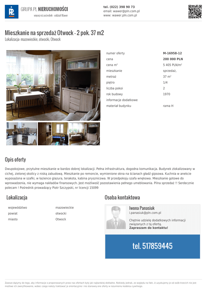 tel. (022) 398 90 73 email: [email protected] www: wawer.pln.com.pl Mieszkanie na sprzedaż Otwock - 2 pok. 37 m2 Lokalizacja: mazowieckie, otwocki, Otwock numer oferty M-16958-12 cena 200 000 PLN cena m 5 405 PLN/m2 mieszkanie sprzedaż, metraż 37 m2 piętro 1/4 liczba pokoi 2 rok budowy 1970 2 informacje dodatkowe materiał budynku rama H Opis oferty Dwupokojowe, przytulne mieszkanie w bardzo dobrej lokalizacji. Pełna infrastruktura, dogodna komunikacja. Budynek zlokalizowany w cichej, zielonej okolicy z niską zabudową. Mieszkanie po remoncie, wymienione okna na ścianach gładź gipsowa. Kuchnia w anekcie wyposażona w szafki, w łazience glazura, terakota, kabina prysznicowa. W przedpokoju szafa wnękowa. Mieszkanie gotowe do wprowadzenia, nie wymaga nakładów finansowych. Jest możliwość pozostawienia pełnego umeblowania. Pilna sprzedaż !! Serdecznie polecam ! Pośrednik prowadzący Piotr Szczypski, nr licencji 15099 Lokalizacja Osoba kontaktowa Iwona Panasiuk województwo mazowieckie powiat otwocki [email protected] miasto Otwock Chętnie udzielę dodatkowych informacji związanych z tą ofertą. Zapraszam do kontaktu! tel. 517859445 Zawsze dążymy do tego, aby informacje o proponowanych przez nas ofertach były jak najbardziej dokładne. Niekiedy jednak, ze względu na fakt, iż uzyskujemy je od osób trzecich nie jest możliwe ich zweryfikowanie, wobec czego należy traktować je orientacyjnie i nie stanowią one oferty w rozumieniu kodeksu cywilnego.