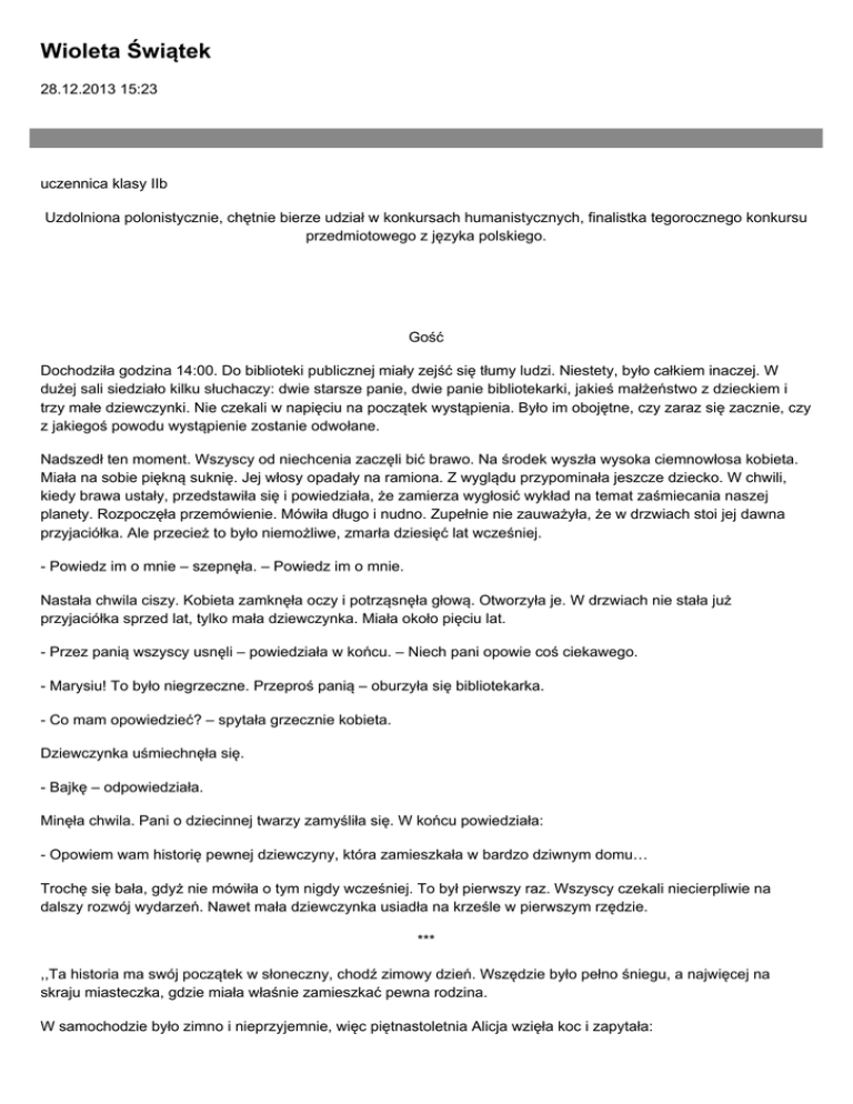 Wioleta Świątek 28.12.2013 15:23 uczennica klasy IIb Uzdolniona polonistycznie, chętnie bierze udział w konkursach humanistycznych, finalistka tegorocznego konkursu przedmiotowego z języka polskiego. Gość Dochodziła godzina 14:00. Do biblioteki publicznej miały zejść się tłumy ludzi. Niestety, było całkiem inaczej. W dużej sali siedziało kilku słuchaczy: dwie starsze panie, dwie panie bibliotekarki, jakieś małżeństwo z dzieckiem i trzy małe dziewczynki. Nie czekali w napięciu na początek wystąpienia. Było im obojętne, czy zaraz się zacznie, czy z jakiegoś powodu wystąpienie zostanie odwołane. Nadszedł ten moment. Wszyscy od niechcenia zaczęli bić brawo. Na środek wyszła wysoka ciemnowłosa kobieta. Miała na sobie piękną suknię. Jej włosy opadały na ramiona. Z wyglądu przypominała jeszcze dziecko. W chwili, kiedy brawa ustały, przedstawiła się i powiedziała, że zamierza wygłosić wykład na temat zaśmiecania naszej planety. Rozpoczęła przemówienie. Mówiła długo i nudno. Zupełnie nie zauważyła, że w drzwiach stoi jej dawna przyjaciółka. Ale przecież to było niemożliwe, zmarła dziesięć lat wcześniej. - Powiedz im o mnie – szepnęła. – Powiedz im o mnie. Nastała chwila ciszy. Kobieta zamknęła oczy i potrząsnęła głową. Otworzyła je. W drzwiach nie stała już przyjaciółka sprzed lat, tylko mała dziewczynka. Miała około pięciu lat. - Przez panią wszyscy usnęli – powiedziała w końcu. – Niech pani opowie coś ciekawego. - Marysiu! To było niegrzeczne. Przeproś panią – oburzyła się bibliotekarka. - Co mam opowiedzieć? – spytała grzecznie kobieta. Dziewczynka uśmiechnęła się. - Bajkę – odpowiedziała. Minęła chwila. Pani o dziecinnej twarzy zamyśliła się. W końcu powiedziała: - Opowiem wam historię pewnej dziewczyny, która zamieszkała w bardzo dziwnym domu… Trochę się bała, gdyż nie mówiła o tym nigdy wcześniej. To był pierwszy raz. Wszyscy czekali niecierpliwie na dalszy rozwój wydarzeń. Nawet mała dziewczynka usiadła na krześle w pierwszym rzędzie. *** ,,Ta historia ma swój początek w słoneczny, chodź zimowy dzień. Wszędzie było pełno śniegu, a najwięcej na skraju miasteczka, gdzie miała właśnie zamieszkać pewna rodzina. W samochodzie było zimno i nieprzyjemnie, więc piętnastoletnia Alicja wzięła koc i zapytała: - Mamo, kiedy będziemy na miejscu? - Niedługo córeczko – odpowiedział jej tata. – Mniej więcej o 9:00 ujrzymy nasz nowy dom. - O dziewiątej? Mamy dopiero pierwszą w nocy – powiedziała dziewczyna, po czym przykryła swojego brata i siebie kocem. Chciała zasnąć, ale nie wychodziło jej to. Wierciła się i kręciła. Po wielu próbach, około godziny 2:00 zamknęła oczy. Otworzyła je dopiero rano. Dojechali. Ich nowy dom był duży i niezbyt nowoczesny. Przed domem znajdował się ogród. Rosło w nim dużo kwiatków. Niestety, o tej porze roku przykryte były śniegiem. Alicja wzięła swoje rzeczy i poszła przodem. Weszła po schodkach. Trochę skrzypiały. Otworzyła drzwi i zajrzała do środka. Było tam całkiem przyjemnie, mimo że zewnętrzne ściany budynku nie przyciągały wzroku. Dziewczyna poszła do swojego pokoju, który znajdował się na górze. Rozpakowywała się aż do wieczora. Później zeszła na dół i pomogła mamie w przygotowaniu kolacji. Podeszła do szafki ze szklankami. Chciała wziąć jedną, lecz gdy przysunęła rękę, szklanka odsunęła się. Nie mogła jej złapać. Uznała to za dziwne, ale zignorowała niesamowite zjawisko. Później robiła to, co zwykle. Poszła się umyć, przebrała się w piżamę i położyła się spać. Kolejne dni mijały spokojnie. Alicja poznała nowych przyjaciół. Przyzwyczaiła się do nowego domu. Po raz pierwszy od dłuższego czasu czuła się szczęśliwa. Aż do dnia, kiedy zaczęły się dziać dziwne rzeczy, np. w nocy telewizor włączał się sam, naczynia spadały na podłogę, regał się przewracał, a okna się otwierały. Rodzice Alicji byli przekonani, że w domu oprócz nich ktoś jest. Dziewczyna postanowiła to sprawdzić. Pewnego dnia, gdy nikogo nie było, zrobiła kartkę, na której zapisała alfabet, przygotowała igłę i nitkę. Do jednego jej końca przymocowała igłę, a drugim końcem obwiązała sobie palec. Usiadła w pokoju na łóżku i wypowiedziała te słowa: - Jeśli są w tym domu inne istoty, proszę, by dały mi jakiś znak. Czekała przez chwilę. Nagle igła wskazywała ciąg liter, które ułożyły się w zdanie. Brzmiało ono tak: ,,Cześć, ja i moja rodzina mieszkamy w tym domu.” Alicja osłupiała, po chwili jednak otrząsnęła się. Chciała porozmawiać ze swoim nowym znajomym. - Cześć – powiedziała. – Kim jesteś? ,,Jestem duchem. Umarłem bardzo dawno temu, lecz moja dusza została tutaj.” - Jak się nazywasz? – spytała dziewczyna. W tej chwili przestała się już bać. ,,Konrad.” - Opowiedz mi o sobie – poprosiła Alicja. Dowiedziała się, że ten dom zamieszkują duchy. Nocny znajomy żył w latach dwudziestych XX w. Teraz miał już około stu lat. Mieszkał z rodzicami i z dwoma siostrami (młodszą i starszą) oraz bratem. Wszystko układało się dobrze, lecz pewnego dnia jakiś szaleniec z pistoletem znalazł się w pobliżu ich domu i zastrzelił wszystkich, po czym się powiesił. Rodzina Konrada nigdy nie opuściła swojego przytulnego domu. Alicja była pod wielkim wrażeniem, gdy usłyszała tę historię. Nigdy nie miała do czynienia z czymś tak niesamowitym. Ta rozmowa pozostała w jej pamięci do końca życia. Następne dni były cudowne. Dziewczyna zaprzyjaźniła się z Konradem. Powiedziała rodzinie o tajemnicy domu. Wszyscy postanowili, co może się wydać dziwne, rozmawiać z duchami. Alicja bawiła się po prostu świetnie. Godzinami rozmawiała z Konradem, który, mimo że był dużo starszy, doskonale ją rozumiał. Pewnego pochmurnego dni