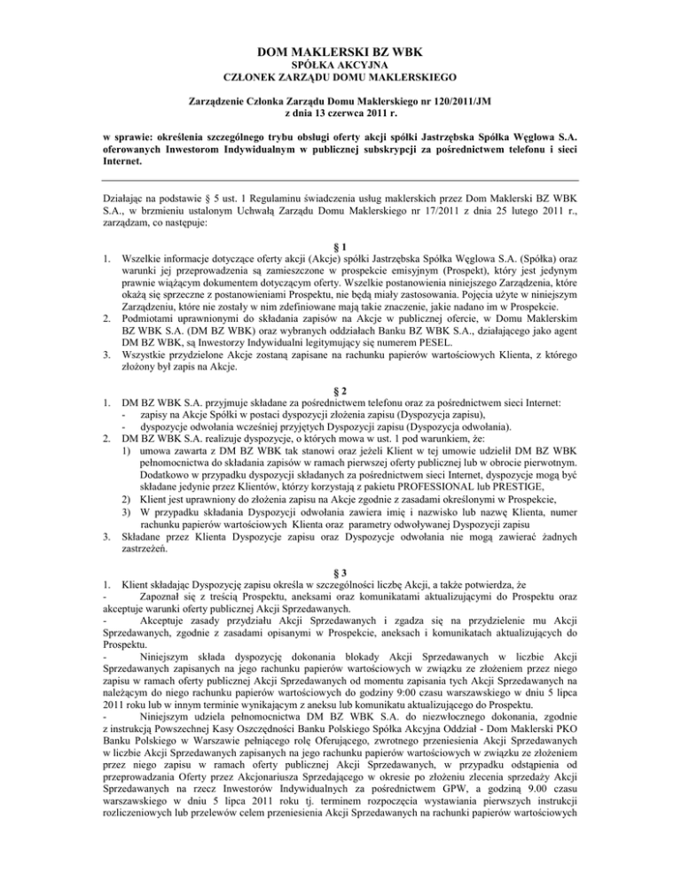 DOM MAKLERSKI BZ WBK SPÓŁKA AKCYJNA CZŁONEK ZARZĄDU DOMU MAKLERSKIEGO Zarządzenie Członka Zarządu Domu Maklerskiego nr 120/2011/JM z dnia 13 czerwca 2011 r. w sprawie: określenia szczególnego trybu obsługi oferty akcji spółki Jastrzębska Spółka Węglowa S.A. oferowanych Inwestorom Indywidualnym w publicznej subskrypcji za pośrednictwem telefonu i sieci Internet. Działając na podstawie § 5 ust. 1 Regulaminu świadczenia usług maklerskich przez Dom Maklerski BZ WBK S.A., w brzmieniu ustalonym Uchwałą Zarządu Domu Maklerskiego nr 17/2011 z dnia 25 lutego 2011 r., zarządzam, co następuje: 1. 2. 3. 1. 2. 3. §1 Wszelkie informacje dotyczące oferty akcji (Akcje) spółki Jastrzębska Spółka Węglowa S.A. (Spółka) oraz warunki jej przeprowadzenia są zamieszczone w prospekcie emisyjnym (Prospekt), który jest jedynym prawnie wiąŜącym dokumentem dotyczącym oferty. Wszelkie postanowienia niniejszego Zarządzenia, które okaŜą się sprzeczne z postanowieniami Prospektu, nie będą miały zastosowania. Pojęcia uŜyte w niniejszym Zarządzeniu, które nie zostały w nim zdefiniowane mają takie znaczenie, jakie nadano im w Prospekcie. Podmiotami uprawnionymi do składania zapisów na Akcje w publicznej ofercie, w Domu Maklerskim BZ WBK S.A. (DM BZ WBK) oraz wybranych oddziałach Banku BZ WBK S.A., działającego jako agent DM BZ WBK, są Inwestorzy Indywidualni legitymujący się numerem PESEL. Wszystkie przydzielone Akcje zostaną zapisane na rachunku papierów wartościowych Klienta, z którego złoŜony był zapis na Akcje. §2 DM BZ WBK S.A. przyjmuje składane za pośrednictwem telefonu oraz za pośrednictwem sieci Internet: - zapisy na Akcje Spółki w postaci dyspozycji złoŜenia zapisu (Dyspozycja zapisu), - dyspozycje odwołania wcześniej przyjętych Dyspozycji zapisu (Dyspozycja odwołania). DM BZ WBK S.A. realizuje dyspozycje, o których mowa w ust. 1 pod warunkiem, Ŝe: 1) umowa zawarta z DM BZ WBK tak stanowi oraz jeŜeli Klient w tej umowie udzielił DM BZ WBK pełnomocnictwa do składania zapisów w ramach pierwszej oferty publicznej lub w obrocie pierwotnym. Dodatkowo w przypadku dyspozycji składanych za pośrednictwem sieci Internet, dyspozycje mogą być składane jedynie przez Klientów, którzy korzystają z pakietu PROFESSIONAL lub PRESTIGE, 2) Klient jest uprawniony do złoŜenia zapisu na Akcje zgodnie z zasadami określonymi w Prospekcie, 3) W przypadku składania Dyspozycji odwołania zawiera imię i nazwisko lub nazwę Klienta, numer rachunku papierów wartościowych Klienta oraz parametry odwoływanej Dyspozycji zapisu Składane przez Klienta Dyspozycje zapisu oraz Dyspozycje odwołania nie mogą zawierać Ŝadnych zastrzeŜeń. §3 1. Klient składając Dyspozycję zapisu określa w szczególności liczbę Akcji, a takŜe potwierdza, Ŝe Zapoznał się z treścią Prospektu, aneksami oraz komunikatami aktualizującymi do Prospektu oraz akceptuje warunki oferty publicznej Akcji Sprzedawanych. Akceptuje zasady przydziału Akcji Sprzedawanych i zgadza się na przydzielenie mu Akcji Sprzedawanych, zgodnie z zasadami opisanymi w Prospekcie, aneksach i komunikatach aktualizujących do Prospektu. Niniejszym składa dyspozycję dokonania blokady Akcji Sprzedawanych w liczbie Akcji Sprzedawanych zapisanych na jego rachunku papierów wartościowych w związku ze złoŜeniem przez niego zapisu w ramach oferty publicznej Akcji Sprzedawanych od momentu zapisania tych Akcji Sprzedawanych na naleŜącym do niego rachunku papierów wartościowych do godziny 9:00 czasu warszawskiego w dniu 5 lipca 2011 roku lub w innym terminie wynikającym z aneksu lub komunikatu aktualizującego do Prospektu. Niniejszym udziela pełnomocnictwa DM BZ WBK S.A. do niezwłocznego dokonania, zgodnie z instrukcją Powszechnej Kasy Oszczędności Banku Polskiego Spółka Akcyjna Oddział - Dom Maklerski PKO Banku Polskiego w Warszawie pełniącego rolę Oferującego, zwrotnego przeniesienia Akcji Sprzedawanych w liczbie Akcji Sprzedawanych zapisanych na jego rachunku papierów wartościowych w związku ze złoŜeniem przez niego zapisu w ramach oferty publicznej Akcji Sprzedawanych, w przypadku odstąpienia od przeprowadzania Oferty przez Akcjonariusza Sprzedającego w okresie po złoŜeniu zlecenia sprzedaŜy Akcji Sprzedawanych na rzecz Inwestorów Indywidualnych za pośrednictwem GPW, a godziną 9.00 czasu warszawskiego w dniu 5 lipca 2011 roku tj. terminem rozpoczęcia wystawiania pierwszych instrukcji rozliczeniowych lub przelewów celem przeniesienia Akcji Sprzedawanych na rachunki papierów wartościowych Inwestorów Instytucjonalnych lub innym terminem wynikającym z aneksu lub komunikatu aktualizującego do Prospektu. WyraŜa zgodę na przetwarzanie danych osobowych w zakresie niezbędnym do przeprowadzenia oferty publicznej Akcji Sprzedawanych; przyjmuje do wiadomości, Ŝe przysługuje mu prawo wglądu do swoich danych osobowych oraz ich poprawiania oraz oświadcza, Ŝe dane na formularzu zapisu zostały podane przez niego dobrowolnie. WyraŜa zgodę na przekazywanie danych i informacji stanowiących tajemnicę zawodową oraz informacji związanych z dokonanym przez niego zapisem na Akcje Sprzedawane (w tym danych osobowych) Powszechnej Kasie Oszczędności Bankowi Polskiemu Spółka Akcyjna Oddział - Dom Maklerski PKO Banku Polskiego w Warszawie działającej w charakterze Oferującego, JSW oraz Giełdzie Papierów Wartościowych w Warszawie S.A. w zakresie niezbędnym do przeprowadzenia Oferty Akcji Sprzedawanych oraz upowaŜnia te podmioty do otrzymania i przetwarzania tych danych i informacji. UpowaŜnia firmę inwestycyjną, w której składa zapis do przekazywania Powszechnej Kasie Oszczędności Bankowi Polskiemu Spółka Akcyjna Oddział - Dom Maklerski PKO Banku Polskiego w Warszawie działającej w charakterze Oferującego oraz Skarbowi Państwa Rzeczypospolitej Polskiej informacji o złoŜonym przez niego zapisie na Akcje Sprzedawane oraz danych os