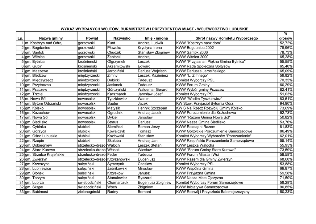 WYKAZ WYBRANYCH WÓJTÓW, BURMISTRZÓW I PREZYDENTÓW MIAST - WOJEWÓDZTWO LUBUSKIE Lp. 1 2 3 4 5 6 7 8 9 10 11 12 13 14 15 16 17 18 19 20 21 22 23 24 25 26 27 28 29 30 31 32 33 Nazwa gminy m. Kostrzyn nad Odrą gm. Bogdaniec gm. Santok gm. Witnica gm. Bytnica gm. Gubin gm. Maszewo gm. Bledzew gm. Międzyrzecz gm. Przytoczna gm. Pszczew gm. Trzciel m. Nowa Sól gm. Bytom Odrzański gm. Kolsko gm. Kożuchów gm. Nowa Sól gm. Siedlisko gm. Cybinka gm. Górzyca gm. Ośno Lubuskie gm. Rzepin gm. Dobiegniew gm. Stare Kurowo gm. Strzelce Krajeńskie gm. Zwierzyn gm. Krzeszyce gm. Lubniewice gm. Słońsk gm. Torzym gm. Lubrza gm. Skąpe gm. Babimost Powiat Nazwisko gorzowski Kunt gorzowski Pławska gorzowski Chudzik gorzowski Zabłocki krośnieński Olgrzymek krośnieński Aksamitowski krośnieński Jarociński międzyrzecki Zimny międzyrzecki Dubicki międzyrzecki Jasionek międzyrzecki Górczyński międzyrzecki Kaczmarek nowosolski Tyszkiewicz nowosolski Sauter nowosolski Matysik nowosolski Ogrodnik nowosolski Dykiel nowosolski Straus słubicki Siemiński słubicki Kowalczyk słubicki Kozłowski Skałuba słubicki strzelecko-drezdeWaloch strzelecko-drezdeWłasak strzelecko-drezdeFeder strzelecko-drezdeKrzyżanowski sulęciński Symeryak sulęciński Jaśnikowski sulęciński Krzyśków sulęciński Stanulewicz świebodziński Chamarczuk świebodziński Woch zielonogórski Radny Imię - imiona Andrzej Ludwik Krystyna Irena Stanisław Zbigniew Andrzej Leszek Edward Dariusz Wojciech Leszek, Kazimierz Tadeusz Tadeusz Waldemar Gerard Jarosław Józef Wadim Jacek Henryk Szczepan Andrzej Jacek Jarosław Dariusz Roman Jerzy Tomasz Stanisław Andrzej Jan Leszek Stefan Wiesław Tadeusz Eugeniusz Czesław Mirosław Janusz Ryszard Eugeniusz Zbigniew Zbigniew Bernard Skrót nazwy Komitetu Wyborczego KWW "Kostrzyn nasz dom" KWW Bogdaniec 2002 KWW Santok 2006 KWW Witnica 2000 KWW "Przyjazna i Piękna Gmina Bytnica" KWW Rada Społeczna Sołtysów KWW Dariusza Jarocińskiego KWW "L. Zimnego" Komitet Wyborczy PSL KWW Forum Gminy KWW Wybór gminy Pszczew Komitet Wyborczy PSL KWW "Wadim Tyszkiewicz" KW Stow. Przyjaciół Bytomia Odrz. KW S Na Rzecz Rozwoju Gminy Kolsko KWW Porozumienie dla Kożuchowa KWW "Razem Gmina Nowa Sól" KWW Nasza Gmina Siedlisko KWW Rozsądni Razem KWW Górzyckie Porozumienie Samorządowe Komitet Wyborczy Wyborców "Porozumienie" KWW Rzepińskie Porozumienie Samorządowe KWW Leszka Walocha KWW "Forum Gminy Stare Kurowo" KWW Forum Miasta i Wsi KWW Razem dla Gminy Zwierzyn Komitet Wyborczy PSL KWW Wspólna Gmina KWW Przyjazna Gmina KWW Nasza Mała Ojczyzna Komitet Wyborczy Forum Samorządowe KWW Inicjatywa Samorządowa KWW Rozwój i Przyszłość Babimojszczyzny % głosów 52,72% 78,96% 78,73% 65,28% 55,55% 65,40% 65,09% 59,82% 70,35% 60,29% 82,41% 51,03% 83,51% 94,90% 73,69% 52,73% 50,82% 53,76% 81,83% 86,49% 62,01% 55,14% 55,95% 73,59% 58,58% 68,60% 53,88% 69,87% 59,58% 71,50% 58,28% 90,85% 50,23% Lp. 34 35 36 37 38 39 40 41 42 43 44 45 46 47 48 49 50 51 52 Nazwa gminy gm. Czerwieńsk gm. Nowogród Bobrzański gm. Sulechów gm. Świdnica gm. Trzebiechów gm. Zabór gm. Zielona Góra gm. Brzeźnica gm. Niegosławice gm. Żagań m. Łęknica gm. Lipinki Łużyckie gm. Lubsko gm. Przewóz gm. Trzebiel gm. Żary gm. Sława gm. Szlichtyngowa m. Gorzów Wielkopolski Powiat zielonogórski zielonogórski zielonogórski zielonogórski zielonogórski zielonogórski zielonogórski żagański żagański żagański żarski żarski żarski żarski żarski żarski wschowski wschowski Nazwisko Iwanus Jankowski Odważny Jaskulski Drobek Bukowiecki Zalewski Adamowicz Szylińczuk Niesłuchowski Bieniasz Morżak Bakalarz Klisowski Olejniczak Dżyga Sadrakuła Wardecki Jędrzejczak Imię - imiona Piotr Grzegorz Ludwik Ignacy Adam Konstanty Stanisław Andrzej Mariusz Jerzy Marek Teodor Tomasz Jan Michał Bogdan Adam Ryszard Eugeniusz Jan Cezary Jan Wiesław Tadeusz Skrót nazwy Komitetu Wyborczego KWW Na Rzecz Gminy i Miasta Czerwieńsk KWW Wspólna Gmina Nowogród KWW Razem z Forum KWW Przymierze KWW Samorząd 2006 KWW Odnowa - Społeczeństwo Obywatelskie KWW Bezpartyjny KW Samoobrona RP KWW Nasza Gmina Dziś i Jutro KWW Nasza Gmina Żagań KW Platforma Obywatelska RP KWW Michała Morżaka KW Forum Samorządowe Powiatu Żarskiego KWW Gmina - Nasz Dom KWW "Olejniczak" KWW Jana Dżygi KWW Dobra Gmina KWW Przyjazna Gmina KWW Jędrzejczak % głosów 53,87% 63,18% 51,16% 66,30% 69,34% 83,88% 55,59% 52,24% 85,82% 80,26% 86,68% 72,75% 56,54% 89,29% 72,98% 72,45% 60,18% 58,97% 50,60%