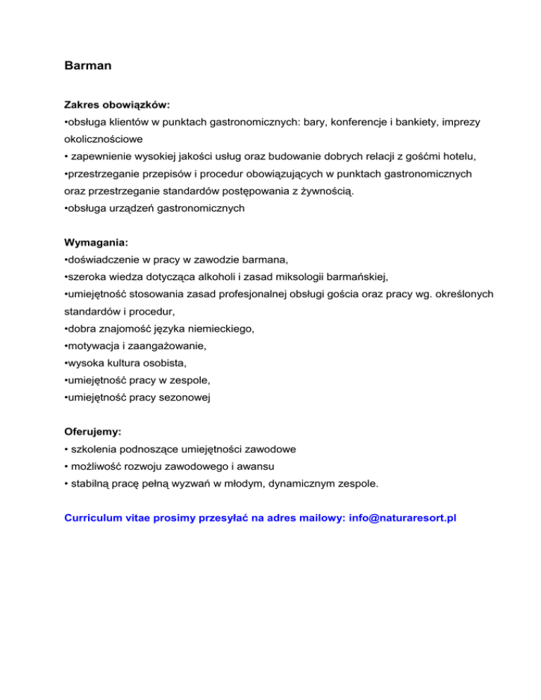Barman Zakres obowiązków: •obsługa klientów w punktach gastronomicznych: bary, konferencje i bankiety, imprezy okolicznościowe • zapewnienie wysokiej jakości usług oraz budowanie dobrych relacji z gośćmi hotelu, •przestrzeganie przepisów i procedur obowiązujących w punktach gastronomicznych oraz przestrzeganie standardów postępowania z żywnością. •obsługa urządzeń gastronomicznych Wymagania: •doświadczenie w pracy w zawodzie barmana, •szeroka wiedza dotycząca alkoholi i zasad miksologii barmańskiej, •umiejętność stosowania zasad profesjonalnej obsługi gościa oraz pracy wg. określonych standardów i procedur, •dobra znajomość języka niemieckiego, •motywacja i zaangażowanie, •wysoka kultura osobista, •umiejętność pracy w zespole, •umiejętność pracy sezonowej Oferujemy: • szkolenia podnoszące umiejętności zawodowe • możliwość rozwoju zawodowego i awansu • stabilną pracę pełną wyzwań w młodym, dynamicznym zespole. Curriculum vitae prosimy przesyłać na adres mailowy: [email protected]