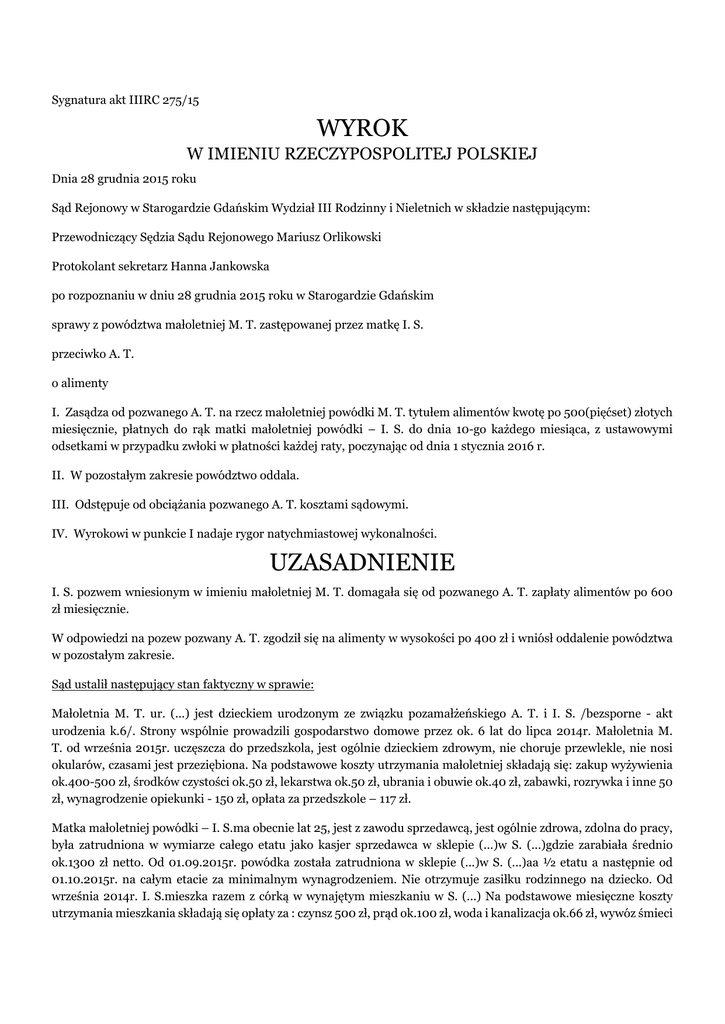 Sygnatura akt IIIRC 275/15 WYROK W IMIENIU RZECZYPOSPOLITEJ POLSKIEJ Dnia 28 grudnia 2015 roku Sąd Rejonowy w Starogardzie Gdańskim Wydział III Rodzinny i Nieletnich w składzie następującym: Przewodniczący Sędzia Sądu Rejonowego Mariusz Orlikowski Protokolant sekretarz Hanna Jankowska po rozpoznaniu w dniu 28 grudnia 2015 roku w Starogardzie Gdańskim sprawy z powództwa małoletniej M. T. zastępowanej przez matkę I. S. przeciwko A. T. o alimenty I. Zasądza od pozwanego A. T. na rzecz małoletniej powódki M. T. tytułem alimentów kwotę po 500(pięćset) złotych miesięcznie, płatnych do rąk matki małoletniej powódki – I. S. do dnia 10-go każdego miesiąca, z ustawowymi odsetkami w przypadku zwłoki w płatności każdej raty, poczynając od dnia 1 stycznia 2016 r. II. W pozostałym zakresie powództwo oddala. III. Odstępuje od obciążania pozwanego A. T. kosztami sądowymi. IV. Wyrokowi w punkcie I nadaje rygor natychmiastowej wykonalności. UZASADNIENIE I. S. pozwem wniesionym w imieniu małoletniej M. T. domagała się od pozwanego A. T. zapłaty alimentów po 600 zł miesięcznie. W odpowiedzi na pozew pozwany A. T. zgodził się na alimenty w wysokości po 400 zł i wniósł oddalenie powództwa w pozostałym zakresie. Sąd ustalił następujący stan faktyczny w sprawie: Małoletnia M. T. ur. (...) jest dzieckiem urodzonym ze związku pozamałżeńskiego A. T. i I. S. /bezsporne - akt urodzenia k.6/. Strony wspólnie prowadzili gospodarstwo domowe przez ok. 6 lat do lipca 2014r. Małoletnia M. T. od września 2015r. uczęszcza do przedszkola, jest ogólnie dzieckiem zdrowym, nie choruje przewlekle, nie nosi okularów, czasami jest przeziębiona. Na podstawowe koszty utrzymania małoletniej składają się: zakup wyżywienia ok.400-500 zł, środków czystości ok.50 zł, lekarstwa ok.50 zł, ubrania i obuwie ok.40 zł, zabawki, rozrywka i inne 50 zł, wynagrodzenie opiekunki - 150 zł, opłata za przedszkole – 117 zł. Matka małoletniej powódki – I. S.ma obecnie lat 25, jest z zawodu sprzedawcą, jest ogólnie zdrowa, zdolna do pracy, była zatrudniona w wymiarze całego etatu jako kasjer sprzedawca w sklepie (...)w S. (...)gdzie zarabiała średnio ok.1300 zł netto. Od 01.09.2015r. powódka została zatrudniona w sklepie (...)w S. (...)aa ½ etatu a następnie od 01.10.2015r. na całym etacie za minimalnym wynagrodzeniem. Nie otrzymuje zasiłku rodzinnego na dziecko. Od września 2014r. I. S.mieszka razem z córką w wynajętym mieszkaniu w S. (...) Na podstawowe miesięczne koszty utrzymania mieszkania składają się opłaty za : czynsz 500 zł, prąd ok.100 zł, woda i kanalizacja ok.66 zł, wywóz śmieci 27 zł, ogrzewanie 280 zł, abonament za cyfrowy polsat -40,65 zł, kredyt na zakup lodówki i kuchni – 103,95 zł /raty do czerwca 2016r/. Pozwany A. T.ma obecnie lat 29, skończył liceum ogólnokształcące, dodatkowo ukończył kurs na operatora wózka widłowego. Pozwany od 16.08.2010r. był zatrudniony w (...) SAna stanowisku magazyniera, gdzie zarabiał w granicach ok.3000-3400 zł netto , następnie od 02.10.2015r. był zatrudniony firmie (...)w N.k.K.jako magazynier, gdzie zarabiał w granicach ok.2000 - 2300 zł. Po rozwiązaniu umowy o pracę od 18.12.2015r. pozwany podjął pracę w sklepie (...)w S. (...)na stanowisku sprzedawca-opiekun działu na ¾ etatu za wynagrodzeniem 1750 zł brutto. Pozwany nie ma innych osób na utrzymaniu. Pozwany miał kontakt z córką ograniczony z uwagi na odległość od miejsca zamieszkania i czasami kupował jej prezenty, zapewniał rozrywkę. Od września 2014r. pozwany płaci dobrowolnie po 500 zł miesięcznie tytułem alimentów na córkę. Pozwany nie choruje przewlekle, jest zdolny do pracy, posiada samochód osobowy marki V. (...)rocznik 1990 oraz mieszkanie w S. (...)- kawalerkę o pow. 37,5 m2 /użycza siostrze nieodpłatnie/, innego majątku nie posiada. W okresie od 30.09.2015r. do 30.11.2015r. pozwany mieszkał w miejscowości N., gdzie wynajmował mieszkanie /miesięczne opłaty wynosiły ok.600-650 zł/. Obecnie pozwany mieszka w S. (...) z rodzicami, nie uczestniczy w kosztach utrzymania mieszkania. Dziecko zabiera do siebie co drugi weekend. Pozwany ponosi opłaty z tytułu: utrzymania samochodu - ok.400 zł, abonament za telefon komórkowy – 55 zł, abonament RTV – 20 zł, wyżywienie – ok. 600 zł, środki czystości – ok.50 zł, zakup ubrań – 50 zł, lekarstw – 15 zł, raty kredytu hipotetycznego na zakup mieszkania -w G.350 zł /spłaca go siostra pozwanego/, raty kredytu w A.-100 zł /raty do grudnia 2015r./, kredyt na zakup laptopa i telewizor -102 zł /raty do marca 2016r./. /dowód: zeznania I. S. k.56,84 zeznania A. T. k.57,85 zaświadczenie o zarobkach powódki k.5,34 aneks do umowy o pracę powódki k.32, umowa o pracę powódki k.33, lista płac pozwanego k.16, zaświadczenia o zatrudnieniu pozwanego k.54,55, umowa o prace pozwanego k.74, zestawienie wydatków powódki k.33-35, rachunki na potwierdzenie wydatków powódki k.35-51, 73-81,82, rachunki i inne dokumenty na potwierdzenie wydatków pozwanego k.16— 26,52-53 / Sąd zważył, co następuje: Sąd ustalając stan faktyczny w sprawie oparł się w głównej mierze na dokumentach załączonych do akt niniejszej sprawy oraz zeznaniach i oświadczeniach stron, które należało uznać za wiarygodne w takim zakresie w jakim korespondują z pozostałym materiałem zebranym w sprawie i nie są sprzeczne z zasadami logiki i doświadczenia życiowego. Ponieważ strony nie wykazały w całości swoich miesięcznych kosztów utrzymania Sąd na zasadzie doświadczenia życiowego przyjął przeciętne koszty utrzymania. Na podstawie art.133§1 ustawy z dnia 25 lutego 1964 r. Kodeks rodzinny i opiekuńczy rodzice obowiązani są do świadczeń alimentacyjnych względem dziecka, które nie jest jeszcze w stanie utrzymać się samodzielnie, chyba że dochody z majątku dziecka wystarczają na pokrycie kosztów jego
