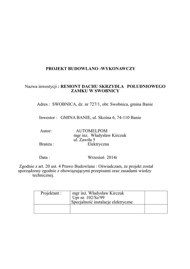 PROJEKT BUDOWLANO -WYKONAWCZY Nazwa inwestycji : REMONT DACHU SKRZYDLA POŁUDNIOWEGO ZAMKU W SWOBNICY Adres : SWOBNICA, dz. nr 727/1, obr. Swobnica, gmina Banie Inwestor : GMINA BANIE, ul. Skośna 6, 74-110 Banie Autor: Branża : Data : AUTOMELPOM mgr inz. Władysław Kirczuk ul. Zawiła 5 Elektryczna Wrzesień 2014r Zgodnie z art. 20 ust. 4 Prawo Budowlane : Oświadczam, że projekt został sporządzony zgodnie z obowiązującymi przepisami oraz zasadami wiedzy technicznej. Projektant : mgr inż. Władysław Kirczuk Upr nr. 102/Sz/99 Specjalność instalacje elektryczne 2. Spis treści 1 Strona tytułowa 2 Spis treści 3 Rysunki 4 Założenia 4.1. Podstawa prawna 4.2. Podstawa techniczna 4.3. Przedmiot i zakres opracowania 5 Charakterystyka budynku 5.1. Charakterystyka budynku istniejącego 6 Instalacja odgromowa budynku 6.1. Zwody poziome 6.2. Przewody odprowadzające 6.3. Przewody uziemiające 6.4. Uziomy 6.5. Zabezpieczenia antykorozyjne 7 Obliczenia 8 Uprawnienia budowlane 3. Rysunki 1. Plan sytuacyjny - skala 1: 500 2. Rzut dachu - instalacja odgromowa - skala 1: 100 4 Założenia 4.1. Podstawa prawna Praca została wykonana na podstawie zlecenia Gminy Banie 4.2. Podstawa techniczna - ocena budynku w zakresie: - instalacji odgromowej, - inwentaryzacja architektoniczna elewacji budynku, - informacje uzyskane od przedstawiciela administracyjnego, - ustawa o ochronie przeciwpożarowej z dnia 24,08,1991r. (Dz. U. Nr 81 poz. 351) - Rozporządzenie Ministra Gospodarki Przestrzennej i Budownictwa z dnia 14 grudnia 1994r. W sprawie warunków technicznych, jakim powinny odpowiadać budynki i ich usytuowanie (Dz. U. Nr 10/1995, poz. 46) - Rozporządzenie Ministra Spraw Wewnętrznych z dnia 3 listopada 1992r. W sprawie ochrony przeciwpożarowej budynków, innych obiektów budowlanych i terenów (Dz. U. Nr 92, poz. 460, Dz. U. Nr 102, poz. 507). - PN-86/E-05003/01 Ochrona odgromowa obiektów budowlanych. Wymagania ogólne - PN-92/E-05003/04 Ochrona odgromowa obiektów budowlanych. Ochrona specjalna - PN-IEC 61024-1 Ochrona odgromowa obiektów budowlanych. Zasady ogólne - PN-IEC 21024-1-1 Ochrona odgromowa obiektów budowlanych. Zasady ogólne. Wybór poziomów ochrony dla urządzeń piorunochronnych. - PN-IEC 61024-1-2 Ochrona odgromowa obiektów budowlanych. Część 1-2: Zasady ogólne. Przewodnik B – Projektowanie, montaż, konserwacja i sprawdzanie urządzeń piorunochronnych 4.3. Przedmiot i zakres opracowania Przedmiotem niniejszego opracowania odgromowej na budynku Zamku jest Projekt Wykonawczy instalacji 5. Charakterystyka budynku Projekt Wykonawczy obejmuje budynek wykonanie instalacji ochrony odgromowej Zamku w Swobnicy . 5.1. Charakterystyka budynku istniejącego. Budynek przyległy do części wschodniej zamku, 2-kondygnacyjny, częściowo podpiwniczony. Budynek murowany, stropy drewniane, dach więźba dachowa drewniana, dachówka ceramiczna karpiówka. Schody wewnętrzne drewniane. Budynek przewidziany jest do kapitalnego remontu . W chwili obecnej należy wykonać kapitalny remont wszystkich konstrukcji budowlanych i wykonać dach oraz wykonać instalację ochrony odgromowej. Dlatego też należy zamontować nową, wg niniejszego projektu wykonawczego. Kryteria stosowania ochrony odgromowej określono w normie PN-86/E-05003/01. 6. Instalacja odgromowa budynku Na budynku Zamku będącym przedmiotem projektu instalacji piorunochronnej zostanie wykonany nowy dach wraz z jego pokryciem (wykonane zostanie pokrycie gąsiorami ceramicznymi oraz roboty związane z obróbką blacharską). Z przeprowadzonych obliczeń wynika, że urządzenia piorunochronie powinny zostać zainstalowane na budynku, ponieważ Nd > Ne (w dalszej treści zostaną podane nazwy tych oznaczeń zgodnych z przedmiotową normą). Na tego typu dachu projektuje się instalację piorunochronną za pomocą zwodów pionowych wykonanych drutem FeZn Φ 8 prowadzonym na uchwytach gąsiorkowych i dachówkowych na kominach z zastosowaniem uchwytów uniwersalnych. Elementy metalowe będące częścią dachu zostaną połączone ze zwodami poziomymi za pomocą specjalnych uchwytów. Przewody odprowadzające wykonane zostaną również z drutu FeZn Φ 8 i ułożone po ścianach budynku. Instalacja ochrony odgromowej wykonać zgodnie z niniejszym projektem . Od złącz kontrolnego do uziomu ułożyć przewód uziemiający jako taśma FeZn 25 x 4 mm i przyłączony do uziomu pionowego. Uziom poziomy wykonać w odległości minimum 1.0 m od fundamentów budynku, na głębokości 0.8 m od powierzchni ziemi. 6.1. Zwody poziome Zwody poziome zgodnie z wymaganiami przedmiotowej normy powinny posiadać najmniejszy wymiar dla stali ocynkowanej 50 mm2 co odpowiada drutowi Φ 8mm. Remontowany dach budynku Zamku zostanie pokryty dachówką ceramiczną trudno zapalną. Zwody poziome prowadzone będą na uchwytach gąsiorkowych na grzbiecie dachu oraz wzdłuż kalenicy dachu. Za pomocą uchwytów dachówkowych na pozostałych połaciach dachu. Na kominach zwód poziomy prowadzony będzie za pomocą uchwytów uniwersalnych w odległości ok. 10 cm od powierzchni. Wszystkie elementy metalowe znajdujące się na powierzchni lub nad powierzchnią dachu należy połączyć za pomocą specjalnych zacisków z najbliższym zwodem lub przewodem odprowadzającym, dotyczy to rynien biegnących przy dolnej krawędzi dachu, rynien spustowych, barier, ram okiennych metalowych, pokryć metalowych itp. Przewody zwodów poziomych należy łączyć ze sobą za pomocą złącz krzyżowych lub przelotowych. 6.2. Przewody odprowadzające Przewody odprowadzające wykonane z drutu FeZn Φ 8 mm prowadzone nad krawędziami szczytowymi przeciwległych narożników po ścianach budynku w ilości 2 sztuk. Przewody odprowadzające należy wykonać od zwodów poziomych do złącza kontrolnego umieszczonego na ścianie budynku na wysokości do 1.8 m od powierzchni ziemi. 6.3. Przewody uziemiające Przewody uziemiające należy wykonać za pomocą taśmy FeZn 25x4 mm od
