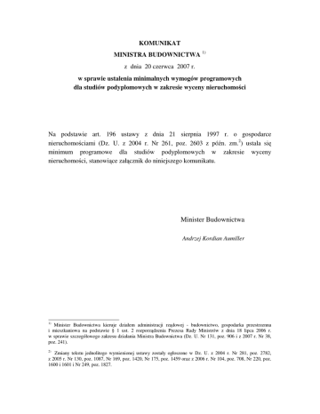 KOMUNIKAT MINISTRA BUDOWNICTWA 1) z dnia 20 czerwca 2007 r. w sprawie ustalenia minimalnych wymogów programowych dla studiów podyplomowych w zakresie wyceny nieruchomo ci Na podstawie art. 196 ustawy z dnia 21 sierpnia 1997 r. o gospodarce nieruchomo ciami (Dz. U. z 2004 r. Nr 261, poz. 2603 z pó n. zm.2) ustala si minimum programowe dla studiów podyplomowych w zakresie wyceny nieruchomo ci, stanowi ce zał cznik do niniejszego komunikatu. Minister Budownictwa Andrzej Kordian Aumiller 1) Minister Budownictwa kieruje działem administracji rz dowej - budownictwo, gospodarka przestrzenna i mieszkaniowa na podstawie § 1 ust. 2 rozporz dzenia Prezesa Rady Ministrów z dnia 18 lipca 2006 r. w sprawie szczegółowego zakresu działania Ministra Budownictwa (Dz. U. Nr 131, poz. 906 i z 2007 r. Nr 38, poz. 241). 2) Zmiany tekstu jednolitego wymienionej ustawy zostały ogłoszone w Dz. U. z 2004 r. Nr 281, poz. 2782, z 2005 r. Nr 130, poz. 1087, Nr 169, poz. 1420, Nr 175, poz. 1459 oraz z 2006 r. Nr 104, poz. 708, Nr 220, poz. 1600 i 1601 i Nr 249, poz. 1827. Zał cznik do Komunikatu Ministra Budownictwa z dnia 20 czerwca 2007 r. (Dz. Urz. MB Nr 3, poz. 16) Minimum programowe dla studiów podyplomowych w zakresie wyceny nieruchomo ci Program ogólny Lp. bloku I II III IV V VI Lp. grupy tematycznej Tematyka wykładów – grupy tematyczne Podstawy wiedzy z zakresu prawa 1 2 3 4 5 6 7 8 9 1 2 3 4 5 6 7 Poj cia i definicje dotycz ce nieruchomo ci Stosunki cywilno-prawne Własno i inne prawa rzeczowe. Formy władania nieruchomo ciami Podstawy prawa i post powania administracyjnego Gospodarka nieruchomo ciami Gospodarka mieszkaniowa i prawo spółdzielcze Podstawowe informacje z zakresu ochrony danych osobowych Zamówienia publiczne Zasady nabywania nieruchomo ci przez cudzoziemców Podstawy wiedzy z zakresu ekonomii, finansów i rachunkowo ci Podstawy ekonomii Nieruchomo jako dobro ekonomiczne Rynek nieruchomo ci Warto jako kategoria obiektywna i subiektywna Elementy finansów i bankowo ci Elementy rachunkowo ci Ocena ekonomicznej efektywno ci inwestycji Podstawy wiedzy technicznej 1 2 1 2 1 2 3 Podstawy budownictwa Podstawy kosztorysowania Podstawy wiedzy z zakresu gospodarki przestrzennej, rolnictwa, le nictwa i gospodarki wodnej Gospodarka przestrzenna Podstawy rolnictwa, le nictwa i gospodarki wodnej Podstawy wiedzy z zakresu matematyki, statystyki i ekonometrii Podstawy matematyki finansowej Podstawy statystyki i ekonometrii Metody masowej wyceny Rzeczoznawstwo jako zawód - Podstawowe wiadomo ci z zakresu rzeczoznawstwa maj tkowego Liczba godz. 42 6 6 6 4 10 4 2 2 2 37 8 5 6 4 4 4 6 23 16 7 11 5 6 17 6 6 5 6 VII 96 Teoria i praktyka wyceny nieruchomo ci 1 2 3 4 5 6 7 8 9 10 VIII Podej cia, metody i techniki wyceny nieruchomo ci w Polsce ródła informacji o nieruchomo ciach Wycena nieruchomo ci zurbanizowanych - przykłady Wycena ograniczonych praw rzeczowych i zobowi zaniowych - przykłady Wycena gruntów rolnych, upraw sadowniczych i ro lin ozdobnych oraz gruntów pod wodami Wycena nieruchomo ci le nych, zadrzewionych i zakrzewionych Wycena nieruchomo ci dla celów szczególnych i wycena nieruchomo ci specjalnych Wycena maszyn i urz dze Wycena nieruchomo ci w wybranych krajach Zasady sporz dzania operatu szacunkowego Zagadnienia uzupełniaj ce 1 2 3 IX Wycena podmiotów gospodarczych Doradztwo na rynku nieruchomo ci Funkcjonowanie rynków nieruchomo ci w wybranych pa stwach członkowskich Unii Europejskiej Razem Ogółem Program szczegółowy I. Podstawy wiedzy z zakresu prawa 1. 2. 6 12 4 4 4 15 8 Sztuka argumentacji Wybrane zagadnienia dotycz ce po rednictwa w obrocie nieruchomo ciami i zarz dzania nieruchomo ciami Seminaria dyplomowe i egzamin X 8 10 8 8 8 4 3 Umiej tno ci interdyscyplinarne 1 2 32 Poj cia i definicje dotycz ce nieruchomo ci (6 godz.) 1.1. Mienie jako kategoria prawa cywilnego 1.2. Nieruchomo jako składnik mienia 1.2.1. Definicje nieruchomo ci 1.2.2. Rodzaje nieruchomo ci – podział według kryterium podmiotowego i przedmiotowego Stosunki cywilno-prawne (6 godz.) 2.1. Osoby fizyczne – zdolno prawna i zdolno do czynno ci prawnych 2.2. Osoby prawne 2.2.1. Poj cie osoby prawnej 2.2.2. Rodzaje osób prawnych 2.2.3. Rejestry osób prawnych 2.3. Jednostki organizacyjne nieposiadaj ce osobowo ci prawnej 2.3.1. Rodzaje jednostek organizacyjnych nieposiadaj cych osobowo ci prawnej 2.3.2. Sposoby tworzenia jednostek nieposiadaj cych osobowo ci prawnej 4 4 255 25 280 2.3.3. Uprawnienia jednostek nieposiadajacych osobowo ci prawnej w zakresie gospodarki nieruchomo ciami 2.4. Czynno ci prawne 2.4.1. Zasada swobody zawierania umów 2.4.2. Rodzaje umów 2.4.3. O wiadczenia woli 2.4.4. Wady o wiadczenia woli, skutki niewa no ci o wiadcze 2.5. Reprezentacja uczestników obrotu cywilno-prawnego 2.5.1. Przedstawicielstwo 2.5.2. Pełnomocnictwo 2.5.3. Obrót nieruchomo ciami przez osoby nieposiadaj ce pełnej zdolno ci do czynno ci prawnych 2.6. Sposoby rozporz dzania prawami do nieruchomo ci – forma i tre 2.6.1. Sprzeda 2.6.2. Zamiana 2.6.3. Najem i dzier awa 2.6.4. U yczenie 2.6.5. Darowizna 2.6.6. Dziedziczenie oraz wybrane zagadnienia prawa spadkowego 2.7. Wybrane zagadnienia prawa rodzinnego i opieku czego 2.8. Zasady reprezentowania Skarbu Pa stwa i jednostek samorz du terytorialnego w post powaniu cywilnym 3. Własno i inne prawa rzeczowe. Formy władania nieruchomo ciami (6 godz.) 3.1. Konstytucyjne gwarancje ochrony własno ci 3.2. Własno 3.3. Współwłasno 3.4. U ytkowanie wieczyste 3.5. Ograniczone prawa rzeczowe: u ytkowanie, słu ebno , zastaw, spółdzielcze własno ciowe prawa do lokalu, hipoteka 3.6. Posiadanie 4. Podstawy prawa i post powania administracyjnego (4 godz.) 4.1. Zasady ogólne prawa administracyjnego 4.2. Struktura i kompetencje organów administracji publicznej 4.3. Post powanie administracyjne – organy i ich wła ciwo miejscowa i rzeczowa 4.4. Strony post powania administracyjnego i ich pełnomocnicy 4.5. Decyzje i postanowienia 4.6. Odwołania 