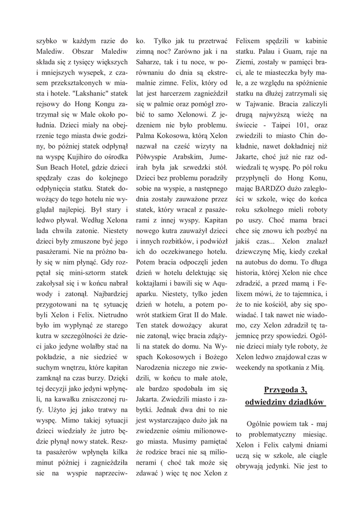 szybko w każdym razie do Malediw. Obszar Malediw składa się z tysięcy większych i mniejszych wysepek, z czasem przekształconych w miasta i hotele. "Lakshanic" statek rejsowy do Hong Kongu zatrzymał się w Male około południa. Dzieci miały na obejrzenie tego miasta dwie godziny, bo później statek odpłynął na wyspę Kujihiro do ośrodka Sun Beach Hotel, gdzie dzieci spędzały czas do kolejnego odpłynięcia statku. Statek dowożący do tego hotelu nie wyglądał najlepiej. Był stary i ledwo pływał. Według Xelona lada chwila zatonie. Niestety dzieci były zmuszone być jego pasażerami. Nie na próżno bały się w nim płynąć. Gdy rozpętał się mini-sztorm statek zakołysał się i w końcu nabrał wody i zatonął. Najbardziej przygotowani na tę sytuację byli Xelon i Felix. Nietrudno było im wypłynąć ze starego kutra w szczególności że dzieci jako jedyne wolałby stać na pokładzie, a nie siedzieć w suchym wnętrzu, które kapitan zamknął na czas burzy. Dzięki tej decyzji jako jedyni wpłynęli, na kawałku zniszczonej rufy. Użyto jej jako tratwy na wyspę. Mimo takiej sytuacji dzieci wiedziały że jutro będzie płynął nowy statek. Reszta pasażerów wpłynęła kilka minut później i zagnieździła sie na wyspie naprzeciw- ko. Tylko jak tu przetrwać zimną noc? Zarówno jak i na Saharze, tak i tu noce, w porównaniu do dnia są ekstremalnie zimne. Felix, który od lat jest harcerzem zagnieździł się w palmie oraz pomógł zrobić to samo Xelonowi. Z jedzeniem nie było problemu. Palma Kokosowa, którą Xelon nazwał na cześć wizyty na Półwyspie Arabskim, Jumeirah była jak szwedzki stół. Dzieci bez problemu poradziły sobie na wyspie, a następnego dnia zostały zauważone przez statek, który wracał z pasażerami z innej wyspy. Kapitan nowego kutra zauważył dzieci i innych rozbitków, i podwiózł ich do oczekiwanego hotelu. Potem bracia odpoczęli jeden dzień w hotelu delektując się koktajlami i bawili się w Aquaparku. Niestety, tylko jeden dzień w hotelu, a potem powrót statkiem Grat II do Male. Ten statek dowożący akurat nie zatonął, więc bracia zdążyli na statek do domu. Na Wyspach Kokosowych i Bożego Narodzenia niczego nie zwiedzili, w końcu to małe atole, ale bardzo spodobała im się Jakarta. Zwiedzili miasto i zabytki. Jednak dwa dni to nie jest wystarczająco dużo jak na zwiedzenie ośmiu milionowego miasta. Musimy pamiętać że rodzice braci nie są milionerami ( choć tak może się zdawać ) więc tę noc Xelon z Felixem spędzili w kabinie statku. Palau i Guam, raje na Ziemi, zostały w pamięci braci, ale te miasteczka były małe, a ze względu na spóźnienie statku na dłużej zatrzymali się w Tajwanie. Bracia zaliczyli drugą najwyższą wieżę na świecie - Taipei 101, oraz zwiedzili to miasto Chin dokładnie, nawet dokładniej niż Jakarte, choć już nie raz odwiedzali tę wyspę. Po pól roku przypłynęli do Hong Konu, mając BARDZO dużo zaległości w szkole, więc do końca roku szkolnego mieli roboty po uszy. Choć mama braci chce się znowu ich pozbyć na jakiś czas... Xelon znalazł dziewczynę Mię, kiedy czekał na autobus do domu. To długa historia, której Xelon nie chce zdradzić, a przed mamą i Felixem mówi, że to tajemnica, i że to nie kościół, aby się spowiadać. I tak nawet nie wiadomo, czy Xelon zdradził tę tajemnicę przy spowiedzi. Ogólnie dzieci miały tyle roboty, że Xelon ledwo znajdował czas w weekendy na spotkania z Mią. Przygoda 3, odwiedziny dziadków Ogólnie powiem tak - maj to problematyczny miesiąc. Xelon i Felix całymi dniami uczą się w szkole, ale ciągle obrywają jedynki. Nie jest to