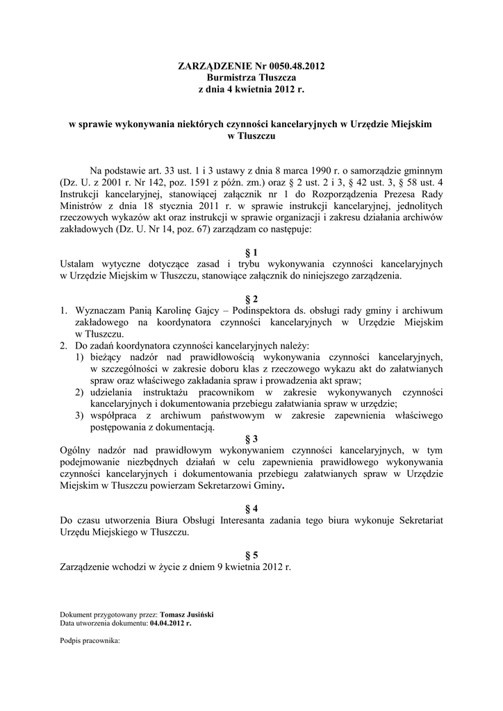 ZARZĄDZENIE Nr 0050.48.2012 Burmistrza Tłuszcza