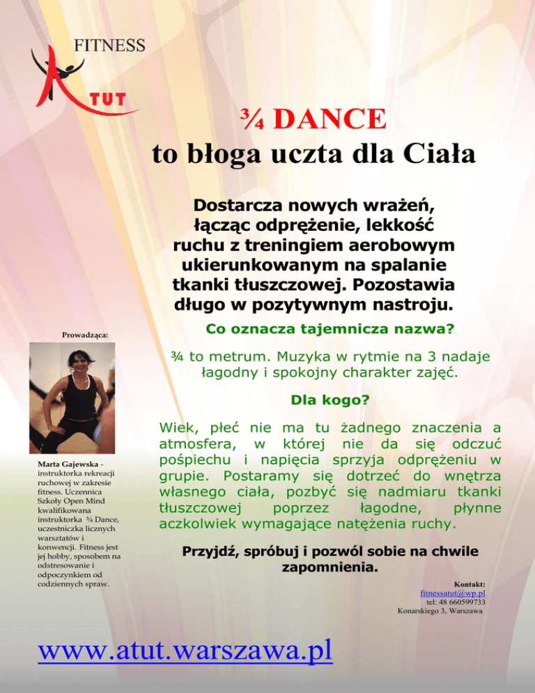 ¾ DANCE to błoga uczta dla Ciała Dostarcza nowych wrażeń, łącząc odprężenie, lekkość ruchu z treningiem aerobowym ukierunkowanym na spalanie tkanki tłuszczowej. Pozostawia długo w pozytywnym nastroju. Prowadząca: Co oznacza tajemnicza nazwa? ¾ to metrum. Muzyka w rytmie na 3 nadaje łagodny i spokojny charakter zajęć. Dla kogo? Marta Gajewska instruktorka rekreacji ruchowej w zakresie fitness. Uczennica Szkoły Open Mind kwalifikowana instruktorka ¾ Dance, uczestniczka licznych warsztatów i konwencji. Fitness jest jej hobby, sposobem na odstresowanie i odpoczynkiem od codziennych spraw. Wiek, płeć nie ma tu żadnego znaczenia a atmosfera, w której nie da się odczuć pośpiechu i napięcia sprzyja odprężeniu w grupie. Postaramy się dotrzeć do wnętrza własnego ciała, pozbyć się nadmiaru tkanki tłuszczowej poprzez łagodne, płynne aczkolwiek wymagające natężenia ruchy. Przyjdź, spróbuj i pozwól sobie na chwile zapomnienia. Kontakt: Poniedziałek godz. 18:00 [email protected] tel: 48 660599733 Konarskiego 3, Warszawa www.atut.warszawa.pl
