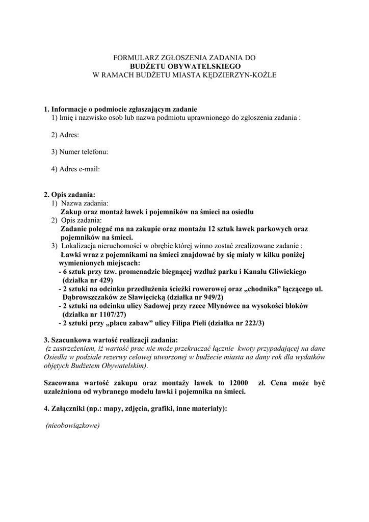 FORMULARZ ZGŁOSZENIA ZADANIA DO BUDŻETU OBYWATELSKIEGO W RAMACH BUDŻETU MIASTA KĘDZIERZYN-KOŹLE 1. Informacje o podmiocie zgłaszającym zadanie 1) Imię i nazwisko osob lub nazwa podmiotu uprawnionego do zgłoszenia zadania : Rada Osiedla Sławięcice 2) Adres: ul. Batorego 32, 47-230 Kędzierzyn-Koźle 3) Numer telefonu: 601956084 4) Adres e-mail: [email protected] 2. Opis zadania: 1) Nazwa zadania: Zakup oraz montaż ławek i pojemników na śmieci na osiedlu 2) Opis zadania: Zadanie polegać ma na zakupie oraz montażu 12 sztuk ławek parkowych oraz pojemników na śmieci. 3) Lokalizacja nieruchomości w obrębie której winno zostać zrealizowane zadanie : Ławki wraz z pojemnikami na śmieci znajdować by się miały w kilku poniżej wymienionych miejscach: - 6 sztuk przy tzw. promenadzie biegnącej wzdłuż parku i Kanału Gliwickiego (działka nr 429) - 2 sztuki na odcinku przedłużenia ścieżki rowerowej oraz „chodnika” łączącego ul. Dąbrowszczaków ze Sławięcicką (działka nr 949/2) - 2 sztuki na odcinku ulicy Sadowej przy rzece Młynówce na wysokości bloków (działka nr 1107/27) - 2 sztuki przy „placu zabaw” ulicy Filipa Pieli (działka nr 222/3) 3. Szacunkowa wartość realizacji zadania: (z zastrzeżeniem, iż wartość prac nie może przekraczać łącznie kwoty przypadającej na dane Osiedla w podziale rezerwy celowej utworzonej w budżecie miasta na dany rok dla wydatków objętych Budżetem Obywatelskim). Szacowana wartość zakupu oraz montaży ławek to 12000 uzależniona od wybranego modelu ławki i pojemnika na śmieci. 4. Załączniki (np.: mapy, zdjęcia, grafiki, inne materiały): (nieobowiązkowe) zł. Cena może być