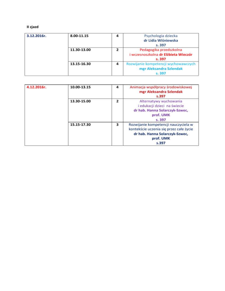 II zjazd 3.12.2016r. 4.12.2016r. 8.00-11.15 4 11.30-13.00 2 13.15-16.30 4 10.00-13.15 4 13.30-15.00 2 15.15-17.30 3 Psychologia dziecka dr Lidia Wiśniewska s. 397 Pedagogika przedszkolna i wczesnoszkolna dr Elżbieta Wieczór s. 397 Rozwijanie kompetencji wychowawczych mgr Aleksandra Szlendak s. 397 Animacja współpracy środowiskowej mgr Aleksandra Szlendak s.397 Alternatywy wychowania i edukacji dzieci na świecie dr hab. Hanna Solarczyk-Szwec, prof. UMK s. 397 Rozwijanie kompetencji nauczyciela w kontekście uczenia się przez całe życie dr hab. Hanna Solarczyk-Szwec, prof. UMK s.397