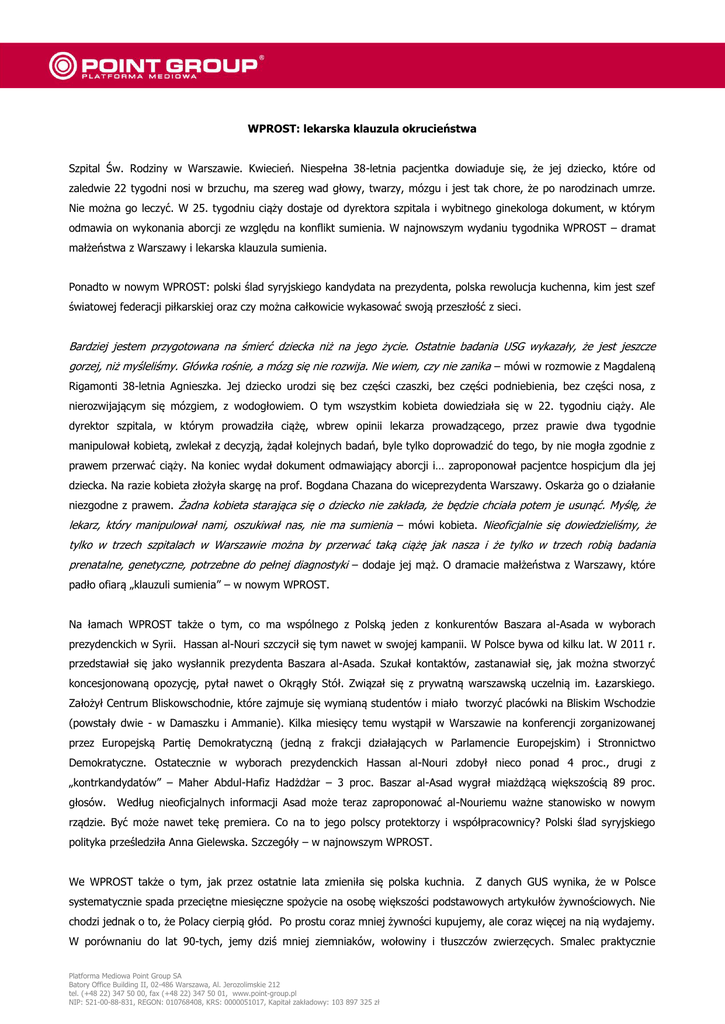 WPROST: lekarska klauzula okrucieństwa Szpital Św. Rodziny w Warszawie. Kwiecień. Niespełna 38-letnia pacjentka dowiaduje się, że jej dziecko, które od zaledwie 22 tygodni nosi w brzuchu, ma szereg wad głowy, twarzy, mózgu i jest tak chore, że po narodzinach umrze. Nie można go leczyć. W 25. tygodniu ciąży dostaje od dyrektora szpitala i wybitnego ginekologa dokument, w którym odmawia on wykonania aborcji ze względu na konflikt sumienia. W najnowszym wydaniu tygodnika WPROST – dramat małżeństwa z Warszawy i lekarska klauzula sumienia. Ponadto w nowym WPROST: polski ślad syryjskiego kandydata na prezydenta, polska rewolucja kuchenna, kim jest szef światowej federacji piłkarskiej oraz czy można całkowicie wykasować swoją przeszłość z sieci. Bardziej jestem przygotowana na śmierć dziecka niż na jego życie. Ostatnie badania USG wykazały, że jest jeszcze gorzej, niż myśleliśmy. Główka rośnie, a mózg się nie rozwija. Nie wiem, czy nie zanika – mówi w rozmowie z Magdaleną Rigamonti 38-letnia Agnieszka. Jej dziecko urodzi się bez części czaszki, bez części podniebienia, bez części nosa, z nierozwijającym się mózgiem, z wodogłowiem. O tym wszystkim kobieta dowiedziała się w 22. tygodniu ciąży. Ale dyrektor szpitala, w którym prowadziła ciążę, wbrew opinii lekarza prowadzącego, przez prawie dwa tygodnie manipulował kobietą, zwlekał z decyzją, żądał kolejnych badań, byle tylko doprowadzić do tego, by nie mogła zgodnie z prawem przerwać ciąży. Na koniec wydał dokument odmawiający aborcji i… zaproponował pacjentce hospicjum dla jej dziecka. Na razie kobieta złożyła skargę na prof. Bogdana Chazana do wiceprezydenta Warszawy. Oskarża go o działanie niezgodne z prawem. Żadna kobieta starająca się o dziecko nie zakłada, że będzie chciała potem je usunąć. Myślę, że lekarz, który manipulował nami, oszukiwał nas, nie ma sumienia – mówi kobieta. Nieoficjalnie się dowiedzieliśmy, że tylko w trzech szpitalach w Warszawie można by przerwać taką ciążę jak nasza i że tylko w trzech robią badania prenatalne, genetyczne, potrzebne do pełnej diagnostyki – dodaje jej mąż. O dramacie małżeństwa z Warszawy, które padło ofiarą „klauzuli sumienia” – w nowym WPROST. Na łamach WPROST także o tym, co ma wspólnego z Polską jeden z konkurentów Baszara al-Asada w wyborach prezydenckich w Syrii. Hassan al-Nouri szczycił się tym nawet w swojej kampanii. W Polsce bywa od kilku lat. W 2011 r. przedstawiał się jako wysłannik prezydenta Baszara al-Asada. Szukał kontaktów, zastanawiał się, jak można stworzyć koncesjonowaną opozycję, pytał nawet o Okrągły Stół. Związał się z prywatną warszawską uczelnią im. Łazarskiego. Założył Centrum Bliskowschodnie, które zajmuje się wymianą studentów i miało tworzyć placówki na Bliskim Wschodzie (powstały dwie - w Damaszku i Ammanie). Kilka miesięcy temu wystąpił w Warszawie na konferencji zorganizowanej przez Europejską Partię Demokratyczną (jedną z frakcji działających w Parlamencie Europejskim) i Stronnictwo Demokratyczne. Ostatecznie w wyborach prezydenckich Hassan al-Nouri zdobył nieco ponad 4 proc., drugi z „kontrkandydatów” – Maher Abdul-Hafiz Hadżdżar – 3 proc. Baszar al-Asad wygrał miażdżącą większością 89 proc. głosów. Według nieoficjalnych informacji Asad może teraz zaproponować al-Nouriemu ważne stanowisko w nowym rządzie. Być może nawet tekę premiera. Co na to jego polscy protektorzy i współpracownicy? Polski ślad syryjskiego polityka prześledziła Anna Gielewska. Szczegóły – w najnowszym WPROST. We WPROST także o tym, jak przez ostatnie lata zmieniła się polska kuchnia. Z danych GUS wynika, że w Polsce systematycznie spada przeciętne miesięczne spożycie na osobę większości podstawowych artykułów żywnościowych. Nie chodzi jednak o to, że Polacy cierpią głód. Po prostu coraz mniej żywności kupujemy, ale coraz więcej na nią wydajemy. W porównaniu do lat 90-tych, jemy dziś mniej ziemniaków, wołowiny i tłuszczów zwierzęcych. Smalec praktycznie Platforma Mediowa Point Group SA Batory Office Building II, 02-486 Warszawa, Al. Jerozolimskie 212 tel. (+48 22) 347 50 00, fax (+48 22) 347 50 01, www.point-group.pl NIP: 521-00-88-831, REGON: 010768408, KRS: 0000051017, Kapitał zakładowy: 103 897 325 zł zniknął z naszych kuchni. Wyraźnie wzrosło za to spożycie makaronu. Coraz mniej natomiast słodzimy, ograniczamy mąkę, wyobrażamy sobie też życie bez pieczywa. Chętniej sięgamy po pomidory i banany, a wszystko popijamy wodami mineralnymi. Jedną z ulubionych przekąsek Polaków są jogurty. Pijemy jednak mniej mleka. Po boomie sprzed ponad 20 lat, w czasie którego ludzie, kupując ogromne ilości jedzenia, manifestowali swoją radość z możliwości wypełniania koszyków dowolnymi smakołykami, przyszedł czas na uspokojenie konsumenckich zapędów i skupienie się na jakości. Jak wygląda polska „Kuchenna rewolucja” – w najnowszym wydaniu tygodnika WPROST. We WPROST również akcent piłkarski. Bo już w tym tygodniu zaczynają się piłkarskie mistrzostwa świata. To miał być mundial nad mundialami. Jeszcze kilka miesięcy temu prezydent Brazylii Dilma Rousseff i przewodniczący FIFA Sepp Blatter zgodnie rozkoszowali się twierdzeniem, że takich mistrzostw świata nie było nigdy wcześniej i długo nie będzie. Największe, najbardziej kolorowe i radosne święto piłki nożnej w historii. W końcu futbol wraca do domu, do kraju, gdzie jest religią, którego piłkarze zdobywali Puchar Świata aż pięć razy – pisze Bartosz Janiszewski. Na razie zanosi się jednak na porażkę. Mistrzostwa zaczynają się za tydzień, a na niektórych stadionach wciąż trwają prace wykończeniowe. Na ulicach miast gospodarzy każdego dnia protestują tysiące ludzi. Brazylijczycy są wściekli na mundial. Zamiast horrendalnych 