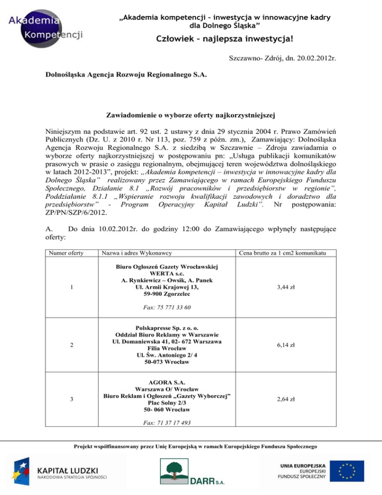„Akademia kompetencji – inwestycja w innowacyjne kadry dla Dolnego Śląska” Człowiek – najlepsza inwestycja! Szczawno- Zdrój, dn. 20.02.2012r. Dolnośląska Agencja Rozwoju Regionalnego S.A. Zawiadomienie o wyborze oferty najkorzystniejszej Niniejszym na podstawie art. 92 ust. 2 ustawy z dnia 29 stycznia 2004 r. Prawo Zamówień Publicznych (Dz. U. z 2010 r. Nr 113, poz. 759 z późn. zm.), Zamawiający: Dolnośląska Agencja Rozwoju Regionalnego S.A. z siedzibą w Szczawnie – Zdroju zawiadamia o wyborze oferty najkorzystniejszej w postępowaniu pn: „Usługa publikacji komunikatów prasowych w prasie o zasięgu regionalnym, obejmującej teren województwa dolnośląskiego w latach 2012-2013”, projekt: „Akademia kompetencji – inwestycja w innowacyjne kadry dla Dolnego Śląska” realizowany przez Zamawiającego w ramach Europejskiego Funduszu Społecznego, Działanie 8.1 „Rozwój pracowników i przedsiębiorstw w regionie”, Poddziałanie 8.1.1 „Wspieranie rozwoju kwalifikacji zawodowych i doradztwo dla przedsiębiorstw” - Program Operacyjny Kapitał Ludzki”. Nr postępowania: ZP/PN/SZP/6/2012. A. Do dnia 10.02.2012r. do godziny 12:00 do Zamawiającego wpłynęły następujące oferty: Numer oferty 1 Nazwa i adres Wykonawcy Biuro Ogłoszeń Gazety Wrocławskiej WERTA s.c. A. Rynkiewicz – Owsik, A. Panek Ul. Armii Krajowej 13, 59-900 Zgorzelec Cena brutto za 1 cm2 komunikatu 3,44 zł Fax: 75 771 33 60 2 3 Polskapresse Sp. z o. o. Oddział Biuro Reklamy w Warszawie Ul. Domaniewska 41, 02- 672 Warszawa Filia Wrocław Ul. Św. Antoniego 2/ 4 50-073 Wrocław 6,14 zł AGORA S.A. Warszawa O/ Wrocław Biuro Reklam i Ogłoszeń „Gazety Wyborczej” Plac Solny 2/3 50- 060 Wrocław 2,64 zł Fax: 71 37 17 493 Projekt współfinansowany przez Unię Europejską w ramach Europejskiego Funduszu Społecznego „Akademia kompetencji – inwestycja w innowacyjne kadry dla Dolnego Śląska” Człowiek – najlepsza inwestycja! B. Zamawiający przyznał następującą punktację w ramach kryteriów oceny ofert: Numer oferty 1 Nazwa i adres Wykonawcy Przyznana punktacja według kryterium: cena brutto za 1 cm2 komunikatu Biuro Ogłoszeń Gazety Wrocławskiej WERTA s.c. A. Rynkiewicz – Owsik, A. Panek Ul. Armii Krajowej 13, 59-900 Zgorzelec 76,74 Fax: 75 771 33 60 2 3 Polskapresse Sp. z o. o. Oddział Biuro Reklamy w Warszawie Ul. Domaniewska 41, 02- 672 Warszawa Filia Wrocław Ul. Św. Antoniego 2/ 4 50-073 Wrocław Oferta odrzucona AGORA S.A. Warszawa O/ Wrocław Biuro Reklam i Ogłoszeń „Gazety Wyborczej” Plac Solny 2/3 50- 060 Wrocław 100 Fax: 71 37 17 493 C. Zamawiający dokonał wyboru oferty Wykonawcy: AGORA S.A. Warszawa O/ Wrocław Biuro Reklam i Ogłoszeń „Gazety Wyborczej” Plac Solny 2/3 50- 060 Wrocław W postępowaniu przetargowym uczestniczyło 3 Wykonawców. Wybrana oferta została sporządzona prawidłowo, treść dokumentów oraz ich daty odpowiadają wymogom określonym w specyfikacji istotnych warunków zamówienia. Oferta w myśl przyjętego kryterium oceny ofert otrzymała 100 pkt i tym samym została najwyżej oceniona przez Zamawiającego. Projekt współfinansowany przez Unię Europejską w ramach Europejskiego Funduszu Społecznego „Akademia kompetencji – inwestycja w innowacyjne kadry dla Dolnego Śląska” Człowiek – najlepsza inwestycja! D. Zamawiający odrzucił ofertę Wykonawcy: Polskapresse Sp. z o. o. Oddział Biuro Reklamy w Warszawie, Ul. Domaniewska 41, 02- 672 Warszawa, Filia Wrocław Ul. Św. Antoniego 2/ 4 ,50-073 Wrocław na podstawie art. 89 ust. 1 pkt 8 ustawy Prawo Zamówień Publicznych. Powodem odrzucenia oferty jest jej nieważność na podstawie odrębnych przepisów. W dniu 14.02.2012r. na podstawie art. 26 ust. 3 ustawy z dnia 29 stycznia 2004 r. Prawo Zamówień Publicznych Zamawiający wezwał Wykonawcę Polskapresse Sp. z o. o. Oddział Biuro Reklamy w Warszawie- Filia Wrocław do uzupełnienia dokumentów potwierdzających, że Wykonawca ten spełnia warunki udziału w postępowaniu oraz nie podlega wykluczeniu z postępowania, poprzez przedłożenie Zamawiającemu pełnomocnictwa z dnia 29 marca 2011r. udzielonego przez Prezesa Zarządu Polskapresse Sp. z o. o. dla Prezesa Oddziału Biuro Reklamy – w formie oryginału lub kopii poświadczonej notarialnie za zgodność z oryginałem oraz pełnomocnictwa z dnia 30 marca 2011r. udzielonego przez Prezesa Oddziału Biuro Reklamy w Warszawie dla osoby składającej ofertę w imieniu Wykonawcy – w formie oryginału lub kopii poświadczonej notarialnie za zgodność z oryginałem. Zamawiający poinformował również Wykonawcę o poprawie omyłek rachunkowych w jego ofercie. Wykonawca nie uzupełnił braków w postaci wskazanych dokumentów w zakreślonym przez Zamawiającego terminie. Konieczność uzupełnienia przedmiotowych pełnomocnictwa wynikała z treści art. 82 ust. 2 Ustawy z dnia 29 stycznia 2004 r. Prawo Zamówień Publicznych w związku z art. 99 ust. 1 Ustawy z dnia 23 kwietnia 1964 r. - Kodeks cywilny. Prawidłową formą pełnomocnictwa dla złożenia oferty przetargowej jest wyłącznie oryginał. Pełnomocnictwo do dokonania czynności prawnej dla ważności której wymagana jest forma szczególna (oferta w formie pisemnej), powinno być udzielone w tej samej formie. Tak stanowi również ugruntowana linia orzecznicza w tym zakresie. W tym miejscu Zamawiający wskazuje na orzeczenia Krajowej Izby Odwoławczej: Wyrok KIO z dnia 15 maja 2008 r. (KIO/UZP 417/08) „Złożenie oferty jest jednostronną czynnością prawną, a przepisem, który zastrzega dla oferty jako czynności prawnej formę pisemną ad solemnitatem jest art. 82 ust. 2 ustawy Prawo Zamówień Publicznych, co powoduje, że w oparciu o przepis art. 99 § 1 kodeksu cywilnego również pełnomocnictwo do złożenia oferty winno być udzielone w formie pisemnej”, Wyrok KIO z dnia 22 sierpnia 2008 r. (KIO/UZP 816/08 i KIO/UZP 817/08) „Pełnomocnictwo do podpisania oferty pow