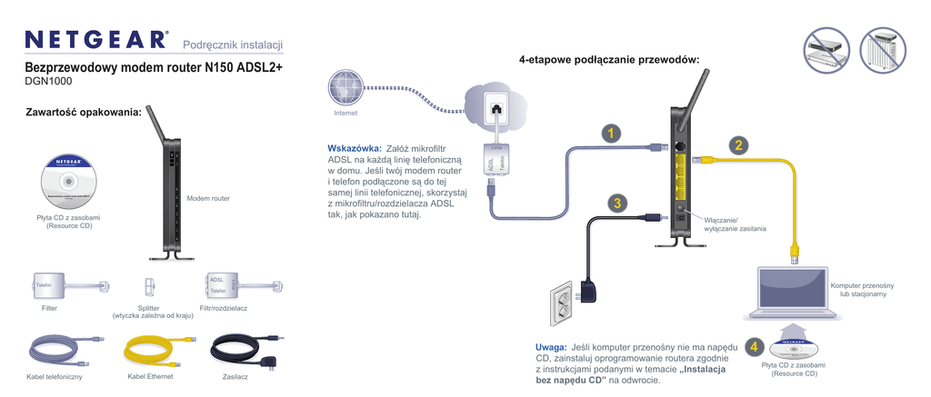 3RGUĊF]QLNLQVWDODFML HWDSRZHSRGáąF]DQLHSU]HZRGyZ %H]SU]HZRGRZ\PRGHPURXWHU1$'6/ '*1 =DZDUWRĞüRSDNRZDQLD ,QWHUQHW 1 %H]SU]HZRGRZ\PRGHPURXWHU1$'6/ 0RGHPURXWHU '*1 3á\WD&']]DVREDPL 5HVRXUFH&' 7HOHIRQ )LOWHU .DEHOWHOHIRQLF]Q\ 7HOHIRQ 2 3 :áąF]DQLH Z\áąF]DQLH]DVLODQLD Linia A'SL 7HOHIRQ /LQLD A'SL :VND]yZND =DáyĪPLNURILOWU $'6/QDNDĪGąOLQLĊWHOHIRQLF]Qą ZGRPX-HĞOLWZyMPRGHPURXWHU LWHOHIRQSRGáąF]RQHVąGRWHM VDPHMOLQLLWHOHIRQLF]QHMVNRU]\VWDM ]PLNURILOWUXUR]G]LHODF]D$'6/ WDNMDNSRND]DQRWXWDM .RPSXWHUSU]HQRĞQ\ OXEVWDFMRQDUQ\ )LOWUUR]G]LHODF] 6SOLWWHU ZW\F]ND]DOHĪQDRGNUDMX .DEHO(WKHUQHW =DVLODF] -HĞOLNRPSXWHUSU]HQRĞQ\QLHPDQDSĊGX 8ZDJD &']DLQVWDOXMRSURJUDPRZDQLHURXWHUD]JRGQLH ]LQVWUXNFMDPLSRGDQ\PLZWHPDFLHÄ,QVWDODFMD EH]QDSĊGX&'´QDRGZURFLH 4 %H]SU]HZRGRZ\PRGHPURXWHU1$'6/ 3á\WD&']]DVREDPL 5HVRXUFH&' Instalacja Ręczna (Linux, Mac, lub PC bez napędu CD) Wstępnie skonfigurowane zabezpieczenia komunikacji bezprzewodowej 1. 2. Produkt ten ma skonfigurowaną wstępnie własną nazwę sieci Wifi (SSID) oraz hasło zabezpieczeń WPA/WPA2-PSK, które znajdują się na etykiecie umieszczonej na spodzie urządzenia. Domyślna nazwa sieci SSID oraz hasło zostały stworzone specjalnie dla każdego urządzenia w celu jego ochrony i zapewnienia maksymalnego bezpieczeństwa korzystania z sieci. Postępuj zgodnie z Krokami 1-3 aby podłączyć modem router DGN1000 do komputera. Upewnij się, że wskaźnik LED zasilania jest zielony i jeśli nie jest, włącz modem router i poczekaj, aż wskaźnik LED zaświeci na zielono. Ustaw łączność internetową 1. 2. 3. 4. Wpisz adres http://www.routerlogin.net w oknie adresu przeglądarki internetowej. Naciśnij klawisz Enter. Jako nazwę użytkownika wpisz admin, a jako hasło wpisz password. Kliknij przycisk OK. Wybierz Menedżera Instalacji z lewego górnego rogu i upewnij się, że zaznaczono Tak przy Automatycznym Wykrywaniu Rodzaju Połączenia. Naciśnij Dalej aby zakończyć Menedżera Instalacji. Wybierz Ustawienia Podstawowe aby zobaczyć swoje ustawienia. Firma NETGEAR zaleca pozostawienie bez zmian wstępnie skonfigurowanej nazwy sieci WiFi (SSID) i jej klucza (hasła). Zmiana tych ustawień podczas procesu instalacji spowoduje, że informacje na spodzie urządzenia staną się nieważne. Podłączanie urządzeń bezprzewodowych do routera Wybierz metodę ręczną lub konfigurację WPS (chronioną konfigurację sieci Wi-Fi), aby dodać komputery i inne urządzenia do swojej sieci bezprzewodowej. Metoda ręczna 1. 2. 3. 4. Otwórz oprogramowanie, które zarządza połączeniami bezprzewodowymi w urządzeniu (komputer przenośny, konsola do gier, iPhone), które chcesz połączyć z siecią. Oprogramowanie to wykona skanowanie w poszukiwaniu wszystkich bezprzewodowych sieci w pobliżu. Znajdź swoją sieć i wybierz ją. Jeżeli podczas procesu konfiguracji nazwa sieci nie została zmieniona, należy znaleźć nazwę domyślnej sieci WiFi (SSID) i wybrać ją. Domyślna nazwa sieci WiFi (SSID) znajduje się na etykiecie umieszczonej na spodzie routera. Wpisz hasło i kliknij Connect (Połącz). Domyślne hasło znajduje się na etykiecie umieszczonej na spodzie routera. Powtórz kroki 1–3, aby dodać inne urządzenia bezprzewodowe. Metoda WPS Nazwa sieci WiFi (SSID) Hasło WPA/WPA2-PSK Zmiany wprowadzone w domyślnych ustawieniach sieci bezprzewodowej należy zapisać tutaj: Nazwa sieci bezprzewodowej (SSID) _______________________________ Hasło zabezpieczeń _____________________________________________ Uwaga: Jeśli Twój Dostawca Usług Internetowych (ISP) wymaga logowania, wprowadź dostarczone przez niego dane logowania gdy pojawi się monit. Login ISP nie jest taki sam jak login routera. Jeśli nie posiadasz informacji o logowaniu od ISP, skontaktuj się z ISP i zapisz je poniżej: Aby odzyskać hasło wpisz adres http://www.routerlogin.net w oknie przeglądarki i zaloguj się, korzystając z nazwy użytkownika admin oraz hasła (domyślne hasło to password). Wybierz opcję Wireless Settings (Ustawienia bezprzewodowe), aby odzyskać hasło. Nie należy kłaść urządzeń na sobie ani umieszczać ich w ciasnych miejscach lub szufladach. Należy zadbać o to, żeby urządzenie miało co najmniej 5 cm wolnej przestrzeni wokół siebie. Nazwa Użytkownika ISP: __________________________ Hasło ISP: ______________________________________ Luty 2012 Ten symbol został umieszczony zgodnie z dyrektywą Unii Europejskiej 2002/96 w sprawie zużytego sprzętu elektrycznego i elektronicznego (WEEE). Jeśli produkt jest utylizowany na terenie Unii Europejskiej, powinien on być traktowany i poddany recyklingowi zgodnie z obowiązującym lokalnie prawem oraz z zastosowaniem postanowień dyrektywy WEEE. Jeżeli urządzenie obsługuje funkcję WPS (Push 'N' Connect), umożliwiającą bezpieczne łączenie ze sobą urządzeń za pomocą jednego przycisku, należy postępować zgodnie z poniższymi krokami: 1. 2. 3. Naciśnij przycisk WPS na routerze. Przypomina on: . W ciągu 2 minut naciśnij przycisk WPS na routerze lub zastosuj się do instrukcji obsługi przycisku WPS w urządzeniu. Urządzenie zostało podłączone do routera. Powtórz kroki 1-2 by dodać inne urządzenia bezprzewodowe WPS. Uwaga: WPS nie obsługuje zabezpieczeń WEP. Próba podłączenia klienta WEP do sieci za pomocą WPS nie powiedzie się. Pełna deklaracja zgodności znajduje się na stronie internetowej zawierającej deklaracje zgodności firmy NETGEAR w Unii Europejskiej: http://support.netgear.com/app/answers/detail/a_id/11621/. Więcej informacji dotyczących Powszechnej Licencji Publicznej GNU (GPL) znaleźć można pod adresem: http://support.netgear.com/app/answers/detail/a_id/2649. ©2012 NETGEAR, Inc. Wszelkie prawa zastrzeżone. NETGEAR i logo NETGEAR są zarejestrowanymi znakami towarowymi firmy NETGEAR, Inc. w Stanach Zjednoczonych i/lub innych krajach. Pozostałe nazwy marek i produktów są znakami towarowymi lub zarejestrowanymi znakami towarowymi nale