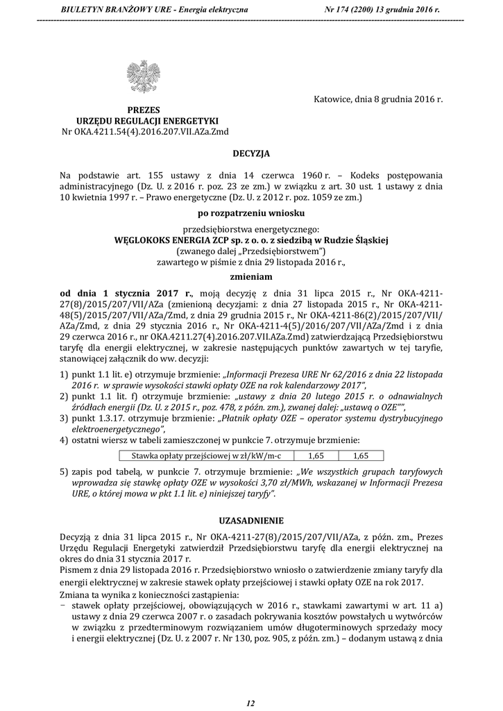 BIULETYN BRANŻOWY URE - Energia elektryczna Nr 174 (2200) 13 grudnia 2016 r. -------------------------------------------------------------------------------------------------------------------------------------------------------- Katowice, dnia 8 grudnia 2016 r. PREZES URZĘDU REGULACJI ENERGETYKI Nr OKA.4211.54(4).2016.207.VII.AZa.Zmd DECYZJA Na podstawie art. 155 ustawy z dnia 14 czerwca 1960 r. – Kodeks postępowania administracyjnego (Dz. U. z 2016 r. poz. 23 ze zm.) w związku z art. 30 ust. 1 ustawy z dnia 10 kwietnia 1997 r. – Prawo energetyczne (Dz. U. z 2012 r. poz. 1059 ze zm.) po rozpatrzeniu wniosku przedsiębiorstwa energetycznego: WĘGLOKOKS ENERGIA ZCP sp. z o. o. z siedzibą w Rudzie Śląskiej (zwanego dalej „Przedsiębiorstwem”) zawartego w piśmie z dnia 29 listopada 2016 r., zmieniam od dnia 1 stycznia 2017 r., moją decyzję z dnia 31 lipca 2015 r., Nr OKA-421127(8)/2015/207/VII/AZa (zmienioną decyzjami: z dnia 27 listopada 2015 r., Nr OKA-421148(5)/2015/207/VII/AZa/Zmd, z dnia 29 grudnia 2015 r., Nr OKA-4211-86(2)/2015/207/VII/ AZa/Zmd, z dnia 29 stycznia 2016 r., Nr OKA-4211-4(5)/2016/207/VII/AZa/Zmd i z dnia 29 czerwca 2016 r., nr OKA.4211.27(4).2016.207.VII.AZa.Zmd) zatwierdzającą Przedsiębiorstwu taryfę dla energii elektrycznej, w zakresie następujących punktów zawartych w tej taryfie, stanowiącej załącznik do ww. decyzji: 1) punkt 1.1 lit. e) otrzymuje brzmienie: „Informacji Prezesa URE Nr 62/2016 z dnia 22 listopada 2016 r. w sprawie wysokości stawki opłaty OZE na rok kalendarzowy 2017”, 2) punkt 1.1 lit. f) otrzymuje brzmienie: „ustawy z dnia 20 lutego 2015 r. o odnawialnych źródłach energii (Dz. U. z 2015 r., poz. 478, z późn. zm.), zwanej dalej: „ustawą o OZE””, 3) punkt 1.3.17. otrzymuje brzmienie: „Płatnik opłaty OZE – operator systemu dystrybucyjnego elektroenergetycznego”, 4) ostatni wiersz w tabeli zamieszczonej w punkcie 7. otrzymuje brzmienie: Stawka opłaty przejściowej w zł/kW/m-c 1,65 1,65 5) zapis pod tabelą, w punkcie 7. otrzymuje brzmienie: „We wszystkich grupach taryfowych wprowadza się stawkę opłaty OZE w wysokości 3,70 zł/MWh, wskazanej w Informacji Prezesa URE, o której mowa w pkt 1.1 lit. e) niniejszej taryfy”. UZASADNIENIE Decyzją z dnia 31 lipca 2015 r., Nr OKA-4211-27(8)/2015/207/VII/AZa, z późn. zm., Prezes Urzędu Regulacji Energetyki zatwierdził Przedsiębiorstwu taryfę dla energii elektrycznej na okres do dnia 31 stycznia 2017 r. Pismem z dnia 29 listopada 2016 r. Przedsiębiorstwo wniosło o zatwierdzenie zmiany taryfy dla energii elektrycznej w zakresie stawek opłaty przejściowej i stawki opłaty OZE na rok 2017. Zmiana ta wynika z konieczności zastąpienia: - stawek opłaty przejściowej, obowiązujących w 2016 r., stawkami zawartymi w art. 11 a) ustawy z dnia 29 czerwca 2007 r. o zasadach pokrywania kosztów powstałych u wytwórców w związku z przedterminowym rozwiązaniem umów długoterminowych sprzedaży mocy i energii elektrycznej (Dz. U. z 2007 r. Nr 130, poz. 905, z późn. zm.) – dodanym ustawą z dnia 12 BIULETYN BRANŻOWY URE - Energia elektryczna Nr 174 (2200) 13 grudnia 2016 r. -------------------------------------------------------------------------------------------------------------------------------------------------------- 22 czerwca 2016 r. o zmianie ustawy o odnawialnych źródłach energii oraz niektórych innych ustaw (Dz.U. z 2016 r. poz. 925); - stawki opłaty OZE, obowiązującej w II połowie 2016 r., stawką wynikającą z Informacji Prezesa URE Nr 62/2016 z dnia 22 listopada 2016 r. w sprawie wysokości stawki opłaty OZE na rok kalendarzowy 2017. Zgodnie z art. 155 Kodeksu postępowania administracyjnego, decyzja ostateczna, na mocy której strona nabyła prawo, może być w każdym czasie za zgodą strony uchylona lub zmieniona przez organ administracji publicznej, który ją wydał, jeżeli przepisy szczególne nie sprzeciwiają się uchyleniu lub zmianie takiej decyzji i przemawia za tym interes społeczny lub słuszny interes strony. W niniejszej sprawie uznano, że zostały spełnione przesłanki określone w powyższym przepisie, umożliwiające niniejszą zmianę, w związku z czym orzeczono jak w sentencji. POUCZENIE 1. Od niniejszej decyzji przysługuje odwołanie do Sądu Okręgowego w Warszawie – Sądu Ochrony Konkurencji i Konsumentów, za moim pośrednictwem, w terminie dwutygodniowym od dnia jej doręczenia (art. 30 ust. 2 i 3 ustawy – Prawo energetyczne oraz art. 47946 pkt 1 i art. 47947 §1 Kodeksu postępowania cywilnego). 2. Odwołanie od decyzji powinno czynić zadość wymaganiom przepisanym dla pisma procesowego oraz zawierać oznaczenie zaskarżonej decyzji i wartości przedmiotu sporu, przytoczenie zarzutów, zwięzłe ich uzasadnienie, wskazanie dowodów, a także zawierać wniosek o uchylenie albo o zmianę decyzji w całości lub w części (art. 47949 Kodeksu postępowania cywilnego). Odwołanie należy przesłać na adres Południowego Oddziału Terenowego Urzędu Regulacji Energetyki - ul. Sokolska 65, 40-087 Katowice. 3. Stosownie do art. 47 ust. 3 pkt 1 w związku z art. 31 ust. 3 pkt 2 ustawy – Prawo energetyczne, niniejsza decyzja zostanie skierowana do ogłoszenia w „Biuletynie Branżowym Urzędu Regulacji Energetyki – Energia elektryczna”. Z upoważnienia Prezesa Urzędu Regulacji Energetyki /-/ Marek Miśkiewicz Dyrektor Południowego Oddziału Terenowego Urzędu Regulacji Energetyki z siedzibą w Katowicach Otrzymuje: WĘGLOKOKS ENERGIA ZCP sp. z o. o. ul. Szyb Walenty 32 41-700 Ruda Śląska Decyzja niniejsza jako wydana w trybie szczególnym zwolniona jest z opłaty skarbowej na podstawie art. 4 ustawy z dnia 16 listopada 2006 r. o opłacie skarbowej (Dz. U. z 2016 r. poz. 1827) w związku z treścią załącznika do tej ustawy (część I pkt 53 ppkt 1) Andrzej Zawiązalec – Główny specjalista 2 13