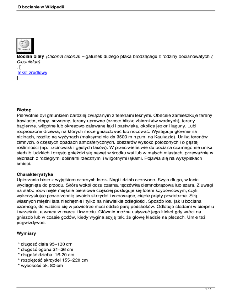 O bocianie w Wikipedii Bocian biały (Ciconia ciconia) – gatunek dużego ptaka brodzącego z rodziny bocianowatych ( Ciconiidae) .[ tekst źródłowy ] Biotop Pierwotnie był gatunkiem bardziej związanym z terenami leśnymi. Obecnie zamieszkuje tereny trawiaste, stepy, sawanny, tereny uprawne (często blisko zbiorników wodnych), tereny bagienne, wilgotne lub okresowo zalewane łąki i pastwiska, okolice jezior i laguny. Lubi rozproszone drzewa, na których może gniazdować lub nocować. Występuje głównie na nizinach, rzadko na wyżynach (maksymalnie do 3500 m n.p.m. na Kaukazie). Unika terenów zimnych, o częstych opadach atmosferycznych, obszarów wysoko położonych i o gęstej roślinności (np. trzcinowisk i gęstych lasów). W przeciwieństwie do bociana czarnego nie unika siedzib ludzkich i często gnieździ się nawet w środku wsi lub w małych miastach, przeważnie w rejonach z rozległymi dolinami rzecznymi i wilgotnymi łąkami. Pojawia się na wysypiskach śmieci. Charakterystyka Upierzenie białe z wyjątkiem czarnych lotek. Nogi i dziób czerwone. Szyja długa, w locie wyciągnięta do przodu. Skóra wokół oczu czarna, tęczówka ciemnobrązowa lub szara. Z uwagi na słabo rozwinięte mięśnie piersiowe częściej posługuje się lotem szybowcowym, czyli wykorzystując powierzchnię swoich skrzydeł i wznoszące, ciepłe prądy powietrzne. Siłą własnych mięśni lata niechętnie i tylko na niewielkie odległości. Sposób lotu jak u bociana czarnego, do wzbicia się w powietrze musi oddać parę podskoków. Odlatuje stadami w sierpniu i wrześniu, a wraca w marcu i kwietniu. Głównie można usłyszeć jego klekot gdy wróci na gniazdo lub w czasie godów, kiedy wygina szyję tak, że głowę kładzie na plecach. Umie też pogwizdywać. Wymiary * długość ciała 95–130 cm * długość ogona 24–26 cm * długość dzioba: 16-20 cm * rozpiętość skrzydeł 155–220 cm * wysokość ok. 80 cm 1/4 O bocianie w Wikipedii Masa ciała 2,3–4,4 kg. Podgatunki * Ciconia ciconia ciconia (Linnaeus, 1758) – gnieździ się na Półwyspie Iberyjskim i wyspowo we Francji oraz w północno-zachodniej Afryce. Ta populacja zimująca w Afryce Równikowej i Zachodniej podczas przelotów przelatuje nad Cieśniną Gibraltarską. Znacznie większa populacja w Europie Środkowej i Wschodniej oraz na Bałkanach, na Kaukazie, w Azji Mniejszej i na Bliskim Wschodzie. Zimuje w Afryce Równikowej i Wschodniej przelatując nad Bosforem i Dardanelami oraz nad Synajem. Część zimuje w Indiach. * Ciconia ciconia asiatica (Severtsov, 1873) – gnieździ się w Azji Środkowej, zimuje w Indiach i Iranie. Jest nieco większy od C. c. ciconia. Dawniej jako podgatunek bociana białego uznawano bociana czarnodziobego (Ciconia boyciania). Gniazdo Gniazdo duże, koliste z warstwowo ułożonych gałęzi, poprzetykanych skośnie witkami. Wyściółka dość obfita ze słomy, torfu, łajna, niekiedy z dodatkiem papieru lub szmat, zbieranych z pól i ludzkich wysypisk. Średnica zewnętrzna 1,0–1,5 m; wysokość 0,5–1,5 m. Buduje je zarówno samiec, jak i samica. Umiejscowione zwykle na drzewie w bezpośredniej bliskości siedzib ludzkich lub na różnych budowlach ludzkich (dach budynku mieszkalnego lub gospodarczego, w ruinach wysokich budynków, na nieczynnych kominach fabrycznych, pylonach, słupach telegraficznych, stogach). Od lat 70. XX wieku coraz częściej na specjalnych platformach umieszczanych przez człowieka na słupach linii telefonicznych lub energetycznych, w niektórych rejonach jest to najczęstszy sposób lokowania gniazd. W Polsce ponad 60% populacji gniazduje na słupach energetycznych. Gniazduje pojedynczo lub w luźnych koloniach, gdzie wiele gniazd jest często blisko siebie. Tego samego gniazda ptaki używają przez wiele lat, co roku dokonując napraw i uzupełnień budulca. Znane są gniazda użytkowane 400 lat, a największe z nich mają 225 cm średnicy, 280 cm wysokości i ważą ponad tonę. Dana para przywiązuje się zatem do danego gniazda i gdy partner długo nie wraca z zimowiska jest zmieniany, zwłaszcza gdy do samca, wracającego wcześniej, przyleci obca samica przed zeszłoroczną. Jaja Różnobiegunowe, bardzo mało wydłużone, raczej pękate o barwie białej, lekko przybrudzonej o tępym węższym biegunie. Średnie wymiary 72x54 mm. Składane zazwyczaj pod koniec kwietnia, rzadko wcześniej, w liczbie od 1 do 7. Wysiadywanie i dorastanie Jaja składane w odstępach dwudniowych. Wysiadywane są przez obydwoje rodziców, najczęściej po zniesieniu drugiego jaja, przez okres 33-35 dni. Pisklęta opuszczają gniazdo po 55-64 dniach; w wieku 70 dni są już prawie samodzielne, lecz dojrzałość płciową uzyskują 2/4 O bocianie w Wikipedii dopiero po 2–7 latach. Opieką nad potomstwem zajmują się oboje rodzice po równo, nie tylko karmią, ale i opryskują wodą w upalne dni. Ptaki młodociane mają czarny dziób (przechodzący z czasem w jasno czerwony) i brązowoszare nogi. Tęczówka oka młodych jest brązowa, a u dorosłych szarawa. Pisklęta są pokryte białym gęstym puchem. Najstarszy zaobrączkowany samiec dożył 33 lat i rok wcześniej pomyślnie wyprowadził lęg. W niewoli jeden osobnik dożył 35 lat. Pożywienie Bocian jest ptakiem mięsożernym. Żywi się owadami, głównie pasikonikami i chrząszczami, ale również jaszczurkami, wężami, pisklętami i wyjątkowo małymi zającami. W latach obfitujących w myszy i norniki zjada prawie wyłącznie te gryzonie, przez co jest ptakiem pożytecznym z punktu widzenia rolników. Mimo popularnych opowieści bocian biały rzadko je żaby, jeżeli do wyboru ma inne rodzaje pokarmu. W okresie lęgowym staje się mało wybredny i aby wykarmić szybko rosnące młode łapie każde zwierzę, które jest w stanie połknąć. Ochrona Bocian biały nie jest gatunkiem globalnie zagrożonym wyginięciem, chociaż od stu lat znacznie zmniejszył swą liczebność w wielu obszarach północn
