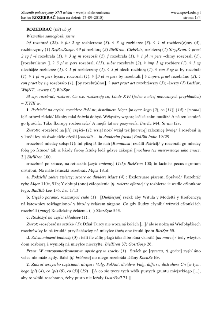 Słownik polszczyzny XVI wieku - wersja elektroniczna hasło: ROZEBRAĆ (stan na dzień: 27-09-2015) www.spxvi.edu.pl strona 1/4 ROZEBRAĆ (68) vb pf Wszystkie samogłoski jasne. inf rozebrać (22). ◊ fut 2 sg rozbierzesz (3). ◊ 3 sg rozbierze (3). ◊ 1 pl rozbierz(e)my (4), rozbierzymy (1) RejPosRozpr. ◊3 pl rozbiorą (2) BielKron, CiekPotr, rozbierzą (1) StryjKron. ◊ praet 2 sg f -ś rozebrała (1). ◊ 3 sg m rozebråł (2). f rozebrała (1). ◊ 1 pl m pers -chmy rozebrali (1), [rozebralismy ]. ◊ 3 pl m pers rozebrali (13). subst rozebrały (2). ◊ imp 2 sg rozbierz (1). ◊ 3 sg niechåjże rozbierze (1). ◊ 1 pl rozbierzmy (1). ◊ 3 pl niech rozbiorą (1). ◊ con 3 sg m by rozebråł (1). ◊ 1 pl m pers bysmy rozebrali (1). ◊ [3 pl m pers by rozebrali.] ◊ impers praet rozebråno (2). ◊ con praet by się rozebrało (1), [by rozebr(a)no]. ◊ part praet act rozebråwszy (3); -åwszy (2) LatHar, WujNT, -awszy (1) BielSpr. Sł stp: rozebrać, rozbrać, Cn s.v. rozbierają co, Linde XVI (jeden z niżej notowanych przykładów) – XVIII w. 1. Podzielić na części; concidere PolAnt; distribuere Mącz [w tym: kogo (2), co (11)] (14) : [wrona] ięłá orłowi rádzić/ Iákoby miał żołwiá dobyć. Wźiąwſzy wzgorę lećieć znim muśiſz/ A ná ten kamień go ſpuśćiſz: Táko ſkorupy rozbierzeſz/ A mięſá łatwie pożywieſz. BierEz M4; Strum I2v. Zwroty: »rozebrać na [ile] części« (1): wziął noż/ wziął też [martwą] zaloznicę ſwoię/ á rozebrał ią y kośći iey ná dwánaśćie cżęśći [concidit ... in duodecim frusta] BudBib Iudic 19/29. »rozebrać miedzy sobą« (1): ini piſzą iż ſie nań [Romulusa] rzućili Pátricij/ y rozebráli go miedzy ſobą po ſztuce/ ták iż káżdy ſwoię ſztukę ledá gdzye zákopał [możliwa też interpretacja jako znacz. 2.] BielKron 100. »rozebrać po sztuce, na sztuczki« [szyk zmienny] (1:1): BielKron 100; in lacinias pecus egrotum distribui, Ná máłe ſztuczki rozebráć. Mącz 181d. a. Podzielić zabite zwierzę; secare ac dividere Mącz (4) : Exdorsuare piscem, Spráwić/ Rozebráć rybę Mącz 110c, 91b; Y obłupi (ono) cáłopalenie [tj. zwierzę ofiarne]/ y rozbierze ie wedle cżłonkow iego. BudBib Lev 1/6, Lev 1/13. b. Ciężko poranić, rozszarpać ciało (1) : [Dioklecjan] rzekł: áby Wituſa y Modeſtá y Kreſcencyą ná kátowniey rośćiągniono/ y bito/ y żelázem tárgano. Co gdy ſłudzy cżynili/ wſzytki cżłonki ich rozebráli (marg) Rozśiekány żelázmi. (–) SkarŻyw 553. c. Rozłożyć na części składowe (1) : Zwrot: »rozebrać na sztuki« (1): Dźiał Turcy nie wożą ná kołách [...]/ ále ie noſzą ná Wielbłądźiech rozebráwſzy ie ná ſztuki/ przyiácháwſzy ná mieyſce ſłożą one ſztuki ſpołu BielSpr 55. d. Zdemontować budowlę (3) : ieſli ſie záſię plagá táka álbo ráná vkazáłá [na murze]/ tedy wſzytek dom rozbiorą á wynioſą ná mieyſce niecżyſte. BielKron 37; GostGosp 26. Przen: W antropomorfizowanym opisie gry w szachy (1) : Strách go [rycerza, tj. gońca] zyął/ áno vciec nie máſz kędy. Bábá [tj. królowa] do niego rozebráłá ſćiány KochSz Bv. 2. Zabrać wszystko częściami; diripere Vulg, PolAnt; dividere Vulg; differre, distrahere Cn [w tym: kogo (pl) (4), co (pl) (8), co (5)] (19) : [A co się tycze tych włók pustych gruntu miejsckiego [...], aby te włóki rozebrano, żeby pusto nie leżały LustrPodl 71.] Słownik polszczyzny XVI wieku - wersja elektroniczna hasło: ROZEBRAĆ (stan na dzień: 27-09-2015) www.spxvi.edu.pl strona 2/4 Zwrot: »rozebrać miedzy się« [szyk zmienny] (3): chorym/ y ſirotham/ y wdowam podzielili łupy: á oſthátek ſámi miedzy ſie rozebráli. Leop 2.Mach 8/28, 2.Par 20/25; poimánych z obozem/ y z wielkimi łupámi/ Hetman/ Pánowie y Rycerſtwo Litewſkie miedzy ſię rozebráli/ przednieyſzych Więźniow do Krolá [...] odeſławſzy. StryjKron 772. Przen (1) : IZ was [rycerstwo] wſzyſtek ſwiát práwie rozumie ták mężne/ [...] Ná tymći ſie nie mylą/ iednoż ty pokoie/ Widzę was rozebráły ná rzemioſłá ſwoie. PaprPan Cc4. a. Wziąć i zanieść w różne miejsca (4) : rozebrać komu [„sobie”] z czego (1): BLaznowi máłą rybkę/ ná tálerzu dáli/ A ſámi ſobie więtſze/ z miſy rozebráli. RejFig Dd8v. rozebrać w co (1): zárzeżą go [byka]/ á krwie nieroźlewáią ná ziemię/ ktorą wypuśćiwſzy w vſzátek/ czerpáią kauſzykiem álbo czárką/ [...] á oſtátek rozbierzą w gárnuſzki/ y kropią káżdy w Domu ſwoim bydło StryjKron 161. Przen (2) : Zwroty: »rozebrać między sie« (1): gdzieby ſie wſzyſcy ludzie ná ſwiecie ná to zmowili/ rozebráć po iedney między ſie/ choroby duſzne wſzythki [...] GórnDworz C6v. »na się rozebrać« (1): Záraz ná pierwſzym ſtárćiu/ woyſko ptakow legło/ Choćiay im tyle dwoie ná pomoc przybiegło. Tych ſtrzały piorolotne ná śię rozebráły KmitaSpit B2v. b. Zabrać komuś, zwykle bezprawnie (11) : A dla zgwałconey Dyny Corki Iakobowey/ wſzytki Sychymity pozábijano/ ſtádá ich rozebrano GroicPorz kk4; RejWiz 41; Leop Esth 9/15, Is 10/6; StryjKron 210; A gdzieſz ſię [pieniądze] podziáły? (–) [...] Rzeźnik, piekarz, ogrodnik, ſzynkarz, ptaſznik, rybitw: Aptekárze, bárwierze, inſzy rzemięſłnicy, V ktorych ſię potrzeby długo ná borg bráły, Rozebráli CiekPotr 32; [WujBib Deut 3/7]. rozebrać kogo [= czyjś majątek] (1): y pádło ſnich bárzo wiele/ nákoniec y żony im w niewolą pobráli/ y ſyny/ y rozebráli ie/ á źiemię ich opánowáli Leop 1.Mach 8/10. rozebrać komu (1): Biednym chłopom rozbiorą konie ná podwody CiekPotr [31]. Zwrot: »miedzy się rozebrać« (2): iużechmy Duchowne chleby [tj. majątki] wyniſzczyli/ y miedzy ſye ie rozebráli OrzRozm C4v; BudBib 2.Par 20/25. Szereg: »rozerwać a rozebrać« (1): Lud potym wytocżywſzy ſie rozerwał á rozebráł [diripuit] oboz Syriyſki Leop 4.Reg 7/16. 3. Z