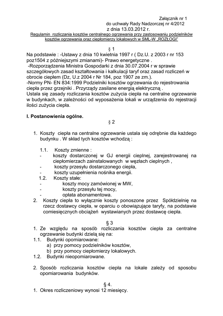 Załącznik nr 1 do uchwały Rady Nadzorczej nr 4/2012 z dnia 13.03.2012 r. Regulamin rozliczania kosztów centralnego ogrzewania przy zastosowaniu podzielników kosztów ogrzewania oraz ciepłomierzy lokalowych w SML-W „ROZŁOGI” §1 Na podstawie : -Ustawy z dnia 10 kwietnia 1997 r ( Dz.U. z 2003 r nr 153 poz1504 z późniejszymi zmianami)- Prawo energetyczne . -Rozporządzenia Ministra Gospodarki z dnia 30.07.2004 r w sprawie szczegółowych zasad kształtowania i kalkulacji taryf oraz zasad rozliczeń w obrocie ciepłem (Dz, U.z 2004 r Nr 184, poz 1907 ze zm.). -Normy PN- EN 834:1999 Podzielniki kosztów ogrzewania do rejestrowania ciepła przez grzejniki . Przyrządy zasilane energią elektryczną . Ustala się zasady rozliczania kosztów zużycia ciepła na centralne ogrzewanie w budynkach, w zależności od wyposażenia lokali w urządzenia do rejestracji ilości zużycia ciepła. I. Postanowienia ogólne. §2 1. Koszty ciepła na centralne ogrzewanie ustala się odrębnie dla każdego budynku . W skład tych kosztów wchodzą : 1.1. - Koszty zmienne : koszty dostarczonej w GJ energii cieplnej, zarejestrowanej na ciepłomierzach zainstalowanych w węzłach cieplnych , koszty przesyłu dostarczonego ciepła, koszty uzupełnienia nośnika energii. 1.2. Koszty stałe: koszty mocy zamówionej w MW, koszty przesyłu tej mocy, opłata abonamentowa. 2. Koszty ciepła to wyłącznie koszty ponoszone przez Spółdzielnię na rzecz dostawcy ciepła, w oparciu o obowiązujące taryfy, na podstawie comiesięcznych obciążeń wystawianych przez dostawcę ciepła. §3 1. Ze względu na sposób rozliczania kosztów ciepła za centralne ogrzewanie budynki dzielą się na: 1.1. Budynki opomiarowane: a) przy pomocy podzielników kosztów, b) przy pomocy ciepłomierzy lokalowych. 1.2. Budynki nieopomiarowane. 2. Sposób rozliczania kosztów ciepła na lokale zależy od sposobu opomiarowania budynków. § 4. 1. Okres rozliczeniowy wynosi 12 miesięcy. 2 2. Okres rozliczeniowy w poszczególnych budynkach ustalany jest przez Zarząd. II. Rozliczanie kosztów ciepła za centralne ogrzewanie w budynkach wyposażonych w podzielniki kosztów ciepła. § 5. 1. W budynkach, w których lokale wyposażone są w podzielniki kosztów centralnego ogrzewania, całkowite koszty ciepła dzieli się na: 1.1. Koszty stałe, na które składają się: 1.2. - koszty mocy zamówionej dla danego budynku, - koszty przesyłowe mocy zamówionej, - koszty odczytu liczników, - inne dodatkowe koszty niezależne od zużycia ciepła. Koszty zmienne na które składają się: - koszty pobranego ciepła w GJ w budynku, - koszty przesyłowe pobranego ciepła. 1.3. Koszty zmienne dzielą się na: 1) koszty ogrzewania pomieszczeń, w których nie zamontowano podzielników kosztów (łazienki i pomieszczenia wspólne), 2) koszty ogrzewania pomieszczeń z zamontowanymi podzielnikami kosztów (lokale mieszkalne i użytkowe). 2. Podziału kosztów, o których mowa w ust. 1 pkt 1.3, dokonuje się na podstawie proporcji sumy powierzchni ogrzewanej przez grzejniki nie opomiarowane w budynku (korytarze, klatki schodowe, pomieszczenia administracyjne, łazienki) do całkowitej powierzchni ogrzewanej w budynku. 3. Koszty stałe i koszty zmienne związane z ogrzewaniem pomieszczeń, w których nie zmontowano podzielników kosztów tworzą koszty wspólne. 4. Koszty wspólne dzieli się proporcjonalnie do udziału całkowitej powierzchni użytkowej lokalu w ogólnej sumie powierzchni użytkowych wszystkich lokali w budynku. 5. Koszty zmienne związane z ogrzewaniem pomieszczeń z zamontowanymi podzielnikami kosztów, dzieli się proporcjonalnie do udziału sumy jednostek wykazanych przez wszystkie podzielniki kosztów w lokalu, (skorygowanej współczynnikami korekcyjnymi) w ogólnej, skorygowanej sumie jednostek wykazanych przez wszystkie podzielniki kosztów w budynku. 2 3 6. Współczynniki korekcyjne dla wszystkich mieszkań stanowiące załącznik nr 7a, oblicza audytor energetyczny przy zastosowaniu odpowiednich norm i programów komputerowych. - Współczynniki korekcyjne uwzględniają oddziaływanie różnych parametrów na lokal (powierzchnia lokalu, powierzchnia przegród zewnętrznych i ich współczynniki przenikania ciepła, położenie lokalu, straty ciepła na wentylację). - W przypadku docieplenia przegród zewnętrznych lokali, ulegają zmianie współczynniki korekcyjne dla całego budynku lub niektórych lokali. 7. Współczynniki korekcyjne stanowiące załącznik nr 7a do „Zasad rozliczania kosztów związanych z eksploatacją i utrzymaniem nieruchomości i lokali oraz ustalania wysokości opłat”, są integralnym składnikiem regulaminu. 8. Odczytu podzielników kosztów i rozliczenia kosztów centralnego ogrzewania na lokale, dokonuje firmą z którą Spółdzielnia zawarła umowę na rozliczanie kosztów centralnego ogrzewania, zwana dalej Wykonawcą. 8.1. O terminie odczytów użytkownicy lokali muszą być powiadomieni z 7 dniowym wyprzedzeniem przy pomocy ogłoszeń na klatkach schodowych. 8.2. Użytkownik lokalu zobowiązany jest zapewnić dostęp do urządzeń zamontowanych na grzejnikach. 8.3. Jeżeli odczyt nie dojdzie do skutku z winy użytkownika lokalu, wyznaczany jest termin drugiego bezpłatnego odczytu. Termin wyznacza Wykonawca, nie później niż 14 dni po terminie pierwszego odczytu wywieszając stosowne ogłoszenia na klatkach schodowych. 8.4. Dokonanie odczytu w terminie trzecim (i ostatecznym ) wyznaczonym przez Wykonawcę, jest odpłatne przez użytkownika lokalu zgodnie z zatwierdzonym taryfikatorem. 8.5. Wykonawca zobowiązany jest do: - dokonania odczytu podzielników , 3 4 - sprawdzenia prawidłowości montażu podzielników zabezpieczających , - sporządzenia protokołu odczytu i po jego podpisaniu przez użytkownika przekazania jednej z kopii użytkownikowi, drugiej Spółdzielni, - rozliczenia kosztów regulaminem. centralnego ogrzewania i plomb zgodnie z 8.6. Szczegółowe obowiązki