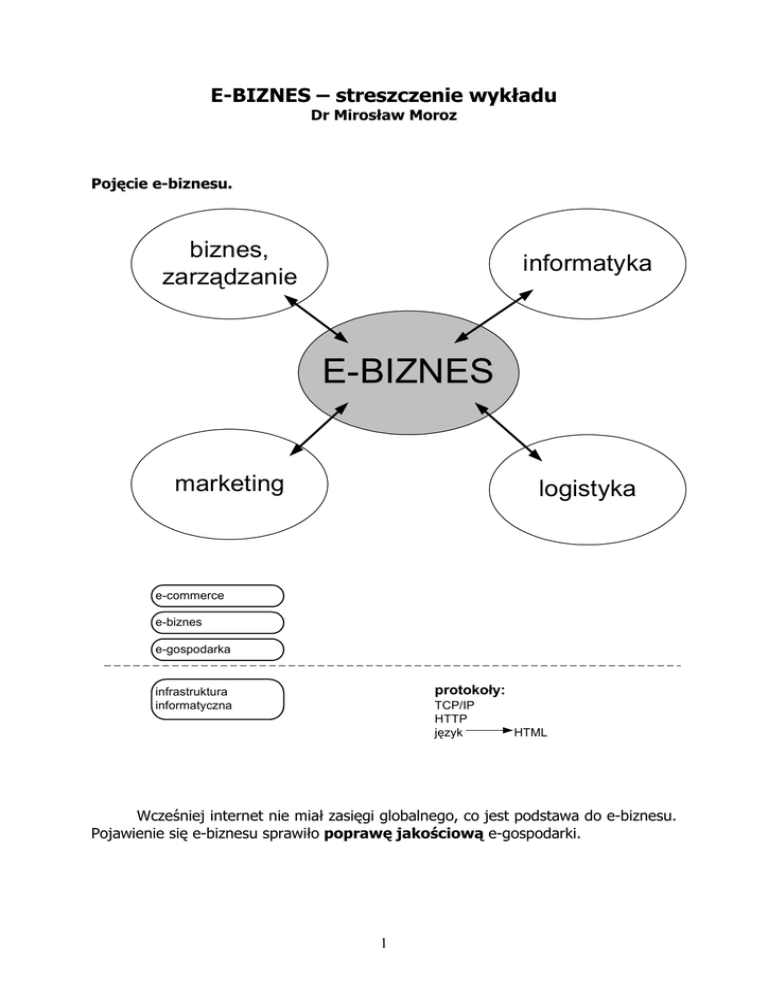 E-BIZNES – streszczenie wykładu Dr Mirosław Moroz Pojęcie e-biznesu. biznes, zarządzanie informatyka E-BIZNES marketing logistyka e-commerce e-biznes e-gospodarka protokoły: infrastruktura informatyczna TCP/IP HTTP język HTML Wcześniej internet nie miał zasięgi globalnego, co jest podstawa do e-biznesu. Pojawienie się e-biznesu sprawiło poprawę jakościową e-gospodarki. 1 Charakterystyka tradycyjnej i e-gospodarki Tradycyjna gospodarka E-gospodarka Stabilny i przewidywalny sposób działalności Ogólnie dostępna Korzyści skali Stosunki bezpośrednie Równowaga, oparcie na czynnikach geograficznych i kapitale Zmiany Pozycjonowanie Migracja wartości Planowanie długookresowe Działania w czasie rzeczywistym Ochrona produktów, rynków i kanałów dystrybucji Kanibalizacja produktów, rynków i kanałów dystrybucji Przewidywanie przyszłości Kształtowanie lub adaptacja do przyszłości Zachęca do powtarzalności Zachęca do eksperymentowania Szczegółowe plany działania Zarządzanie opcjami Strukturalne, formalne alianse Sieci nieformalnych powiązań Awersja do niepowodzenia Niepowodzenie jest oczekiwane Słabe powiązanie pomiędzy wynikami i korzyściami Bezpośrednie powiązanie pomiędzy ryzykiem i korzyściami A. Hartman, J. Sifonis, J. Kador, "E-biznes. Strategie sukcesu w gospodarce internetowej", wyd. KE LIBER, Warszawa 2001, s.XV. 2 E-biznes – to sposób funkcjonowania przedsiębiorstwa, polegający na wymianie wartości (informacji, produktów, e-pieniądza), z wykorzystaniem elektronicznych (internetu, intranetu, ekstranetu, sieci EDI, itp.). mediów Przyjęcie powyŜszej definicji oznacza, Ŝe: e-biznes postrzegany jest jako innowacja procesowa, tj. oznacza zmianę w sposobie prowadzenia działalności przedsiębiorstwa, nie jest więc jedynym wzorem działalności czy teŜ całościową koncepcją zarządzania przdsiębiorstwem, lecz kolejnym rozwiązaniem zwiększającym w załoŜeniu efektywności organizacji, kaŜde przedsiębiorstwo moŜe zastosować ten sposób funkcjonowania, w szczególności znaczy to, Ŝe rozwiązania e-biznesowe stosować mogą zarówno tradycyjne firmy, jak i „dotcomy”’ z e-biznesem mamy do czynienia wtedy, gdy przedsiębiorstwo korzysta w swej działalności z mediów elektronicznych co najmniej w jednej ze sfer: informacyjnej, komunikacyjnej, dystrybucyjnej czy transakcyjnej, nie jest przy tym istotne, czy jest odbiorcą lub nadawcą wartości, pojęcie mediów elektronicznych nie dotyczy samego internetu, ale odnosi się takŜe do innych sieci teleinformatycznych, takich jak: intranet, ekstranet, sieci EDI, itp., zaznaczyć jednak naleŜy, Ŝe bezsprzecznie internet odgrywa główną rolę w ramach koncepcji e-biznesu, z punktu widzenia tak rozumianej definicji nie ma znaczenia czy partnerem w wymianie wartości jest inna firma (business-to-busines), czy teŜ konsument (busines-to-consumer). Internet, to sieć globalna, dostępna dla wszystkich. Sieć internetu (sieć globalna) Internet: - instytucje państwowe i prywatne:(szkoły, szpitale, urzędy, banki, itp.), - przedsiębiorstwa, - domy prywatne, - itp. 3 Intranet, to wewnętrzna sieć np. w przedsiębiorstwie. Nie ma do niej dostępu nikt z zewnątrz. Sieć Intranetu K1 Dział Handlowy K3 Dział Produkcji K2 Dział Zaopatrzenia Przedsiębiorstwo K4......... K5......... K6.......... Wspólnym czynnikiem internetu i intranetu jest wykorzystywanie tej samej technologii (przeglądarki, itp.). Ekstranet, to teŜ sieć wykorzystywana w przedsiębiorstwie, ale dodatkowo obejmuje ona jeszcze kontrahentów danego przedsiębiorstwa (dostawców, odbiorców). Przykładem moŜe być np. automatyczne uzupełnianie zapasów podzespołów, pilnowanie stanów magazynowych min. i max. Sieć ekstranetu Dział K1 DOSTAWCY Dział K2 Dział K3 Przedsiębiorstwo K4...... K5...... 4 K6...... ODBIORCY Sieć EDI, to teŜ sieć komputerowa, słuŜąca do wymiany danych pomiędzy przedsiębiorstwami, nie bazująca na technologii internetowej, posiada inne protokoły transmisji. Początek tej technologii powstał w latach 30-tych w USA (web-EDI). Sieć ta miała wady: umoŜliwiała łączność tylko jednego nadawcy z jednym odbiorcą, (łącze sztywne), sieć połączeń była bardzo droga. Model A. Angherna wykorzystania internetu w firmie. Wirtualna przestrzeń informacji Wirtualna przestrzeń komunikacyjna Przestrzeń rynkowa przedsiębiorstwa Wirtualna przestrzeń transakcji Wirtualna przestrzeń dystrybucji A. Anghern, Disigning Mature Internet Business Strategies: The ICDT Model, European Management Journal, August 1997. Model A. Anghern’a przewiduje wykorzystanie internetu w firmie w czterech przestrzeniach wirtualnych: informacyjnej, prezentacja firmy i jej produktów, zwrotna informacja o klientach, reklama i promocja, rekrutacja (po niskich kosztach dla wielkiego gremium, animacje, efekty dźwiękowe i wizualne), komunikacyjnej, kontakty z klientami, kontrahentami i pracownikami (indywidualizacja przekazu, interaktywność), dystrybucyjnej, produkty i usługi w postaci materialnej i niematerialnej (24 godziny przez 7 dni w tygodniu, oszczędność czasu, obniŜka kosztów związanych z utrzymywaniem zapasów, powierzchni handlowej, pracowników), 5 transakcyjnej, moŜliwość dokonywania przelewów i formalnych rozliczeń (np. faktury, dzięki formie elektronicznej szybko i wygodnie oraz relatywnie tanio). Cechy internetu w kontekście e-biznesu: globalne audytorium, interaktywnosć, moŜliwość dostosowania do indywidualnych potrzeb odbiorcy, relatywnie niewysoki koszt wprowadzenia i stosowania, atrakcyjna forma przekazu (animacje, muzyka, sekwencje wideo, itp.), funkcjonowanie 24 godz. na dobę 7 dni w tygodniu, relatywna łatwość obsługi (intuicyjny interfejs), system łatwego łączenia z dokumentami przywoływanymi w aplikacji (hiperlinki), standaryzacja protokołu transmisji, łatwe medium do aktualizacji. Cechy te kreują potencjał e-biznesu. Oddziaływanie ekon