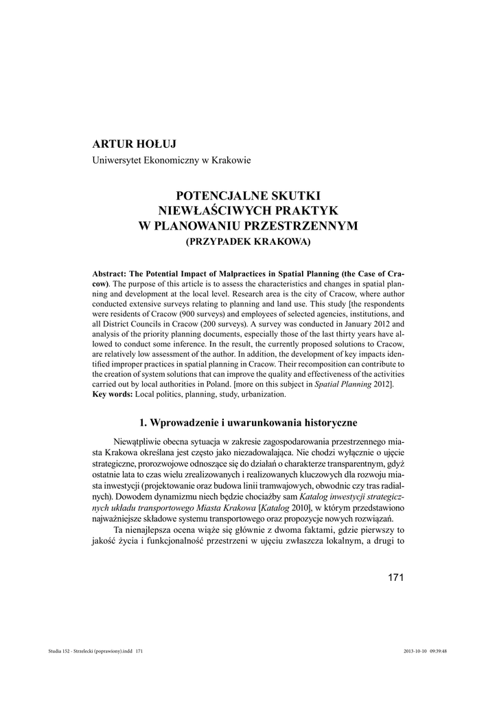 ARTUR HOŁUJ Uniwersytet Ekonomiczny w Krakowie POTENCJALNE SKUTKI NIEWŁAŚCIWYCH PRAKTYK W PLANOWANIU PRZESTRZENNYM (PRZYPADEK KRAKOWA) Abstract: The Potential Impact of Malpractices in Spatial Planning (the Case of Cracow). The purpose of this article is to assess the characteristics and changes in spatial planning and development at the local level. Research area is the city of Cracow, where author conducted extensive surveys relating to planning and land use. This study [the respondents were residents of Cracow (900 surveys) and employees of selected agencies, institutions, and all District Councils in Cracow (200 surveys). A survey was conducted in January 2012 and analysis of the priority planning documents, especially those of the last thirty years have allowed to conduct some inference. In the result, the currently proposed solutions to Cracow, are relatively low assessment of the author. In addition, the development of key impacts identified improper practices in spatial planning in Cracow. Their recomposition can contribute to the creation of system solutions that can improve the quality and effectiveness of the activities carried out by local authorities in Poland. [more on this subject in Spatial Planning 2012]. Key words: Local politics, planning, study, urbanization. 1. Wprowadzenie i uwarunkowania historyczne Niewątpliwie obecna sytuacja w zakresie zagospodarowania przestrzennego miasta Krakowa określana jest często jako niezadowalająca. Nie chodzi wyłącznie o ujęcie strategiczne, prorozwojowe odnoszące się do działań o charakterze transparentnym, gdyż ostatnie lata to czas wielu zrealizowanych i realizowanych kluczowych dla rozwoju miasta inwestycji (projektowanie oraz budowa linii tramwajowych, obwodnic czy tras radialnych). Dowodem dynamizmu niech będzie chociażby sam Katalog inwestycji strategicznych układu transportowego Miasta Krakowa [Katalog 2010], w którym przedstawiono najważniejsze składowe systemu transportowego oraz propozycje nowych rozwiązań. Ta nienajlepsza ocena wiąże się głównie z dwoma faktami, gdzie pierwszy to jakość życia i funkcjonalność przestrzeni w ujęciu zwłaszcza lokalnym, a drugi to 171 Studia 152 - Strzelecki (poprawiony).indd 171 2013-10-10 09:39:48 chaotyczna urbanizacja, ciągła suburbanizacja oraz zauważalna dezurbanizacja Krakowa. Wskazane aspekty koniecznie należy rozpatrywać w ujęciu horyzontalnym odnoszącym się do struktury „długiego trwania”. Analizując niektóre opracowania naukowe ekspertów zajmujących się zagospodarowaniem przestrzennym można dojść do przekonania, że głównym sprawcą tego stanu rzeczy jest problematyczna Ustawa z 2003 r. o planowaniu i zagospodarowaniu przestrzennym. Owszem, przytoczona litera prawa ma wiele rozwiązań predestynujących do wniosków o skutkach niewłaściwego gospodarowania przestrzenią – jednak to ludzie, powołani do postępowania zgodnego przede wszystkim ze zdrowym rozsądkiem i obowiązującymi normami prawnymi powinni stać na straży szeroko rozumianego porządku. Wyartykułowane powyżej rozumowanie, bez stosownego wyjaśnienia byłoby zanadto płytkie, w efekcie czego wnioski końcowe uwzględniające wyłącznie obecne uwarunkowania mogłyby się okazać nieprecyzyjne. Dlatego też poddane krótkiej analizie opisowej będą historyczne warunki sprzyjające, jak i ograniczające rozwój przestrzenny badanego ośrodka miejskiego. Teoretyczna oraz historyczna refleksja nad Krakowem będzie obejmować okres od przełomu lat 70. i 80. ubiegłego stulecia do dzisiaj. Wskazany horyzont czasu zdecydowanie pozwoli uwypuklić zachodzące zmiany w mieście, jednak należy nadmienić, że problematyka realizowanej obecnie polityki przestrzennej Krakowa znalazła swoje częściowe odzwierciedlenie już w planach ogólnych zagospodarowania przestrzennego z lat: 1939, 1949, 1953, 1956, 1958 i 1964. W czerwcu 1977 r. zatwierdzono plan Krakowskiego Zespołu Miejskiego (KZM) (tworzony w latach 1972-1976). Był to okres szczególny, gdyż charakteryzował się pokaźnym tempem rozwoju, w literaturze tamtego okresu można napotkać zapisy mówiące o warunkach szczególnie sprzyjających koniunkturze gospodarczej. [Atlas 1988, plansza 47] Wskazany optymizm uwypuklony był także w samym procesie planowania przestrzennego m.in. przez wyznaczenie w planie nowych terenów inwestycyjnych, zwłaszcza służących poprawie jakości bytowania w przestrzeni miasta. Można powiedzieć, że założenia dokumentu były mocno wyidealizowane, wręcz niemożliwe do wdrożenia m.in. ze względu na domniemaną olbrzymią kapitałochłonność zaproponowanych rozwiązań. Układ przestrzenny planu zdominowany był przez pasmowo-węzłowy system sieci osadniczej oraz linearny system wielkich aglomeracji, którego główną cechą była maksymalizacja wykorzystania środków transportu zbiorowego. W planie KZM zgodnie z zasadami rozwijającego się systemu zaprojektowano pasmo północne Tonie – Nowa Huta oraz południowe: Skawina – Wieliczka – Bodzanów, domknięte terenem śródmieścia. Z przeprowadzonej w latach 1983-1984 analizy realizacji planu Krakowskiego Zespołu Miejskiego wynikało, że udało się z niego wywiązać w znacznym stopniu tylko w zakresie wdrażanego programu mieszkaniowego. Pozostałe aspekty związane z budową infrastruktury technicznej, poprawą infrastruktury społecznej, transportem, ochroną środowiska 172 Studia 152 - Strzelecki (poprawiony).indd 172 2013-10-10 09:40:08 były realizowane w nieznacznym stopniu. Z perspektywy czasu można wyraźnie zauważyć, że tempo rozwoju było zdecydowanie niższe od zakładanego, a prognozowany przyrost naturalny zdecydowanie przeszacowany. Wskazane uwarunkowania wiązały się z koniecznością reorganizacji przyjętych założeń w planie. Sytuacja społeczno-gospodarcza spowodowała, że władze musiały bardzo racjonalnie ująć propozycję rozwoju miasta. Na początku lat 80. rozpoczę