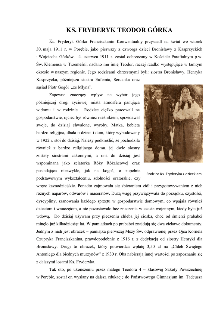 KS. FRYDERYK TEODOR GÓRKA Ks. Fryderyk Górka Franciszkanin Konwentualny przyszedł na świat we wtorek 30. maja 1911 r. w Porębie, jako pierwszy z czworga dzieci Bronisławy z Kasprzyckich i Wojciecha Górków. 4. czerwca 1911 r. został ochrzczony w Kościele Parafialnym p.w. Św. Klemensa w Trzemeśni, nadano mu imię Teodor, raczej rzadko występujące w tamtym okresie w naszym regionie. Jego rodzicami chrzestnymi byli: siostra Bronisławy, Henryka Kasprzycka, późniejsza siostra Eufemia, Sercanka oraz sąsiad Piotr Gogól „ze Młyna”. Zapewne znaczący wpływ na wybór jego późniejszej drogi życiowej miała atmosfera panująca w domu i w rodzinie. Rodzice ciężko pracowali na gospodarstwie, ojciec był również rzeźnikiem, sprzedawał swoje, do dzisiaj chwalone, wyroby. Matka, kobieta bardzo religijna, dbała o dzieci i dom, który wybudowany w 1922 r. stoi do dzisiaj. Należy podkreślić, że pochodziła również z bardzo religijnego domu, jej dwie siostry zostały siostrami zakonnymi, a ona do dzisiaj jest wspominana jako zelatorka Róży Różańcowej oraz posiadająca niezwykłe, jak na kogoś, o zupełnie Rodzice Ks. Fryderyka z dzieckiem podstawowym wykształceniu, zdolności oratorskie, czy wręcz kaznodziejskie. Ponadto zajmowała się zbieraniem ziół i przygotowywaniem z nich różnych naparów, odwarów i maceratów. Dużą wagę przywiązywała do porządku, czystości, dyscypliny, szanowania każdego sprzętu w gospodarstwie domowym, co wpajała również dzieciom i wnuczętom, a nie pozostawało bez znaczenia w czasie wojennym, kiedy była już wdową. Do dzisiaj używam przy pieczeniu chleba jej cioska, choć od śmierci prababci minęło już kilkadziesiąt lat. W pamiątkach po prababci znajdują się dwa ciekawe dokumenty. Jednym z nich jest obrazek – pamiątka pierwszej Mszy Św. odprawionej przez Ojca Kornela Czupryka Franciszkanina, prawdopodobnie z 1916 r. z dedykacją od siostry Henryki dla Bronisławy. Drugi to obrazek, który potwierdza wpłatę 3,50 zł na „Chleb Świętego Antoniego dla biednych murzynów” z 1930 r. Oba nabierają innej wartości po zapoznaniu się z dalszymi losami Ks. Fryderyka. Tak oto, po ukończeniu przez małego Teodora 4 – klasowej Szkoły Powszechnej w Porębie, został on wysłany na dalszą edukację do Państwowego Gimnazjum im. Tadeusza Ksiądz Fryderyk Teodor Górka Kościuszki w Myślenicach. Tam, w roku 1921 rozpoczął naukę w pierwszej klasie. Gospodarzem klasy, do której uczęszczał Teodor był prof. Józef Eliński, polonista, a następnie Ludwik Werschler – germanista oraz poseł na Sejm RP. W pierwszej klasie uczył się takich przedmiotów jak: religia, język polski, geografia, matematyka, przyrodoznawstwo, śpiew, kaligrafia, rysunek odręczny, gimnastyka oraz roboty ręczne, notując na koniec roku szkolnego średnią ocen 4,3 ( w skali od 2 do 5). W latach 1920 – tych myślenickie Gimnazjum dbało również Teodor Górka, 1921 o rozwój kulturalny swoich uczniów. Przy szkole działała m.in. kapela, chór, kółko dramatyczne, harcerstwo. Odbywały się wycieczki m.in. do Krakowa, Zakopanego. Można przypuszczać, że Teodor angażował się w działalność pozalekcyjną, chociaż było to niezwykle trudne i wymagało dobrego zorganizowania. Przez część czasu nauki w Myślenicach mieszkał na stancji, a przez część pokonywał codziennie 8 km odcinek z domu w Porębie do Myślenic piechotą. W kolejnych latach nauki pojawiają się na świadectwach oceny z języka niemieckiego, historii, fizyki i chemii oraz gry na skrzypcach. W 1925 r. 14 – letni Teodor ukończył 4. klasę gimnazjum. Zgromadził potrzebne dokumenty, m.in. takie jak Świadectwo moralności wystawione przez Prefekta Gimnazjum Ks. Antoniego Feliksa, gdzie czytamy: „ (…) pod względem religijno – moralnym zachowywał się zawsze wzorowo. Należał od roku do Sodalicji Mariańskiej uczniów świecąc dobrym innym kolegom przykładem (…)” 11. września opuścił Myślenickie Gimnazjum i rozpoczął naukę w Małym Seminarium OO. Franciszkanów we Lwowie (Gimnazjum Typu Humanistycznego) w klasie czwartej. Można sobie tylko wyobrazić, czym dla 14 – letniego chłopaka, „miernej budowy kośćca” , jak pisze doktor w opinii lekarskiej, był wyjazd do odległego o ponad 300 km miasta. We Lwowie przebywała wówczas na pewno jedna z jego ciotek zakonnic, S. Balbina, pielęgniarka w pawilonach zakaźnych. W 1926 r. ukończył czwartą klasę gimnazjum, klasę piątą rozpoczął w roku 1927 r. Roczna przerwa została prawdopodobnie wykorzystana na odbycie nowicjatu w klasztorze OO. Franciszkanów w Kalwarii Pacławskiej, a od 2 Ksiądz Fryderyk Teodor Górka 22.10.1926 r. w Łagiewnikach koło Łodzi. Był to czas uczenia się życia zakonnego, złożenia pierwszych ślubów oraz obłóczyn. Warto wspomnieć, że w tamtym czasie mistrzem nowicjatu w Prowincji „polskiej” O. Franciszkanów był O. Kornel Czupryk. Po powrocie do szkoły Teodor nosił już swoje zakonne imię: Fryderyk. W Małym Seminarium we Lwowie uczył się dalej w kolejnych klasach, aż do klasy siódmej. W 1930 r. po ukończeniu tej klasy zdał egzaminy do Państwowego Gimnazjum im. Karola Szajnochy we Lwowie i rozpoczął ósmą klasę w tej szkole. W 1931 r. prawdopodobnie złożył swoje uroczyste śluby i rozpoczął studia teologiczne w Wyższym Seminarium w Krakowie. Studiował wspólnie m.in. z O. Konstantynem Zielińskim, późniejszym kapelanem lotnictwa amerykańskiego w czasie II wojny światowej. 23. czerwca 1935 r. Ks. Fryderyk otrzymał święcenia kapłańskie z rąk ówczesnego Arcybiskupa Metropolity Krakowskiego Adama Stefana Sapiehy w Bazylice Ojców Franciszkanów w Krakowie. Niedługo po święceniach Ks. Fryderyk odprawił swoją Mszę Św. prymicyjną w Kościele Parafialnym w Trzemeśni. Było to nie lada wydarzenie dla lokalnej społeczności, a w szczególności dla rodziny. Były życzenia i deklamowane