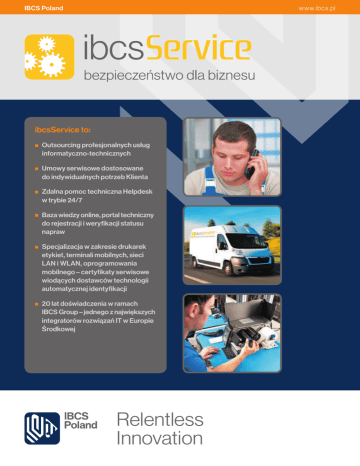 IBCS Poland www.ibcs.pl ibcsService to: nn nn nn nn nn nn Outsourcing profesjonalnych usług informatyczno-technicznych Umowy serwisowe dostosowane do indywidualnych potrzeb Klienta Zdalna pomoc techniczna Helpdesk w trybie 24/7 Baza wiedzy online, portal techniczny do rejestracji i weryfikacji statusu napraw Specjalizacja w zakresie drukarek etykiet, terminali mobilnych, sieci LAN i WLAN, oprogramowania mobilnego – certyfikaty serwisowe wiodących dostawców technologii automatycznej identyfikacji 20 lat doświadczenia w ramach IBCS Group – jednego z największych integratorów rozwiązań IT w Europie Środkowej Relentless Innovation IBCS Poland www.ibcs.pl Usługi serwisowe obejmują rozwiązania z obszaru automatycznej identyfikacji, zarówno własne systemy IT, jak i rozwiązania takich firm jak: Zebra Technologies, Honeywell, Datalogic, Cisco, Sick, DLog, Cognex, Cobalt. W razie potrzeby serwisujemy również rozwiązania innych producentów. W zależności od wybranego planu serwisowego IBCS Poland oferuje różne poziomy ochrony inwestycji w rozwiązania informatyczne: àà Gwarancja standardowa (producenta) – zobowiązanie do usunięcia usterki urząPoziom ochrony – niski dzenia, realizowana po dostarczeniu uszkodzonego sprzętu do siedziby IBCS Poland. Naprawa wykonywana jest bez gwarantowanego skróconego czasu. àà Kontrakt dla oprogramowania – zobowiązanie do serwisowania, utrzymywania Poziom ochrony – średni i rozwijania zakupionego oprogramowania. Zawiera wsparcie serwisowe, wsparcie na poziomie administratora systemu oraz deklarację czasów naprawy dla awarii oprogramowania. àà Kontrakt serwisowy producenta sprzętu – zobowiązanie do ekspresowej naprawy Poziom ochrony – wysoki urządzenia, w zależności od opcji może zawierać wymianę sprzętu na drugi dzień roboczy lub przywracanie do stanu „jak nowy”. Użytkownik samodzielnie obsługuje wysyłkę do naprawy i przywraca konfigurację po powrocie z naprawy od producenta sprzętu. Kontrakt serwisowy obejmuje takie usługi jak: nn wydłużenie gwarancji (do 5 lat) na wady fabryczne nn bezpłatne naprawy usterek związanych z uszkodzeniami mechanicznymi i codzienną eksploatacją urządzeń nn przyspieszone naprawy (1, 3, 5 dni) àà – pakiet usług wspierających kontrakty serwisowe producenta. Zawiera elementy, które chociażby ze względu na bariery językowe nie mogą być Poziom ochrony razem z kontraktem producenta – bardzo wysoki realizowane przez zagraniczne centra serwisowe: nn pomoc telefoniczna dla użytkowników nn obsługa logistyczna i raportowanie nn test i ładowanie baterii, konfiguracja po naprawie nn przywrócenie oprogramowania nn opcjonalnie sprzęt zastępczy na czas naprawy, itp. àà Umowa utrzymania systemu – umowy serwisowe to najlepsza ochrona inwestycji Poziom ochrony – najwyższy Klienta w rozwiązania informatyczne. Zawarcie umowy serwisowej daje pewność objęcia wsparciem całego wdrożonego systemu informatycznego zarówno od strony sprzętowej jak i oprogramowania. Zakres obsługi serwisowej w każdym przypadku jest precyzyjnie określany i dostosowywany do indywidualnych potrzeb i warunków przedsiębiorstwa. Umowa obejmuje usługi oferowane przez nas w ramach kontraktu ibcsPomoc, poszerzone o zakres usług wykonywanych w siedzibie Klienta, zdalny monitoring, szkolenia, przeglądy, itd. Zawarcie umowy pozwala na objęcie całodobową opieką systemu informatycznego zainstalowanego u Klienta. 2 IBCS Poland www.ibcs.pl • Gwarancja sprzętowa • Gwarancja dla oprogramowania Usługi serwisowe IBCS Poland Kontrakt producenta Umowa serwisowa Usługi wspólne dla oprogramowania i sprzętu Portal serwisowy (rejestracja i stan napraw, baza wiedzy, forum) tak Obsługa logistyczna kontraktów producenta Usuwanie wad fabrycznych sprzętu i oprogramowania tak tak tak tak tak tak tak Telefoniczne wsparcie techniczne 8-16 na poziomie administratora tak tak Telefoniczne wsparcie techniczne 8-16 na poziomie użytkownika tak opcja Telefoniczne wsparcie techniczne 24/7 opcja Gwarantowany czas reakcji na zgłoszony problem 4h 3h 2h Możliwość przedłużania warunków serwisowych na kolejne lata tak tak tak Usługi dotyczące tylko oprogramowania Rozwój i stabilizacja oprogramowania (realizacja modyfikacji) tak tak Dostęp do upgrade i update tak tak Naprawa błędów spowodowanych niewłaściwą obsługą tak tak Gwarantowany czas naprawy tak Usługi dotyczące tylko sprzętu Przywracanie wyglądu do stanu nowego tak tak Naprawa uszkodzeń urządzeń spowodowanych niewłaściwą obsługą tak tak Gwarantowany czas naprawy urządzeń tak tak Aktualizacja firmware i software do najnowszych wersji tak opcja tak Urządzenie zastępcze na czas naprawy opcja tak Przywrócenie konfiguracji po naprawie opcja tak Weryfikacja i ładowanie baterii po naprawie opcja tak Zdalna diagnostyka i zarządzanie terminalami i elementami sieci 8-16 tak Zdalna diagnostyka i zarządzanie terminalami i elementami sieci 24/7 opcja Monitoring pracy infrastruktury mobilnej i sieciowej WLAN opcja Weryfikacja pracy sieci LAN/WLAN przy użyciu analizatorów opcja Zarządzanie bezpieczeństwem sieci WLAN (infrastruktura/terminale) opcja Przeglądy urządzeń w siedzibie Klienta opcja opcja Helpdesk Profesjonalna pomoc techniczna świadczona za pośrednictwem telefonu, poczty elektronicznej, Internetu oraz przy użyciu bezpiecznych narzędzi administracyjnych do zdalnego zarządzania oprogramowaniem i urządzeniami IT może rozwiązać większość bieżących problemów administratorów i użytkowników systemów. Jest ona również najtańszą formą sprawowania skutecznej opieki technicznej. Usługa Helpdesk jest stałym elementem umów serwisowych i kontraktów serwisowych ibcsPomoc. Świadczymy usługę w dwóch wariantach: STANDARD (8/5) EXTENDED (24/7) zdalna pomoc techniczna w dni robocze, w godzinach: 800-1600 zdalna pomoc techniczna we wszystkie dni tygodnia, przez całą dobę àà Okr