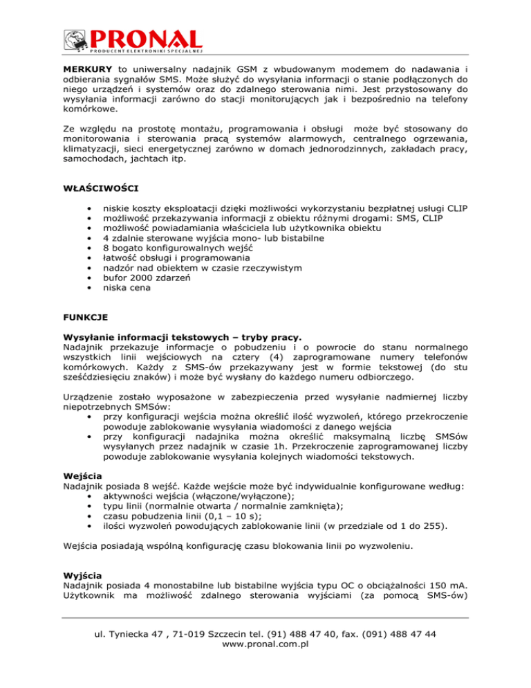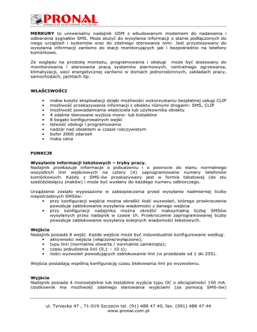MERKURY to uniwersalny nadajnik GSM z wbudowanym modemem do nadawania i odbierania sygnałów SMS. Może służyć do wysyłania informacji o stanie podłączonych do niego urządzeń i systemów oraz do zdalnego sterowania nimi. Jest przystosowany do wysyłania informacji zarówno do stacji monitorujących jak i bezpośrednio na telefony komórkowe. Ze względu na prostotę montażu, programowania i obsługi może być stosowany do monitorowania i sterowania pracą systemów alarmowych, centralnego ogrzewania, klimatyzacji, sieci energetycznej zarówno w domach jednorodzinnych, zakładach pracy, samochodach, jachtach itp. WŁAŚCIWOŚCI • • • • • • • • • niskie koszty eksploatacji dzięki możliwości wykorzystaniu bezpłatnej usługi CLIP możliwość przekazywania informacji z obiektu różnymi drogami: SMS, CLIP możliwość powiadamiania właściciela lub użytkownika obiektu 4 zdalnie sterowane wyjścia mono- lub bistabilne 8 bogato konfigurowalnych wejść łatwość obsługi i programowania nadzór nad obiektem w czasie rzeczywistym bufor 2000 zdarzeń niska cena FUNKCJE Wysyłanie informacji tekstowych – tryby pracy. Nadajnik przekazuje informacje o pobudzeniu i o powrocie do stanu normalnego wszystkich linii wejściowych na cztery (4) zaprogramowane numery telefonów komórkowych. Każdy z SMS-ów przekazywany jest w formie tekstowej (do stu sześćdziesięciu znaków) i może być wysłany do każdego numeru odbiorczego. Urządzenie zostało wyposażone w zabezpieczenia przed wysyłanie nadmiernej liczby niepotrzebnych SMSów: • przy konfiguracji wejścia można określić ilość wyzwoleń, którego przekroczenie powoduje zablokowanie wysyłania wiadomości z danego wejścia • przy konfiguracji nadajnika można określić maksymalną liczbę SMSów wysyłanych przez nadajnik w czasie 1h. Przekroczenie zaprogramowanej liczby powoduje zablokowanie wysyłania kolejnych wiadomości tekstowych. Wejścia Nadajnik posiada 8 wejść. Każde wejście może być indywidualnie konfigurowane według: • aktywności wejścia (włączone/wyłączone); • typu linii (normalnie otwarta / normalnie zamknięta); • czasu pobudzenia linii (0,1 – 10 s); • ilości wyzwoleń powodujących zablokowanie linii (w przedziale od 1 do 255). Wejścia posiadają wspólną konfigurację czasu blokowania linii po wyzwoleniu. Wyjścia Nadajnik posiada 4 monostabilne lub bistabilne wyjścia typu OC o obciążalności 150 mA. Użytkownik ma możliwość zdalnego sterowania wyjściami (za pomocą SMS-ów) ul. Tyniecka 47 , 71-019 Szczecin tel. (91) 488 47 40, fax. (091) 488 47 44 www.pronal.com.pl posługując się kodem dostępu. Do wyjść można podłączyć urządzenia o obciążalności do 150 mA. Programowanie Korzystając z komputerowego programu CENTAUR 2009 (poprzez złącze RS-232) użytkownik ma dostęp do zmiany wszystkich parametrów nadajnika MERKURY. Poprzez SMS-y wysyłane z dowolnego telefonu mamy możliwość zaprogramowania poniższych parametrów nadajnika: • telefonów komórkowych, które są powiadamiane o zdarzeniu • centrum SMS • numeru PIN karty SIM umieszczonej w nadajniku. Automatyczny restart nadajnika Nadajnik MERKURY jest wyposażony w funkcję autodiagnostyki. W nadajniku zostało ustalonych kilkadziesiąt krytycznych punktów funkcjonowania urządzenia. Oprogramowanie samodzielnie ocenia czy wszystkie parametry są dotrzymywane. Jeżeli funkcja autodiagnostyki zarejestruje nieprawidłowe parametry pracy jakiejkolwiek funkcji nadajnika i oceni je jako zagrożenie dla prawidłowego działania całego urządzenia realizuje automatyczny, samoistny restart nadajnika. W czasie restartu ma miejsce ponowna instalacja pierwotnych, zaprogramowanych przez użytkownika ustawień urządzenia. Testy Konfiguracja obejmuje: • aktywację / deaktywację testów • sposobu wysyłania testu (CLIP / SMS) • określenie treści kodu testu • długość CLIP-a (krótki / średni / długi) Interwał wysyłania testu (od 1 min. do 1 miesiąca) jest ustawiany osobno dla SMS i CLIP. Wysyłanie raportów technicznych Urządzenie posiada możliwość wysyłania raportów dotyczących: • niskiego napięcie zasilania • powrotu zasilania do stanu prawidłowego Bufor zdarzeń Nadajnik Merkury posiada własny zegar czasu rzeczywistego. Każde zdarzenie zaistniałe w systemie zostaje zapisane w nieulotnej pamięci EEPROM. Bufor pamięci mieści do 2000 zdarzeń. Przy pomocy programu komputerowego można pobrać dowolną ich ilość przez złącze RS-232. DANE TECHNICZNE • • • • • Napięcie stałe stabilizowane 10,5 -15,0 V Średni pobór prądu (bez dzwonienia) 60 mA Pobór prądu max. (podczas dzwonienia przy słabym zasięgu) 400 mA Temperatura pracy 0 - 50 °C Obciążalność wyjść max 150 mA / 24V DC ul. Tyniecka 47 , 71-019 Szczecin tel. (91) 488 47 40, fax. (091) 488 47 44 www.pronal.com.pl