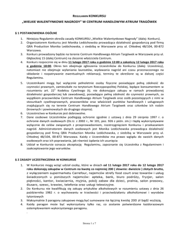 REGULAMIN KONKURSU „WIELKIE WALENTYNKOWE NAGRODY” W CENTRUM HANDLOWYM ATRIUM TRAGÓWEK § 1 POSTANOWIENIA OGÓLNE 1. 2. 3. 4. 5. 6. 7. 8. Niniejszy Regulamin określa zasady KONKURSU „Wielkie Walentynkowe Nagrody” (dalej: Konkurs). Organizatorem Konkursu jest Monika Ledóchowska prowadząca działalność gospodarczą pod firmą QRA Production Monika Ledóchowska, z siedzibą w Warszawie przy ul. Chłodnej 48/104, 00-872 Warszawa. Konkurs prowadzony będzie na terenie Centrum Handlowego Atrium Targówek w Warszawie przy ul. Głębockiej 15 (dalej Centrum) na zlecenie właściciela Centrum. Konkurs rozpocznie się w dniu 11 lutego 2017 roku o godzinie 12:00 a zakończy 12 lutego 2017 roku o godzinie 18:00. Okres ten obejmuje zgłoszenia Uczestników do Konkursu (dalej: Uczestnicy), natomiast nie obejmuje wyłaniania laureatów, wydawania nagród ani czasu przeznaczonego na składanie i rozpatrywanie ewentualnych reklamacji, terminy te określone są w dalszej części Regulaminu. Uczestnikami mogą być wyłącznie pełnoletnie osoby fizyczne posiadające pełną zdolność do czynności prawnych, zamieszkałe na terytorium Rzeczypospolitej Polskiej, będące konsumentem w rozumieniu art. 221 Kodeksu Cywilnego (tj. nie dokonujące zakupu w ramach prowadzonej działalności gospodarczej lub zawodowej), posiadające pełną zdolność do czynności prawnych, za wyjątkiem pracowników Centrum Handlowego Atrium Targówek oraz osób pozostających z nimi w stosunkach cywilnoprawnych, pracowników oraz właścicieli punktów handlowych i usługowych znajdujących się na terenie Centrum Handlowego Atrium Targówek oraz członków ich rodzin (krewnych i powinowatych do drugiego stopnia). Uczestnictwo w Konkursie jest dobrowolne. Dane osobowe Uczestników podlegają ochronie zgodnie z ustawą z dnia 29 sierpnia 1997 r. o ochronie danych osobowych (Dz.U. z 2002 r., Nr 101, poz. 926 z późn. zm.) i będą wykorzystywane wyłącznie do celów związanych z przeprowadzeniem, rozstrzygnięciem Konkursu i przekazaniem nagród. Administratorem danych osobowych jest Monika Ledóchowska prowadząca działalność gospodarczą pod firmą QRA Production Monika Ledóchowska, z siedzibą w Warszawie przy ul. Chłodnej 48/104, 00-872 Warszawa. Każdy z Uczestników ma prawo wglądu do swoich danych osobowych oraz ich poprawiania, jak również żądania ich usunięcia Udział w Konkursie oznacza akceptację Regulaminu, zapoznanie się Uczestnika z Regulaminem i zaakceptowanie jego warunków. § 2 ZASADY UCZESTNICZENIA W KONKURSIE 1. W Konkursie mogą wziąć udział osoby, które w dniach od 11 lutego 2017 roku do 12 lutego 2017 roku dokonają zakupów w Centrum na kwotę co najmniej 200 ( słownie: dwieście ) złotych brutto, z wyłączeniem supermarketu Carrefour, najemców strefy food court oraz towarów i usług świadczonych u poniższych najemców: apteka, bank, biuro podróży, fryzjer, salon piękności, kantor, kwiaciarnia, myjnia, pokój zabaw dla dzieci, pralnia, salon prasowy, ślusarz, szewc, krawiec, telefonia oraz usługi telewizyjne. 2. 3. 4. Do Konkursu nie kwalifikują się zakupy artykułów alkoholowych w rozumieniu ustawy z dnia 26 października 1982 r. o wychowaniu w trzeźwości i przeciwdziałaniu alkoholizmowi i wyrobów tytoniowych Maksymalnie 3 paragony zakupowe mogą być sumowane na łączną kwotę 200 zł bądź wyższą. Każdy paragon może być wykorzystany tylko raz, co zostanie potwierdzone każdorazowym ostemplowaniem wykorzystanego paragonu. . Strona 1 z 7 § 3 ZADANIE KONKURSOWE 1. 2. 3. 4. 5. 6. Zadaniem Uczestnika jest oszacowanie ilości serc umieszczonych na terenie Centrum Handlowego Atrium Targówek z wyłączeniem parkingów, toalet, przejść oraz pomieszczeń służbowych i wind. Wpisanie tej ilości na kuponie Konkursowym oraz dodatkowo podanie nazw dwóch salonów w których znalazł serca. Wzór kuponu oraz ukrytych serc stanowi załącznik Nr 1 do Regulaminu. Zgłoszenie udziału w zadaniu konkursowym polega na wrzuceniu do urny przy Punkcie Obsługi Klienta znajdującym się pod kopułą w Centrum w terminie od dnia 11 luty 2017 roku od godziny 12:00 – 18:00 do dnia 12 luty 2017 roku od godziny 12:00 do godziny 18:00 prawidłowo wypełnionego kuponu konkursowego zawierającego odpowiedź na pytanie: W Galerii znajduje się ……. serc. Podaj nazwy dwóch najemców u których je odnalazłeś……………, wypełnionego danymi osobowymi Uczestnika (imię, nazwisko, adres zameldowania (zgodny z dowodem tożsamości Uczestnika), adres e-mail, nr telefonu (jeśli posiada) i podpisanego przez Uczestnika. Podpis oznacza akceptację zasad niniejszego Regulaminu oraz wyrażenie zgody przez Uczestnika na przetwarzanie jego danych osobowych przez Organizatora Konkursu do celów związanych z niniejszym Konkursem. W Konkursie można zgłosić udział w zadaniu konkursowym tyle razy, ile razy spełnia się warunki Konkursu. Zakupy za wielokrotność 200 (dwustu) złotych brutto upoważniają do otrzymania odpowiedniej ilości kuponów konkursowych. Kupony konkursowe wydawane będą w dniach od 11 lutego 2017 roku od godziny 12:00 do godziny 18:00 a w dniu 12 lutego 2016 roku do godziny 18:00, przez pracowników Organizatora przy Punkcie Obsługi Klienta. Pracownik Organizatora stempluje paragony, oraz kupon konkursowy, w celu uniemożliwienia ich ponownego użycia w Konkursie. Pracownik Organizatora odnotowuje datę i godzinę wydania kuponu konkursowego danemu Uczestnikowi Konkursu do protokołu. Rozstrzygnięcie Konkursu nastąpi w dniu 12 lutego 2017 r. o godzinie 18:30 przy Punkcie Obsługi Klienta pod kopułą Centrum. Laureatem Konkursu zostanie osoba, która na kuponie konkursowym podała najbliższą ilość serc oraz prawidłowo wskazała dwóch najemców u których je znalazła. Jeden Uczestnik Konkursu może wygrać jedną nagrodę. W przypadku, gdy kilku Uczestników podało taką samą odpowiedź na kuponie konkursowym, Laureatem zostanie oso