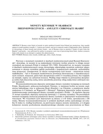 FOLIA NUMISMATICA 29/1 Supplementum ad Acta Musei Moraviae Scientiae sociales C 2015/Studie MONETY RZYMSKIE W SKARBACH ŚREDNIOWIECZNYCH – AMULETY CHRONIĄCE SKARB? DRAGAN MILUTINOVIĆ Instytut Archeologii Uniwersytetu Wrocławskiego ABSTRACT: Roman coins finds in hoards in early medieval hoards from Poland are mysterious, they usually appear in small numbers (usually 1–2 pieces per hoard), and are in majority made of high-quality silver. Similarity in chronology of these hoards and certain rituals – use of Roman coins as amulets (“heads of saint John the Baptist”) and pecks – was sufficient for author to propose a new way of perceiving these finds. Author connects finds with rituals in an attempt to explain this phenomenon. KEY WORDS: Roman coins, hoards, middle ages, silver, rituals, Europe. Pierwszy o monetach rzymskich w skarbach średniowiecznych pisał Ryszard Kiersnowski1, dowodząc, że monety te są znaleziskami wtórnymi (wobec przerwy w obiegu monet rzymskich ma terenach Polski w wiekach VII i VIII). Stwierdził też, że monety rzymskie w skarbach średniowiecznych swoją chronologią odpowiadają monetom srebrnym zdeponowanym w okresie rzymskim (gdyby pochodziły z pojedynczych znalezisk, zachodziłyby inne proporcje). Zasugerował, że obszar występowania tych monet – mianowicie tereny nadbałtyckie – był w wczesnym średniowieczu prowincją ekonomiczną o charakterystycznych cechach, miejscem, gdzie było akceptowane srebro w wszelkiej postaci, bez względu na stemple, napisy czy zawartość kruszcu. Według niego właśnie ta powszechna akceptacja srebra była kluczową cechą, która umożliwiła ponowny obieg małej ilości srebrnych monet rzymskich. Wczesnośredniowieczne depozyty zawierające denary rzymskie występują na terenach Polski, Skandynawii, północno-wschodnich Niemiec, w mniejszej liczbie na terenie osadnictwa bałtyjskiego oraz w północnej Rosji (Karelia) i na Ukrainie, a pojedyncze skarby znaleziono w Czechach, na Węgrzech2 i Słowacji3. Najwięcej depozytów srebra wczesnośredniowiecznego zawierających denary rzymskie pochodzi z Polski – 36 skarbów (łącznie 51 monet rzymskich, depozyty zazwyczaj zawierają 1–2 monety rzymskie). Na pozostałych terenach występują zazwyczaj pojedyncze denary rzymskie w depozytach wczesnośredniowiecznych. We wszystkich tych depozytach są denary z I–II wieku, sporadycznie z III wieku. Monety wczesnośredniowieczne w polskich skarbach srebra zachodniego od schyłku X wieku to, według liczebności, na pierwszym miejscu monety niemieckie, a w drugiej kolejności monety pochodzenia skandynawskiego (duńskie oraz przywiezione ze Skan1 2 3 Kiersnowski R. 1958: Monety rzymskie w polskich znaleziskach wczesnośredniowiecznych [w:] Wiadomości Numizmatyczne, R. II, s. 5–14. T. Kühtreiber, B. Prokisch, Der Schatzfund von Fuchsenhof, 2004, Linz. Stanowisko grobowe zawierające cztery denary rzymskie (z dwiema dziurkami każdy). Zobacz: Kolnikova E., K sekundarnemu pouzivaniu rimskych minci na Slovensku. [w:] Numismaticke listy XXVIII, 1973, 129–137, zwłaszcza s. 134, 135. 31
