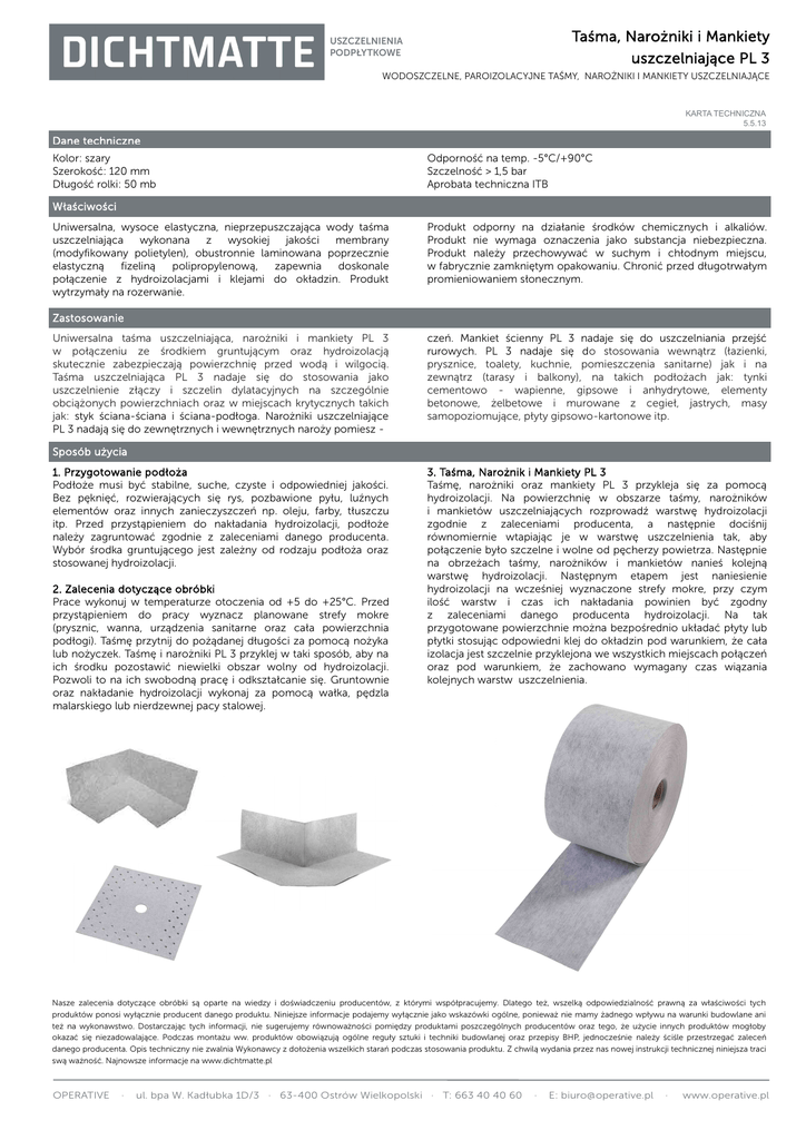 Taśma, Narożniki i Mankiety uszczelniające PL 3 USZCZELNIENIA PODPŁYTKOWE WODOSZCZELNE, PAROIZOLACYJNE TAŚMY, NAROŻNIKI I MANKIETY USZCZELNIAJĄCE KARTA TECHNICZNA 5.5.13 Dane techniczne Kolor: szary Szerokość: 120 mm Długość rolki: 50 mb Odporność na temp. -5°C/+90°C Szczelność > 1,5 bar Aprobata techniczna ITB Właściwości Uniwersalna, wysoce elastyczna, nieprzepuszczająca wody taśma uszczelniająca wykonana z wysokiej jakości membrany (modyfikowany polietylen), obustronnie laminowana poprzecznie elastyczną fizeliną polipropylenową, zapewnia doskonale połączenie z hydroizolacjami i klejami do okładzin. Produkt wytrzymały na rozerwanie. Produkt odporny na działanie środków chemicznych i alkaliów. Produkt nie wymaga oznaczenia jako substancja niebezpieczna. Produkt należy przechowywać w suchym i chłodnym miejscu, w fabrycznie zamkniętym opakowaniu. Chronić przed długotrwałym promieniowaniem słonecznym. Zastosowanie Uniwersalna taśma uszczelniająca, narożniki i mankiety PL 3 w połączeniu ze środkiem gruntującym oraz hydroizolacją skutecznie zabezpieczają powierzchnię przed wodą i wilgocią. Taśma uszczelniająca PL 3 nadaje się do stosowania jako uszczelnienie złączy i szczelin dylatacyjnych na szczególnie obciążonych powierzchniach oraz w miejscach krytycznych takich jak: styk ściana-ściana i ściana-podłoga. Narożniki uszczelniające PL 3 nadają się do zewnętrznych i wewnętrznych naroży pomiesz - czeń. Mankiet ścienny PL 3 nadaje się do uszczelniania przejść rurowych. PL 3 nadaje się do stosowania wewnątrz (łazienki, prysznice, toalety, kuchnie, pomieszczenia sanitarne) jak i na zewnątrz (tarasy i balkony), na takich podłożach jak: tynki cementowo - wapienne, gipsowe i anhydrytowe, elementy betonowe, żelbetowe i murowane z cegieł, jastrych, masy samopoziomujące, płyty gipsowo-kartonowe itp. Sposób użycia 1. Przygotowanie podłoża Podłoże musi być stabilne, suche, czyste i odpowiedniej jakości. Bez pęknięć, rozwierających się rys, pozbawione pyłu, luźnych elementów oraz innych zanieczyszczeń np. oleju, farby, tłuszczu itp. Przed przystąpieniem do nakładania hydroizolacji, podłoże należy zagruntować zgodnie z zaleceniami danego producenta. Wybór środka gruntującego jest zależny od rodzaju podłoża oraz stosowanej hydroizolacji. 2. Zalecenia dotyczące obróbki Prace wykonuj w temperaturze otoczenia od +5 do +25°C. Przed przystąpieniem do pracy wyznacz planowane strefy mokre (prysznic, wanna, urządzenia sanitarne oraz cała powierzchnia podłogi). Taśmę przytnij do pożądanej długości za pomocą nożyka lub nożyczek. Taśmę i narożniki PL 3 przyklej w taki sposób, aby na ich środku pozostawić niewielki obszar wolny od hydroizolacji. Pozwoli to na ich swobodną pracę i odkształcanie się. Gruntownie oraz nakładanie hydroizolacji wykonaj za pomocą wałka, pędzla malarskiego lub nierdzewnej pacy stalowej. 3. Taśma, Narożnik i Mankiety PL 3 Taśmę, narożniki oraz mankiety PL 3 przykleja się za pomocą hydroizolacji. Na powierzchnię w obszarze taśmy, narożników i mankietów uszczelniających rozprowadź warstwę hydroizolacji zgodnie z zaleceniami producenta, a następnie dociśnij równomiernie wtapiając je w warstwę uszczelnienia tak, aby połączenie było szczelne i wolne od pęcherzy powietrza. Następnie na obrzeżach taśmy, narożników i mankietów nanieś kolejną warstwę hydroizolacji. Następnym etapem jest naniesienie hydroizolacji na wcześniej wyznaczone strefy mokre, przy czym ilość warstw i czas ich nakładania powinien być zgodny z zaleceniami danego producenta hydroizolacji. Na tak przygotowane powierzchnie można bezpośrednio układać płyty lub płytki stosując odpowiedni klej do okładzin pod warunkiem, że cała izolacja jest szczelnie przyklejona we wszystkich miejscach połączeń oraz pod warunkiem, że zachowano wymagany czas wiązania kolejnych warstw uszczelnienia. Nasze zalecenia dotyczące obróbki są oparte na wiedzy i doświadczeniu producentów, z którymi współpracujemy. Dlatego też, wszelką odpowiedzialność prawną za właściwości tych produktów ponosi wyłącznie producent danego produktu. Niniejsze informacje podajemy wyłącznie jako wskazówki ogólne, ponieważ nie mamy żadnego wpływu na warunki budowlane ani też na wykonawstwo. Dostarczając tych informacji, nie sugerujemy równoważności pomiędzy produktami poszczególnych producentów oraz tego, że użycie innych produktów mogłoby okazać się niezadowalające. Podczas montażu ww. produktów obowiązują ogólne reguły sztuki i techniki budowlanej oraz przepisy BHP, jednocześnie należy ściśle przestrzegać zaleceń danego producenta. Opis techniczny nie zwalnia Wykonawcy z dołożenia wszelkich starań podczas stosowania produktu. Z chwilą wydania przez nas nowej instrukcji technicznej niniejsza traci swą ważność. Najnowsze informacje na www.dichtmatte.pl OPERATIVE · ul. bpa W. Kadłubka 1D/3 · 63-400 Ostrów Wielkopolski · T: 663 40 40 60 · E: [email protected] · www.operative.pl