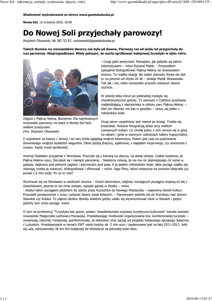 Nowa Sól - informacje, artykuły, wydarzenia, zdjęcia, video. 1z1 http://www.gazetalubuska.pl/apps/pbcs.dll/article?AID=/20100912/P... Wiadomość wydrukowana ze strony www.gazetalubuska.pl Nowa Sól, 12 września 2010, 19:00 Do Nowej Soli przyjechały parowozy! Wojciech Olszewski, 68 387 52 87, [email protected] Takich tłumów na nowosolskim dworcu nie było od dawna. Pierwszy raz od wielu lat przyjechały do nas parowozy. Nieprzypadkowo. Miały pokazać, że warto spróbować kolejowej turystyki w stylu retro. - Czuję jakiś sentyment. Pamiętam, jak jeździło się takimi lokomotywami – mówi Ryszard Małek. - Przyszedłem specjalnie sfotografować Piękną Helenę na nowosolskim dworcu. To rzadka okazja. Bo żaden parowóz chyba nie stał tu na peronie od chyba 20 lat – dodaje Marek Straszewski. Tak jak i oni, wielu nowosolan przyszło zobaczyć dawne ciuchcie. W sobotę kilka minut po jedenastej rozległy się charakterystyczne gwizdy. To parowóz z Cotttbus pozdrawia nadjeżdżającą z naprzeciwka w obłoku pary Piękną Helenę. – Ależ ten Niemiec ma bas w gwizdku – cieszy się jeden z miłośników kolei. Zdjęcie z Piękną Heleną. Bezcenne. Dla najmłodszych nowosolan parowozy na stacji w Nowej Soli były wielkim przeżyciem. (Fot. Wojciech Olszewski) Drugi peron wypełniony jest niemal po brzegi. Trzeba się przeciskać. Rodzice fotografują dzieci przy wielkich czerwonych kołach. Co chwilę jedno z nich wznosi się w górę na rękach i ginie w ciemnych czeluściach kabiny maszynistów. Z wypiekami na twarzy z emocji i od żaru kotła oglądają wnętrze lokomotyw. Potem jest czas na podziwianie drewnianego wnętrza stuletnich wagonów. Obok jeżdżą drezyny, spalinowa, z napędem moja-twoja, czy stworzona z roweru. Każdy może spróbować. Andrzej Mastalerz przyjechał z Wrocławia. Przyczaił się z kamerą na uboczu, na starej rampie. Czekał cierpliwie, aż Piękna Helena ruszy. Doczekał się i nakręcił panoramę. - Niektórzy mówią, że nie ma nic piękniejszego niż konie w galopie, żaglowce pod pełnymi żaglami i parowozów pod parą. A ja jestem miłośnikiem kolei, takie pociągi rzadko się zdarzają, trzeba je zobaczyć, sfotografować i sfilmować – mówi. Jego filmy, które umieszcza na youtube obejrzało już ponad 1,5 mln osób. Po co to robi? Wychował się we Wrocławiu w okolicach dworca. - Gwizd lokomotyw, odgłosy ruszających pociągów kojarzą mi się z dzieciństwem, pewnie to we mnie zostało, wpisało gdzieś w środku – mówi. - Kiedyś takim pociągiem jeździłem do szkoły przez Kożuchów do Nowego Miasteczka – wspomina Daniel Kołtun. Przyszedł powspominać z żoną i pokazać dawny świat dzieciom. – Parowozami jeździło się do Konotopu nad Jezioro Sławskie czy Kolska. To piękne okolice. Byłoby świetnie gdyby udało się wyremontować most w Stanach i gdyby jeździły tam znów pociągi- mówi. O tym na konferencji "Turystyka bez granic, polsko- brandenburskie wyprawy turystyczno-kulturowe” mówiła starosta nowosolski Małgorzata Lachowicz-Murawska. Przedstawiając możliwości organizowania tzw. kombinowanej turystyki – rowerowej, rzecznej i kolejowej, poinformowała, że starostwo chce zacząć od projektu kolejowego łączącego Saksonię z Lubuskim. Przedsięwzięcie w ramach EWT warte byłoby ok. 2 mln euro i zaplanowane jest na lata 2011-2012. Jeśli się uda, odnowionoby 36 km linii kolejowej do Wolsztyna na potrzebę kolei retro. 2010-09-13 07:37