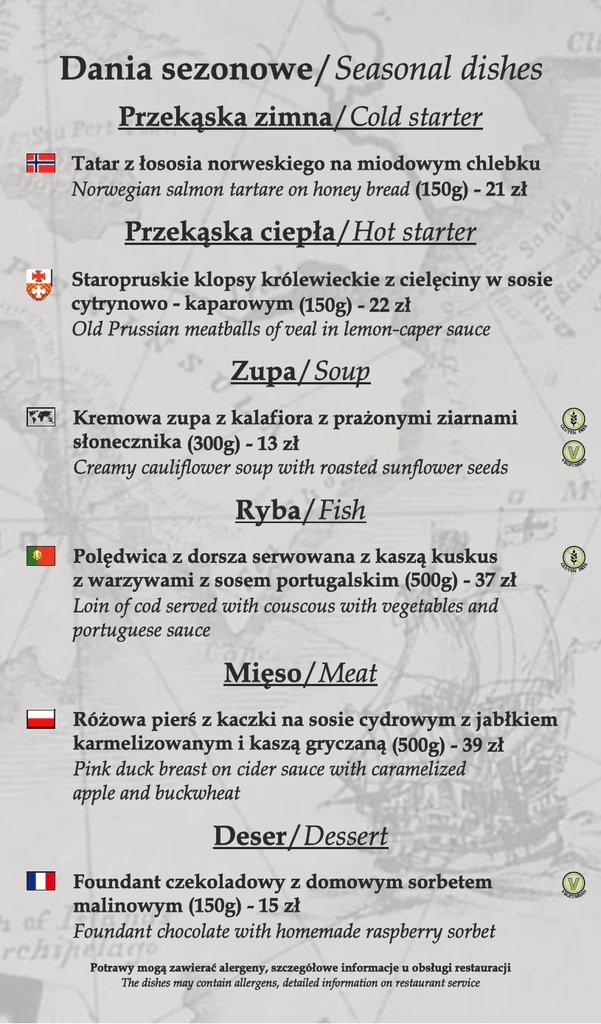 Dania sezonowe/Seasonal dishes Przekąska zimna/Cold starter Tatar z łososia norweskiego na miodowym chlebku Norwegian salmon tartare on honey bread (150g) - 21 zł Przekąska ciepła/Hot starter Staropruskie klopsy królewieckie z cielęciny w sosie cytrynowo - kaparowym (150g) - 22 zł Old Prussian meatballs of veal in lemon-caper sauce Zupa/Soup Kremowa zupa z kalafiora z prażonymi ziarnami słonecznika (300g) - 13 zł Creamy cauliflower soup with roasted sunflower seeds Ryba/Fish Polędwica z dorsza serwowana z kaszą kuskus z warzywami z sosem portugalskim (500g) - 37 zł Loin of cod served with couscous with vegetables and portuguese sauce Mięso/Meat Różowa pierś z kaczki na sosie cydrowym z jabłkiem karmelizowanym i kaszą gryczaną (500g) - 39 zł Pink duck breast on cider sauce with caramelized apple and buckwheat Deser/Dessert Foundant czekoladowy z domowym sorbetem malinowym (150g) - 15 zł Foundant chocolate with homemade raspberry sorbet Potrawy mogą zawierać alergeny, szczegółowe informacje u obsługi restauracji The dishes may contain allergens, detailed information on restaurant service Zapraszamy Wtorek - Niedziela Tuesday - Sunday 11:00 - 22:00 Restauracja MAPA ul. Rzeźnicka 4-6/A 82-300 Elbląg Polska Tel.: +48 696 899 750 [email protected] www.restauracjamapa.pl Przekąski zimne/Cold starters Carpaccio z czerwonego buraka, serem dojrzewającym i orzechami (120g) - 14 zł Beetroot carpaccio with ripened cheese and nuts Siekany tatar wołowy (130g) - 25 zł Chopped beef tartare Przekąski ciepłe/Hot starters Krewetki na maśle z białym winem serwowane z kompozycją sałat (6 szt. / pcs. - 150g) - 28 zł Butter prawns with white wine served with selection of salads Grzanki ze szpinakiem, serem feta i jajem w koszulce skropione oliwą truflową (150g) - 14 zł Poached egg on toast with spinach and feta cheese with truffle olive oil Krewetki serwowane na salsie paprykowej z rukolą (6 szt. / pcs. - 150 g) - 25 zł Prawns served on pepper salsa with rocket salad Potrawy mogą zawierać alergeny, szczegółowe informacje u obsługi restauracji The dishes may contain allergens, detailed information on restaurant service Zupy/Soups Ciorba do perisoare - rumuńska zupa na zakwasie z klopsikami mięsnymi (300g) - 12 zł Romanian sourdough soup with meatballs Zupa rybna (300g) - 15 zł Fish soup Krem z pomidorów (300g) - 11zł Tomato cream soup Sałaty/Salads Sałata Cezar z kurczakiem (200g) - 19zł Chicken Caesar Salad Sałatka Tabbouleh – kasza kuskus z dodatkiem cebuli, ogórka świeżego i czerwonej papryki serwowana na grillowanej cukinii (200g) - 19zł Tabbouleh salad - couscous with onions, fresh cucumber and red peppers served on grilled zucchini Sałata z marynowaną gruszką, serem gorgonzola i orzechami z dresingiem malinowym (200g) - 19zł Marinated pear salad with gorgonzola cheese, nuts and raspberry sauce Potrawy mogą zawierać alergeny, szczegółowe informacje u obsługi restauracji The dishes may contain allergens, detailed information on restaurant service Ryby/Fish Sandacz z bekonem w sosie porowym serwowany z kaszą gryczaną i fasolą szparagową (500g) - 37 zł Zander with becon in leek sauce served with buckwheat and string-bean Łosoś ze szpinakiem, serem feta zapiekany w cieście francuskim z kompozycja sałat (400g) - 35 zł Salmon with spinach and feta cheese baked in puff pastry with fresh vegetable salad Potrawy mogą zawierać alergeny, szczegółowe informacje u obsługi restauracji The dishes may contain allergens, detailed information on restaurant service Mięso/Meat Poliki wołowe duszone w czerwonym winie, podane w sosie własnym z burakiem karmelizowanym oraz ziemniakami tłuczonymi (500g) - 35 zł Beef cheeks braised in red wine, served with sauce, caramelized beetroot and mashed potatoes Grillowana pierś z kurczaka z ziemniakami opiekanymi i kompozycją sałat (500g) - 20 zł Grilled chicken breast with roast potatoes and fresh vegetable salad Polędwiczki wieprzowe w sosie jabłkowym z kopytkami ze szpinakiem i marchewką na ciepło (500g) - 28 zł Pork tenderloin in apple sauce with spinach potato dumplings and warm carrots Stek z polędwicy wołowej podany z domowymi frytami i kompozycją sałat (500g) - 57 zł Beef sirloin steak with homemade chips and fresh vegetable salad Tradycyjny kotlet schabowy na kiszonej kapuście zasmażanej z ziemniakami tłuczonymi (500g) - 24 zł Traditional pork chop on pickled fried cabbage with mashed potatoes Potrawy mogą zawierać alergeny, szczegółowe informacje u obsługi restauracji The dishes may contain allergens, detailed information on restaurant service Makarony/Pasta Spaghetti z krewetkami, pomidorami, oliwkami i rukolą (350g) - 28 zł Spaghetti with prawns, tomato, olives and rocket salad Penne z kurczakiem, suszonymi pomidorami i cukinią w sosie śmietanowym z serem feta (350g) - 23 zł Penne with chicken, dried tomatoes and courgette in creamy sauce with feta cheese Dania dla dzieci /Kids menu Kurczak w panierce z domowymi frytkami i marchewką na ciepło (150g) - 13 zł Chicken breast with homemade chips and warm carrots Spaghetti z klopsikami mięsnymi w sosie pomidorowym (150g) - 14 zł Spaghetti with meatballs in tomato sauce Potrawy mogą zawierać alergeny, szczegółowe informacje u obsługi restauracji The dishes may contain allergens, detailed information on restaurant service Desery/Desserts Hiszpański flan z musem brzoskwiniowym i kruszonką (150g) - 12 zł Spanish flan with peach mousse and crumble Deser Pavlova - beza z owocowym kremem mascarpone (150g) - 13 zł Pavlova dessert - meringue with fruit mascarpone cream Napoje ciepłe/Hot drinks Kawa / Coffee Espresso (30ml) - 6 zł Espresso Doppio (60ml) - 10 zł Caffe crema (150ml) - 6 zł Cappuccino (150ml) - 8 zł Latte macchiato (200ml) - 10 zł Herbata / Tea Czarna, Earl Grey, zielona, owocowa (300ml) - 6 zł Black, Earl Grey, green, fruits (300ml) Herbata z pomarańczą, goździkami i syropem malino