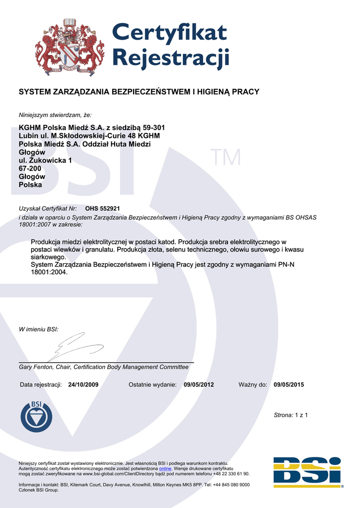 SYSTEM ZARZĄDZANIA BEZPIECZEŃSTWEM I HIGIENĄ PRACY Niniejszym stwierdzam, że: KGHM Polska Miedź S.A. z siedzibą 59-301 Lubin ul. M.Skłodowskiej-Curie 48 KGHM Polska Miedź S.A. Oddział Huta Miedzi Głogów ul. Żukowicka 1 67-200 Głogów Polska Uzyskał Certyfikat Nr: OHS 552921 i działa w oparciu o System Zarządzania Bezpieczeństwem i Higieną Pracy zgodny z wymaganiami BS OHSAS 18001:2007 w zakresie: Produkcja miedzi elektrolitycznej w postaci katod. Produkcja srebra elektrolitycznego w postaci wlewków i granulatu. Produkcja złota, selenu technicznego, ołowiu surowego i kwasu siarkowego. System Zarządzania Bezpieczeństwem i Higieną Pracy jest zgodny z wymaganiami PN-N 18001:2004. W imieniu BSI: Gary Fenton, Chair, Certification Body Management Committee Data rejestracji: 24/10/2009 Ostatnie wydanie: 09/05/2012 Ważny do: 09/05/2015 Strona: 1 z 1 Niniejszy certyfikat został wystawiony elektronicznie. Jest własnością BSI i podlega warunkom kontraktu. Autentyczność certyfikatu elektronicznego może zostać potwierdzona online. Wersje drukowane certyfikatu mogą zostać zweryfikowane na www.bsi-global.com/ClientDirectory bądź pod numerem telefonu +48 22 330 61 90. Informacje i kontakt: BSI, Kitemark Court, Davy Avenue, Knowlhill, Milton Keynes MK5 8PP. Tel: +44 845 080 9000 Członek BSI Group.