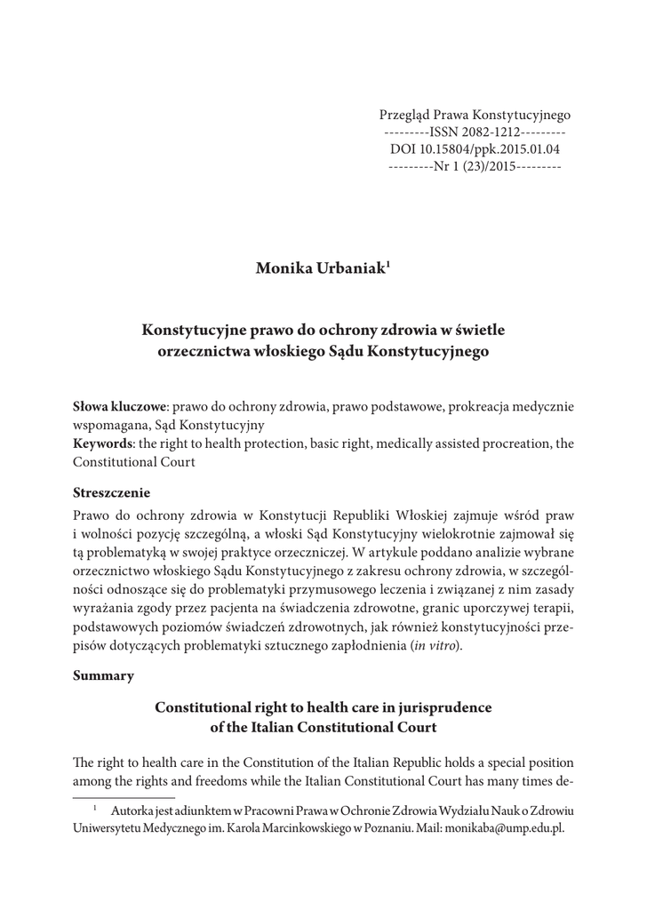 Przegląd Prawa Konstytucyjnego ---------ISSN 2082-1212--------DOI 10.15804/ppk.2015.01.04 ---------Nr 1 (23)/2015--------- Monika Urbaniak1 Konstytucyjne prawo do ochrony zdrowia w świetle orzecznictwa włoskiego Sądu Konstytucyjnego Słowa kluczowe: prawo do ochrony zdrowia, prawo podstawowe, prokreacja medycznie wspomagana, Sąd Konstytucyjny Keywords: the right to health protection, basic right, medically assisted procreation, the Constitutional Court Streszczenie Prawo do ochrony zdrowia w Konstytucji Republiki Włoskiej zajmuje wśród praw i wolności pozycję szczególną, a włoski Sąd Konstytucyjny wielokrotnie zajmował się tą problematyką w swojej praktyce orzeczniczej. W artykule poddano analizie wybrane orzecznictwo włoskiego Sądu Konstytucyjnego z zakresu ochrony zdrowia, w szczególności odnoszące się do problematyki przymusowego leczenia i związanej z nim zasady wyrażania zgody przez pacjenta na świadczenia zdrowotne, granic uporczywej terapii, podstawowych poziomów świadczeń zdrowotnych, jak również konstytucyjności przepisów dotyczących problematyki sztucznego zapłodnienia (in vitro). Summary Constitutional right to health care in jurisprudence of the Italian Constitutional Court The right to health care in the Constitution of the Italian Republic holds a special position among the rights and freedoms while the Italian Constitutional Court has many times de1 Autorka jest adiunktem w Pracowni Prawa w Ochronie Zdrowia Wydziału Nauk o Zdrowiu Uniwersytetu Medycznego im. Karola Marcinkowskiego w Poznaniu. Mail: [email protected]. PRZEGLĄD PRAWA KONSTYTUCYJNEGO 2015/1 72 alt with this problem in its judicial practice. The article focuses on the analysis of the selected case law of the Italian Constitutional Court in relation to health care, in particular the one relating to the issue of involuntary treatment and the principle of patient consent to health care, the limits of forced medical treatment, basic levels of health services as well as the constitutionality of the regulations relating to the issue of artificial fertilization (in vitro). * Prawo do ochrony zdrowia w Konstytucji Republiki Włoskiej zajmuje pozycję szczególną. Zostało ono wyrażone w art. 32 włoskiej Konstytucji z dnia 27 grudnia 1947 r. w części pierwszej Konstytucji w tytule II i należy do kategorii stosunków moralno-społecznych. Prawo to należy zaliczyć do katalogu praw podstawowych, stanowiących wartość nadrzędną nad innymi prawami. Pozwala ono jednostce korzystać z pozostałych praw konstytucyjnych2. Zgodnie z treścią artykułu 32 Konstytucji Republika zapewnia ochronę zdrowia jako podstawowego prawa zarówno jednostki, jak i interesu zbiorowego oraz gwarantuje bezpłatną opiekę ubogim. Konstytucja ujmuje prawo do ochrony zdrowia zarówno jako tradycyjne prawo wolnościowe, jak również jako prawo socjalne3, które zakłada obowiązek władz państwa do wykonywania świadczeń pozytywnych poprzez określenie istotnych poziomów świadczeń, które mają być zagwarantowane w sposób jednolity na terytorium całego państwa. Pomimo wejścia w życie Konstytucji w dniu 1 stycznia 1948 r. system ochrony zdrowia przez okres następnych trzydziestu lat pozostawał uregulowany w sposób fragmentaryczny. Dopiero ustawa 1978/8334 zagwarantowała wszystkim dostęp do usług opieki zdrowotnej na równych zasadach, bez dyskryminacji ze względu na rasę, płeć, religię, wiek, warunki ekonomiczne i warunki pracy5. Podkreślić w tym miejscu należy istotną rolę włoskiego M. Urbaniak, Prawo do ochrony zdrowia w Konstytucji Republiki Włoskiej, „Prawo i Medycyna” 2009, nr 1, s. 45 i n. 3 M. Urbaniak, Konstytucyjne wolności i prawa socjalne oraz ekonomiczne w Polsce i we Włoszech. Analiza prawnoporównawcza, Toruń 2009. 4 Legge del 23 dicembre 1978, n. 833 (Gazz. Uff. del 28 dicembre 1978, n. 360). 5 B. C. Rubertini, Giustizia sociale e diritto alla salute per tutti, „Inchiesta luglio settembre” 2009, nr 172, s. 47. 2 Monika Urbaniak • Konstytucyjne prawo do ochrony zdrowia w świetle... 73 Sądu Konstytucyjnego, który poprzez linię orzeczniczą wpływał na kształtowanie jednolitości stosowania konstytucyjnego prawa do ochrony zdrowia przez sądy. Sąd Konstytucyjny Włoch stanowi bardzo ważny instrument kontroli zgodności ustaw z konstytucją oraz posiada wyłączne uprawnienie do rozstrzygania sporów kompetencyjnych pomiędzy organami państwa, pomiędzy państwem a regionami oraz pomiędzy regionami6. Na marginesie niniejszych rozważań zauważyć należy, że pomimo tego, iż Sąd Konstytucyjny został powołany do życia już z chwilą wejścia konstytucji w życie, to faktycznie rozpoczął działalność dopiero 8 lat później7. Celem niniejszego opracowania jest analiza dorobku orzecznictwa włoskiego Sądu Konstytucyjnego dotyczącego prawa do ochrony zdrowia. Wybrane orzeczenia prezentują linię orzeczniczą w wybranych obszarach, w szczególności dotyczących problematyki przymusowego leczenia i związanej z nią zasady wyrażania i niewyrażania zgody przez pacjenta na świadczenia zdrowotne, granic uporczywej terapii, podstawowych poziomów świadczeń zdrowotnych, jak również konstytucyjności przepisów dotyczących problematyki sztucznego zapłodnienia (in vitro). Włoska doktryna konstytucyjna od dawna zajmowała się problematyką prawa do ochrony zdrowia. Z utrwalonego orzecznictwa włoskiego Sądu Konstytucyjnego wynika, że konstytucyjne prawo do ochrony zdrowia gwarantowane w art. 32 Konstytucji jest zaliczane do praw podstawowych. Sąd Konstytucyjny w dniu 26 lipca 1979 r.8 uznał, że „prawo wyrażone w art. 32 Konstytucji podlega ochronie nie tylko jako interes zbiorowości, ale również jako podstawowe prawo jednostki i stanowi prawo o charakterze pierwotnym i absolutnym, działające w pełnej rozciągłości w stosunkach pomiędzy osobami prywatnymi”. Sąd Konstytucyjny na artykule 32 Konstytucji opier