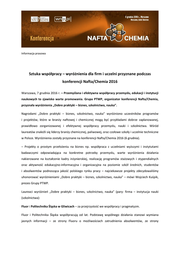 Informacja prasowa Sztuka współpracy – wyróżnienia dla firm i uczelni przyznane podczas konferencji Nafta/Chemia 2016 Warszawa, 7 grudnia 2016 r. – Przemyślana i efektywna współpracy przemysłu, edukacji i instytucji naukowych to zjawisko warte promowania. Grupa PTWP, organizator konferencji Nafta/Chemia, przyznała wyróżnienia „Dobre praktyki – biznes, szkolnictwo, nauka”. Nagrodami „Dobre praktyki – biznes, szkolnictwo, nauka” wyróżniono uczestników programów i projektów, które w branży naftowej i chemicznej mogą być przykładami dobrze zaplanowanej, prawidłowo zorganizowanej i efektywnej współpracy przemysłu, nauki i szkolnictwa. Wśród laureatów znaleźli się liderzy branży chemicznej, paliwowej, oraz czołowe szkoły i uczelnie techniczne w Polsce. Wyróżnienia zostały przyznane na konferencji Nafta/Chemia 2016 (6 grudnia). – Projekty o prostym przełożeniu na biznes np. współpraca z uczelniami wyższymi i instytutami badawczymi odpowiadająca na konkretne potrzeby przemysłu, warte wyróżnienia działania nakierowane na kształcenie kadry inżynierskiej, realizację programów stażowych i stypendialnych oraz aktywność edukacyjno-informacyjna i organizacyjna na poziomie szkół średnich, studentów i absolwentów podnosząca jakość polskiego rynku pracy – najciekawsze projekty zdecydowaliśmy uhonorować wyróżnieniami „Dobre praktyki – biznes, szkolnictwo, nauka” – mówi Wojciech Kuśpik, prezes Grupy PTWP. Laureaci wyróżnień „Dobre praktyki – biznes, szkolnictwo, nauka” (pary: firma – instytucja nauki (szkolnictwa): Fluor i Politechnika Śląska w Gliwicach – za przejrzystość we współpracy i pragmatyzm. Fluor i Politechnika Śląska współpracują od lat. Podstawę wspólnego działania stanowi wymiana jasnych informacji – ze strony Fluoru o możliwościach zatrudnienia absolwentów, ze strony Politechniki co do tematyki prac magisterskich. Fluor sugeruje tematykę niektórych, współdefiniuje i uczestniczy w realizacji pewnych elementów procesu dydaktycznego. Kluczowy obszar współpracy obu podmiotów to rynek pracy – zawiera się w nim możliwość odbywania praktyk dyplomowych i staży studenckich, sponsorowanie przedsięwzięć podnoszących jakość kształcenia. Grzegorz Czul, prezes zarządu firmy Fluor, odbierając nagrodę podkreślił, że spółka jest szczególnie dumna z tego, że udało się wspomóc tworzenie na Politechnice Śląskiej nowej technologii. – Mamy nadzieję, że na początku roku 2018 projekt wejdzie w fazę realizacji. To element współpracy, który daje wiele satysfakcji – dodał. Prof. Arkadiusz Mężyk, rektor Politechniki Śląskiej, przypominał, że współpraca z Fluorem została zapoczątkowana w 2003 roku. – Jestem trzecim rektorem, który ma możliwość korzystania z jej owoców. Oprócz prac badawczo-rozwojowych zajmujemy się rozwijaniem kompetencji przyszłych pracowników. Kształcimy studentów dla przemysłu zaawansowanych technologii. Same kursy, które były przeprowadzone przez firmę Fluor m.in. z zakresu zarządzania projektami inwestycyjnymi, objęły 1300 studentów – powiedział rektor. Grupa Azoty i Zespół Szkół Technicznych im. Ignacego Mościckiego w Tarnowie-Mościcach za jakość procesu dydaktycznego we współpracy obu podmiotów, a w konsekwencji jego adekwatność do potrzeb i oczekiwań przyszłego pracodawcy. Firma pełni rolę partnera i opiekuna szkoły, jednocześnie gwarantując sobie na przyszłość zaplecze kadrowe o odpowiednio wysokich kwalifikacjach. Umowa między firmą i szkołą obejmuje organizację praktyk uczniowskich, fundowania stypendiów i nagród dla uczniów osiągających najlepsze wyniki w nauce. Specjalistyczne zajęcia dydaktyczne prowadzone są przez fachowców z Grupy Azoty, a nauczyciele mogą poszerzać i aktualizować swoją wiedzę co do nowoczesnych technologii przemysłowych. – Podpisując ze szkołą umowę w 2013 roku, byliśmy w 100 proc. przekonani, że ten projekt nie ma prawa się nie udać. To szkoła przyzakładowa od ponad 50 lat. Cieszę się też z tego, że tym tropem poszły wszystkie zakłady w Grupie Azoty – powiedział Artur Kopeć, wiceprezes zarządu Grupy Azoty. – Widzimy, co się dzieje na rynku pracy. Pracowników jest wielu, ale pozyskanie dobrego jest trudne – dodał. Krzysztof Kołaciński, dyrektor Zespołu Szkół Technicznych im. Ignacego Mościckiego w TarnowieMościcach, nie spodziewał się takiego wyróżnienia, a zostało ono przyznane w 85. rocznicę działalności edukacyjnej palcówki. – Byłem pracownikiem Grupy Azoty. Jako dyrektor zespołu szkół technicznych nie wyobrażałem sobie kształcenia zawodowego bez bliskich związków z przemysłem. Korzyści ze współpracy są obustronne. To m.in. przygotowanie kadry, budowa wizerunku firmy wspierającej społeczności lokalne i edukację zawodową – powiedział. PCC Rokita oraz Wydział Chemiczny Politechniki Wrocławskiej za realizację wspólnego celu biznesu i uczelni – promocję najzdolniejszych i rozbudzanie zainteresowań studentów, przede wszystkim tych związanych z innowacjami, technologiami oraz funkcjonowaniem branży chemicznej. Spółki Grupy Kapitałowej PCC, w tym PCC Rokita współpracują z Politechniką Wrocławską od pięciu lat. PCC Rokita wspiera najlepszych studentów, a ci z wydziału chemicznego i elektrycznego, mogą starać się o fundowane przez firmę stypendium. Spółka oferuje też płatne staże i program stypendialny skierowany do studentów studiów magisterskich. Współpraca realizowana pod hasłem „Napisz z nami pracę dyplomową” umożliwia, tuż przed niełatwym startem w życiu zawodowym, realizację badań w nowoczesnych laboratoriach, udział w programie szkoleniowym i zdobycie doświadczenia w biznesie. – Politechnika Wrocławska to naturalne miejsce, w którym kształci się nasza przyszła kadra. Chcemy wpierać ten proces, dla