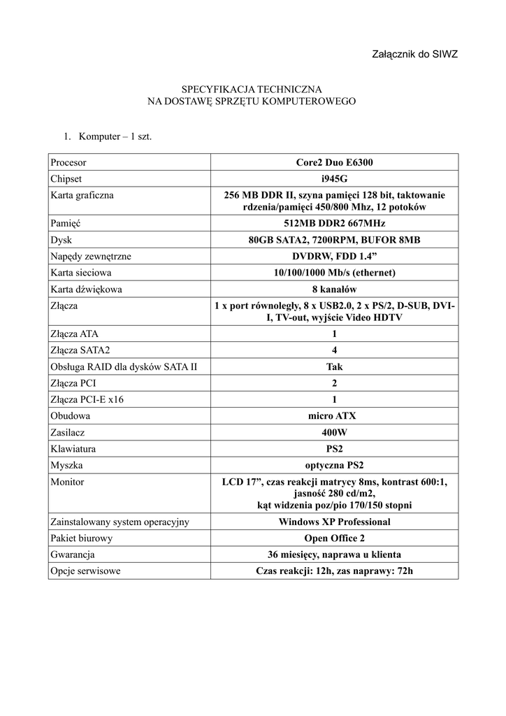 Załącznik do SIWZ SPECYFIKACJA TECHNICZNA NA DOSTAWĘ SPRZĘTU KOMPUTEROWEGO 1. Komputer – 1 szt. Procesor Core2 Duo E6300 Chipset i945G Karta graficzna Pamięć Dysk Napędy zewnętrzne Karta sieciowa Karta dźwiękowa Złącza 256 MB DDR II, szyna pamięci 128 bit, taktowanie rdzenia/pamięci 450/800 Mhz, 12 potoków 512MB DDR2 667MHz 80GB SATA2, 7200RPM, BUFOR 8MB DVDRW, FDD 1.4” 10/100/1000 Mb/s (ethernet) 8 kanałów 1 x port równoległy, 8 x USB2.0, 2 x PS/2, D-SUB, DVII, TV-out, wyjście Video HDTV Złącza ATA 1 Złącza SATA2 4 Obsługa RAID dla dysków SATA II Tak Złącza PCI 2 Złącza PCI-E x16 1 Obudowa micro ATX Zasilacz 400W Klawiatura PS2 Myszka optyczna PS2 Monitor LCD 17”, czas reakcji matrycy 8ms, kontrast 600:1, jasność 280 cd/m2, kąt widzenia poz/pio 170/150 stopni Zainstalowany system operacyjny Pakiet biurowy Gwarancja Opcje serwisowe Windows XP Professional Open Office 2 36 miesięcy, naprawa u klienta Czas reakcji: 12h, zas naprawy: 72h 2. Komputer – 3 szt. Procesor Core2 Duo E6300 Chipset i945G Karta graficzna SXGA Pamięć Dysk Karta sieciowa 512MB DDR2 667MHz 80GB SATA2, 7200RPM, BUFOR 8MB 10/100/1000 Mb/s (ethernet) Karta dźwiękowa 8 kanałów Złącza zewnętrzne 1 x port równoległy, 8 x USB2.0, 2 x PS/2 Złącza ATA 1 Złącza SATA2 4 Obsługa RAID dla dysków SATA II Tak Złącza PCI 2 Złącza PCI-E x16 1 Obudowa micro ATX Zasilacz 400W Klawiatura PS2 Myszka optyczna PS2 Monitor LCD 17”, czas reakcji matrycy 8ms, kontrast 600:1, jasność 280 cd/m2, kąt widzenia poz/pio 170/150 stopni Zainstalowany system operacyjny Pakiet biurowy Gwarancja Opcje serwisowe Windows XP Professional Open Office 2 36 miesięcy, naprawa u klienta Czas reakcji: 12h, zas naprawy: 72h 3. UPS – 4szt. Moc 300 W Moc pozorna 500 VA Architektura off-line (stand-by) Max. czas przełączenia 4 ms Liczba gniazd wyjściowych 4 Ochrona portu modemu tak Czas podtrzym. przy 100% obciąż. 4 min. Czas podtrzym. przy 80% obciąż. 5 min. Czas podtrzym. przy 50% obciąż. 10 min. Komunikacja z komputerem USB 4. Notebook – 1 szt. Procesor Intel Pentium M 740 Ekran 15”, XGA 1024x768 Glare Pamięć 512MB Dysk Karta sieciowa Złącza zewnętrzne Myszka Zainstalowany system operacyjny Pakiet biurowy Torba Gwarancja 60GB 10/100 Mb/s (ethernet), Intel Pro/Wireless 2200BG SD/MS/MS Pro/MMC, DVD-RW DL, 1xS/PDIF, 3xUSB2.0, PCMCIA 1xtypII, D-SUB optyczna USB, mini Windows XP Professional Open Office 2 Tak 24 miesięce door to door 5. Pendrive – 1 szt. Pojemność Interfejs 2GB USB2.0
