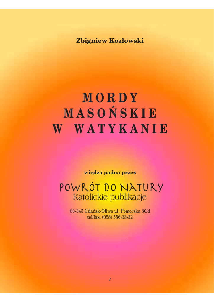Zbigniew Koz∏owski MORDY MASO¡SKIE W WATYKANIE wiedza padna przez Powrót do Natury Katolickie publikacje 80-345 Gdaƒsk-Oliwa ul. Pomorska 86/d tel/fax. (058) 556-33-32 1 WPROWADZNIE WED¸UG OBJAWIE¡ PoÊród niewyjaÊnionych morderstw, te dwa pope∏nione na osobach papie˝y: Paw∏a VI i Jana Paw∏a I w Watykanie, stolicy KoÊcio∏a Katolickiego domagajà si´ rzetelnego wyjaÊnienia oraz sprawiedliwego osàdzenia. Opinia ta mo˝e wydawaç si´ nonsensem, lecz wnikliwa analiza faktów, motywów, oraz okolicznoÊci dotyczàcych tajemniczych i niespodziewanych zgonów rzeczonych papie˝y, przemawia za s∏usznoÊcià oskar˝enia. Z wielu ostatnich objawieƒ dowiadujemy si´ o bardzo powa˝nym zagro˝eniu KoÊcio∏a Katolickiego, tkwiàcym w jego wewn´trznych strukturach. Stare, wielokrotnie pot´piane przez dawnych papie˝y herezje od˝y∏y na nowo ze zdwojonà si∏à, a co gorsza stajà si´ z wolna oficjalnà wyk∏adnià doktryny KoÊcio∏a. Za dobitny przyk∏ad niech pos∏u˝à oficjalne nauki g∏oszone przez niektórych teologów szacownego niegdyÊ zakonu Jezuitów. Karl Rahner,S.J. w swojej bluênierczej ksià˝ce ”Unity of the Churches: An Actual Possibility” (JedoÊç KoÊcio∏ów: realne mo˝liwoÊci) otwarcie podwa˝a niepodwa˝alne dogmaty KoÊcio∏a dotyczàce znaczenia Siedmiu Sakramentów Âwi´tych, istnienia nieba i piek∏a, prymatu papie˝a czy wreszcie Niepokalanego Pocz´cie i Wniebowstàpienia NajÊwi´tszej Maryji Panny. Jego zdaniem zagadnienia te winny byç ponownie zdefiniowane. Nast´pnym ewidentnym przyk∏adem profanujàcym katolickà nauk´ KoÊcio∏a jest ksià˝ka Arhura F. McGovern S.J. pt. “Marxism; An American Christian Perspective”. Wed∏ug autora, postaç Jezusa ukazanego w Ewngelii Âw. ¸ukasza jest wzorcem dla rewolucji! Podobnych przyk∏adów mo˝na by mno˝yç. Powa˝na liczba teologów i przewodników takich zgromadzeƒ jak jezuici, karmelici, dominikanie i zakonnicy Maryknoll, a tak˝e zakonów ˝eƒskich- otwarcie naucza antychrzeÊcijaƒskich odst´pstw. A wi´c nie ma wàtpliwoÊci, wilki ukryte w owczych skórach wdar∏y si´ do zagrody by czyniç swe ∏otrostwa. Jezus Chrystus powiedzia∏ do hiszpaƒskiego wizjonera Clemente Gomez 25.03. 1973r: "… dziÊ w najbardziej trudnej epoce do sprawowania rzàdów duchowych nad Mym KoÊcio∏em, KoÊció∏ zosta∏ podkopany przez wrogów, zosta∏ zinfiltrowany przez masonów, komunistów, luteran, kalwinów i innych heretyków. DziÊ jest chwila, w której KoÊció∏ jest demolowany w straszliwy sposób, wielkie kamienie usuwane sà ze Êwiàtyni". NajÊwi´tsza Dziewica w objawieniu w Betside z 18.03. 1977r. powiedzia∏a do Weroniki Leuken: "Wielu sprzedaje swe dusze aby zyskaç znaczenie. Za co, za doczesne ˝ycie z przyjemnoÊciami, za umi∏owanie wszelkich pon´t szatana, za gromadzenie w waszym Êwiecie tego, co nie przepuÊci was do wiecznego Królestwa w Niebie. Jakà wartoÊç ma wasze zdrowie, wasza pozycja, wasza wiedza kiedy przechodzicie za zas∏on´, wszelki i ka˝dy jeden z was? A czym˝e jest Êmierç, je˝eli nie przejÊciem? O Moje dzieci, jest ona przejÊciem w trwa∏e ˝ycie z czasowej egzystencji.. Nie obawiajcie si´ ujawniaç z∏a. Je˝eli nie wyprowadzicie na Êwiat∏o tych, którzy sà mocno okryci ciemnoÊcià z powodu swej w∏asnej woli, albo przez akty pos∏uszeƒstwa dla z∏a, je˝eli nie b´dziecie si´ starali ocaliç ich, wywieêç ich z tych ciemnoÊci, wy tak˝e b´dziecie winni arogancji i pychy". Dnia 27. 08. 1975 r. NajÊwi´tsza Dziewica ujawni∏a Weronice Leuken szataƒskie trio rezydujàce w Watykanie- kardyna∏owie; Cassaroli, Benelli, Villot. "Nasz drogi, ukochany Wikarjusz Papie˝ Pawe∏ VI cierpi bardzo w r´kach tych, którym ufa. Moje dziecko, krzycz o tym ze szczytów dachów. Nie jest on zdolny pe∏niç swojej misji. Powalili go, Moje dziecko. Jest on chory, podtruwany i usuni´ty z Watykanu przez masonów.... ...Teraz jest ten, który rzàdzi na jego miejscu, oszust, stworzony przez umys∏y agentów szatana. ...Pos∏u˝ono si´ najlepszymi chirurgami, aby stworzyç oszusta. ...Antychryst i si∏y z∏a zeszli si´ w Wiecznym MieÊcie. Musisz uczyniç wiadomym Êwiatu, ˝e wszystko, co wychodzi z Rzymu, pochodzi z ciemnoÊci. Âwiat∏o nie przychodzi w ten sposób. ...Ten, który wyst´puje publicznie, nie jest Paw∏em VI – to oszukaƒczy papie˝. Z∏oÊliwe leki omroczy∏y mózg prawdziwego papie˝a Paw∏a VI. Wstrzykujà mu do ˝y∏ trucizny, a˝eby zaciemniç zdolnoÊç jego rozu- 2 mowania i sparali˝owaç jego nogi. ...Moje dzieci, musicie teraz modliç si´ o Êwiat∏o. Musicie znaç prawd´. Wszystko co jest wam stamtàd podsuwane, jest s∏owem pochodzàcym ze zdradzieckich serc tych, co pochwycili w∏adz´ w Wiecznym MieÊcie. Moje dziecko, b´dziesz wyÊmiana za ten przekaz. Wielu wydrwi ci´ i wyszydzi, lecz ty podajesz prawd´. Wrogowie w Wiecznym MieÊcie otworzyli szeroko drzwi i pozwolili wejÊç nieprzyjacio∏om Boga. Oni spó∏kujà z diab∏em...OczyÊçcie wasze Miasto! Wydalcie z niego zdrajców! Ekskomunikujcie z∏oczyƒców, którzy nie ˝a∏ujà za swój grzech! Obudêcie si´! PosneliÊcie? Nie idêcie jak barany do ubojni tych, którzy sami oddali si´ szatanowi. Wielu sprzedaje swe dusze, by staç si´ wa˝nymi... ...Nie mo˝ecie obecnie akceptowaç tego, co przychodzi z Rzymu, gdy˝ te bulle i te dyrektywy nie sà pióra papie˝a Paw∏a VI. Pisze je Benelli i Villot. To oni, Moje dzieci, dajà te dyrektywy Antonio Cassaroli, a˝eby zinfiltrowa∏ wysokie miejsca publiczne, Êlàc wys∏anników z Rzymu ku wszystkim narodom Êwiata, do agentów szatana...Wasz Êwiat zmierza ku krzy˝owemu cierpieniu. Dzieci Bo˝e b´dà przeÊladowane, lecz wytrwajcie. Moje dzieci, wielka jest dla was nagroda w Niebie. ...Nastanie czas, bez modlitwy i pokuty rodzaju ludzkiego, ˝e ci na Ziemi b´dà zadroÊciç tym, którzy odeszli. Ojciec przeciwko synowi, matka przeciwko córc