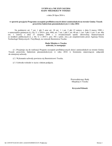 UCHWAŁA NR XXIV/162/2016 RADY MIEJSKIEJ W TOSZKU z dnia 28 lipca 2016 r. w sprawie przyjęcia Programu szczepień profilaktycznych dzieci zamieszkałych na terenie Gminy Toszek przeciwko bakteriom pneumokokowym w roku 2016 Na podstawie art. 7 ust. 1 pkt 5 oraz art. 18 ust. 1 i ust. 2 pkt 15 ustawy z dnia 8 marca 1990 r. o samorządzie gminnym (t.j. Dz. U. z 2016 r. poz. 446), art. 7 ust. 1 pkt 1, art. 48 ust. 1, ust. 3 pkt 1 i ust. 5, art. 48a ust. 1 ustawy z dnia 27 sierpnia 2004 r. o świadczeniach opieki zdrowotnej finansowanych ze środków publicznych (t. j. Dz. U. z 2015 r. poz. 581 z późn. zm.), po zaopiniowaniu przez Agencję Oceny Technologii Medycznych i Taryfikacji, na wniosek Burmistrza Toszka Rada Miejska w Toszku uchwala, co następuje: § 1. Przyjmuje się do realizacji Program szczepień profilaktycznych dzieci zamieszkałych na terenie Gminy Toszek przeciwko bakteriom pneumokokowym w roku 2016 w brzmieniu stanowiącym załącznik do niniejszej uchwały. § 2. Wykonanie uchwały powierza się Burmistrzowi Toszka. § 3. Uchwała wchodzi w życie z dniem podjęcia. Przewodniczący Rady Miejskiej w Toszku Krzysztof Klonek Id: C4919574-ECD3-42E1-A4A0-052888D1CE19. Podpisany Strona 1 Załącznik do Uchwały Nr XXIV/162/2016 Rady Miejskiej w Toszku z dnia 28 lipca 2016 r. Program szczepień profilaktycznych dzieci zamieszkałych na terenie Gminy Toszek przeciwko bakteriom pneumokokowym w roku 2016 Czas realizacji Programu – rok 2016 Autor Programu: Urząd Miejski w Toszku Referat Organizacyjny 1/17 Id: C4919574-ECD3-42E1-A4A0-052888D1CE19. Podpisany Strona 2 SPIS TREŚCI Rozdział 1 Opis problemu zdrowotnego ........................................................................................ 3 1. 2. 3 4. 5. Problem zdrowotny................................................................................................................. 3 Epidemiologia .......................................................................................................................... 3 Populacja podlegająca jednostce samorządu terytorialnego i populacja kwalifikująca się do włączenia do Programu .............................................................................................. 4 Obecne postępowanie ............................................................................................................. 5 Uzasadnienie potrzeby wdrożenia Programu..................................................................... 5 Rozdział 2 Cele Programu.................................................................................................................. 6 1. 2. 3. Cele Programu ......................................................................................................................... 6 Oczekiwane efekty .................................................................................................................. 6 Mierniki efektywności odpowiadające celom Programu .................................................. 6 Rozdział 3 Adresaci Programu .......................................................................................................... 7 1. 2. Adresaci Programu szczepień przeciw meningokokom ................................................... 7 Tryb zapraszania do Programu ............................................................................................. 7 Rozdział 4 Organizacja Programu .................................................................................................... 7 1. 2. 3. 4. 5. Części składowe, etapy i działania organizacyjne .............................................................. 7 Planowane interwencje ........................................................................................................... 8 Kryteria i sposób kwalifikacji uczestników ......................................................................... 9 Zasady udzielania świadczeń w ramach Programu........................................................... 9 Sposób powiązania działań programu ze świadczeniami zdrowotnymi finansowanymi ze środków publicznych ………………………………………………..10 6. Spójność merytoryczna i organizacyjna ............................................................................. 10 7. Sposób zakończenia udziału w Programie i możliwości kontynuacji otrzymywania świadczeń zdrowotnych przez uczestników Programu, jeżeli istnieją wskazania ..... 11 8. Bezpieczeństwo planowanych interwencji ........................................................................ 11 9. Kompetencje i warunki niezbędne do realizacji Programu............................................. 11 10. Dowody skuteczności planowanych działań .................................................................... 12 Rozdział 5 Koszty ........................................................................................................................... 14 1. 2. 3. 4. Koszty jednostkowe .............................................................................................................. 14 Planowane koszty całkowite ................................................................................................ 15 Źródła finansowania, partnerstwo ...................................................................................... 15 Argumenty przemawiające za tym, że wykorzystanie dostępnych zasobów jest optymalne ................................................................................................................................ 15 Rozdział 6 Monitorowanie i ewaluacja ......................................................................................... 15 1. 2. 3. 4. Ocena zgłaszalności do Programu ...................................................................................... 15 Ocena jakości świadczeń w Programie............................................................................... 15 Ocena efekty