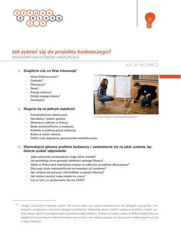 ALICJA PACEWICZ 1. Znajdźcie coś, co Was interesuje1 Może Elektryczność? Gwiazdy? Dinozaury? Skały? Poezja miłosna? Dzieje mojego miasta? Genetyka? 2. Skupcie się na jednym aspekcie! Przewodnictwo elektryczne. Fot. http://blogiceo.nq.pl/bataliebatalionub/ Narodziny i śmierć gwiazd. Dinozaury odkryte w Polsce. Skały metamorficzne a osadowe. Kobieta w polskiej poezji miłosnej. Rzeka w moim mieście. GMO, czyli organizmy genetycznie modyfikowane. 3. Sformułujcie główny problem badawczy i zastanówcie się na jakie pytania, będziecie szukać odpowiedzi Jakie własności przewodzące mają różne metale? Jak przebiega życie gwiazdy wielkości naszego Słońca? Gdzie w Polsce jest największa szansa na odkrycie szczątków dinozaurów? Dlaczego skały metamorficzne są twardsze niż osadowe? Jak zmienia się pozycja i rola kobiety w poezji miłosnej? Jak można zwrócić moje miasto ku rzece? Czy w tym, co spożywamy nie ma GMO? 1 Uwaga: Oczywiście najlepiej znaleźć taki temat, który ma szanse zainteresować też jakiegoś nauczyciela i mazwiązek z programem nauczania jakiegoś przedmiotu. Najłatwiej wtedy znaleźć opiekuna projektu, a także uzyskać pomoc szkoły w przygotowaniu prezentacji jego efektów. Praktyczna rada: zwykle, im bliżej projekt dotyczy zagadnień omawianych w danym miesiącu (semestrze), tym większa szansa, by nauczyciel i szkoła wsparły ucznia w jego realizacji! 4. Określcie, z jakich źródeł informacji chcecie i możecie korzystać źródeł pisanych i ekspertów (np. encyklopedia i specjalista w danej dziedzinie), pierwotnych i wtórnych (np. dokumenty archiwalne i opracowania naukowe), badań zza biurka (np. internet) i w terenie (wizja lokalna). 5. Zdecydujcie, jaki będziecie realizować projekt badanie eksperymentalne (przewodnictwo metali), stworzenie modelu plastycznego lub komputerowego (życie gwiazdy), demonstracja zjawiska (kruszenie skał) poszukiwanie wyjaśnienia na podstawie analizy i interpretacji danych i informacji (portret kobiety) 6. Opracujcie harmonogram pracy wymyślcie, co chcecie (i możecie) zrobić – przygotujcie pytania badawcze lub hipotezy i zaplanujcie, jak będziecie szukać na nie odpowiedzi, podzielcie się zadaniami, tak żeby każdy wiedział, za co konkretnie odpowiada, określcie terminy poszczególnych działań, sprawdźcie, czy to, czego potrzebujecie będzie wtedy dostępne, umówcie się na „punkty kontrolne” – spotkania, na których sprawdzicie, czy wszystko idzie zgodnie z planem. 7. Zabierzcie się do dzieła! dowiedzcie się jak najwięcej o „swoim” temacie, korzystając różnych źródeł, gromadźcie informacje w sposób uporządkowany, przygotujcie się do eksperymentu/demonstracji/budowy modelu itp., przeprowadźcie go, zanotujcie wyniki, wyciągnijcie wnioski i opracujcie je w przystępnej formie. 8. Zakończcie pracę nad projektem uporządkujcie ustalenia, „posprzątajcie” pole badawcze – oddajcie wypożyczone sprzęty (np. próbki różnych metali), książki (wiersze Asnyka wypożyczone z biblioteki), zbierzcie i posegregujcie notatki i zdjęcia. 9. Zaprezentujcie wyniki przygotujcie starannie prezentację wyników waszej pracy, zorganizujcie salę, zaproście publiczność, zaprezentujcie w atrakcyjny sposób efekty waszej pracy nad projektem, poproście o pytania i komentarze. 10. Oceńcie pracę każdego z was i całego zespołu spotkajcie się jak najszybciej po prezentacji i porozmawiajcie o swojej pracy, każdy powinien sam ocenić własną pracę i uzyskać informację zwrotną od innych, oceńcie pracę całego zespołu – co najlepiej wam się udało, a co następnym razem zrobilibyście inaczej.