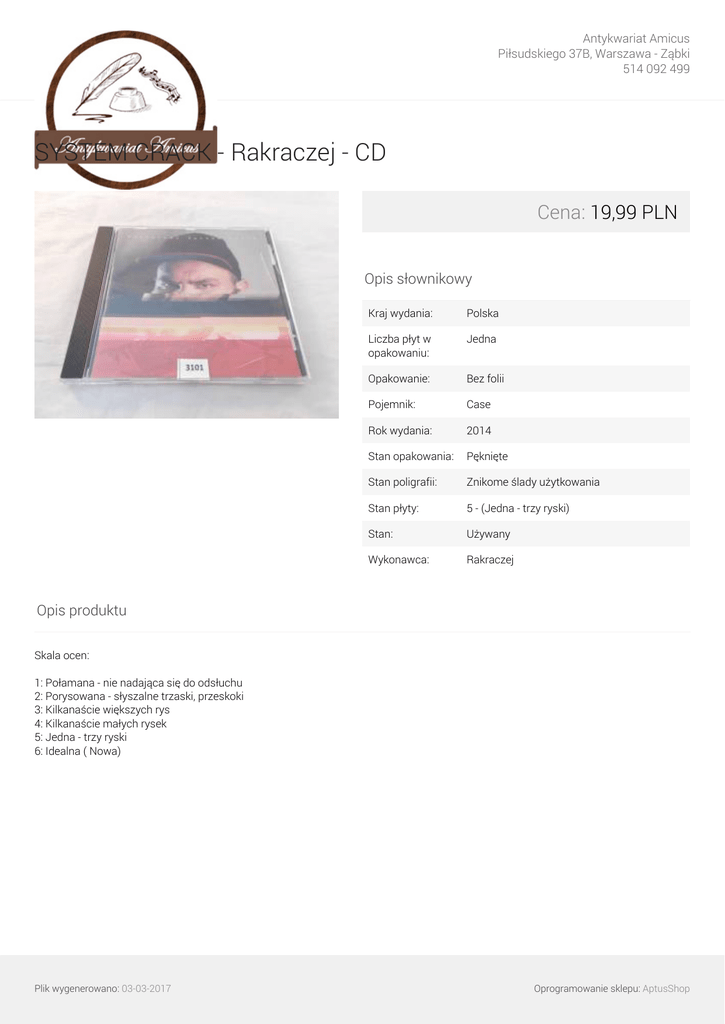 Antykwariat Amicus Piłsudskiego 37B, Warszawa - Ząbki 514 092 499 SYSTEM CRACK - Rakraczej - CD Cena: 19,99 PLN Opis słownikowy Kraj wydania: Polska Liczba płyt w opakowaniu: Jedna Opakowanie: Bez folii Pojemnik: Case Rok wydania: 2014 Stan opakowania: Pęknięte Stan poligrafii: Znikome ślady użytkowania Stan płyty: 5 - (Jedna - trzy ryski) Stan: Używany Wykonawca: Rakraczej Opis produktu Skala ocen: 1: Połamana - nie nadająca się do odsłuchu 2: Porysowana - słyszalne trzaski, przeskoki 3: Kilkanaście większych rys 4: Kilkanaście małych rysek 5: Jedna - trzy ryski 6: Idealna ( Nowa) Plik wygenerowano: 03-03-2017 Oprogramowanie sklepu: AptusShop Antykwariat Amicus Piłsudskiego 37B, Warszawa - Ząbki 514 092 499 Galeria Plik wygenerowano: 03-03-2017 Powered by TCPDF (www.tcpdf.org) Oprogramowanie sklepu: AptusShop