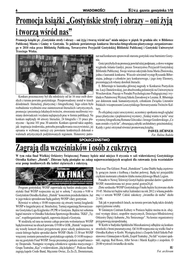 6 WIADOMOCI NOWA gazeta gostyñska 1/12 Promocja ksi¹¿ki Gostyñskie strofy i obrazy oni ¿yj¹ i tworz¹ wród nas Promocja ksi¹¿ki pt. Gostyñskie strofy i obrazy oni ¿yj¹ i tworz¹ wród nas mia³a miejsce w pi¹tek 16 grudnia ubr. w Bibliotece Publicznej Miasta i Gminy w Gostyniu. To pok³osie powiatowego konkursu literacko-fotograficzno-plastycznego zorganizowanego w 2010 roku przez Bibliotekê Publiczn¹, Towarzystwo Przyjació³ Gostyñskiej Biblioteki Publicznej i Gostyñski Uniwersytet Trzeciego Wieku. nat nad konkursem sprawowali starosta gostyñski oraz burmistrz Gostynia. Goci przyby³ych na promocjê powita³ ni¿ej podpisany, a s³owo wstêpne wyg³osi³a Jolanta Gardy, prezes Towarzystwa Przyjació³ Gostyñskiej Biblioteki Publicznej. Swoje wiersze odczyta³a Irena Maria Zborowska, jedna z laureatek konkursu. Wieczór uwietni³ wystêp Ryszarda Biberstajna, jednego z cz³onków jury konkursowego, i jego ¿ony Eleonory, prezentuj¹cych w³asny dorobek literacki. E. Biberstajn to laureatka g³ównej nagrody w Konkursie Poetyckim im. £ucji Danielewskiej, jest absolwentk¹ polonistyki na Uniwersytecie Wroc³awskim. Pracuje w Poradni Psychologiczno-Pedagogicznej i wyKonkurs przeznaczony by³ dla m³odzie¿y od lat 16 oraz osób doro- k³ada w Pañstwowej Wy¿szej Szkole Zawodowej w Lesznie. R. Biberstajn s³ych z terenu powiatu gostyñskiego. Przeprowadzony zosta³ w trzech jest doktorem nauk humanistycznych, cz³onkiem Zwi¹zku Literatów dziedzinach: literackiej, plastycznej i fotograficznej. Jego celem by³o Polskich i wiceprezesem Leszczyñskiego Stowarzyszenia Twórców Kulrozbudzenie wyobrani oraz zainteresowañ literackich i artystycznych, tury. promocja i prezentacja lokalnych twórców, stworzenie mo¿liwoci wyPo oficjalnej czêci uroczystoci, uczestnicy spotkania mogli ogl¹daæ miany dowiadczeñ i wydanie najlepszych prac w formie publikacji. Na prace plastyczne z poplenerowej wystawy Szukaj wiatru w polu oraz konkurs nap³ynê³y 44 utwory literackie, 24 fotografie i 33 prace pla- wystawê fotograficzn¹ Romana Górczaka i Jerzego Gozdowskiego Co styczne ³¹cznie 101 prac 30 autorów. Konkurs ujawni³ takie aspekty, nam zosta³o z tych lat, obrazuj¹c¹ zabytki architektury gnienieñskiej. jak: inspiracja rodowiska, potrzeba porz¹dkowania rzeczywistoci, jej Ka¿dy z goci otrzyma³ równie¿ promowan¹ ksi¹¿kê. opisania w wybranej narracji czy powstanie konkretnych dokonañ o PAWE£ HÜBNER walorach artystycznych podyktowanych regionem. Honorowy patroFot. Halina Rado³a SPO£ECZEÑSTWO Zagraj¹ dla wczeniaków i osób z cukrzyc¹ W tym roku fina³ Wielkiej Orkiestry wi¹tecznej Pomocy bêdzie mia³ miejsce 8 stycznia w sali widowiskowej Gostyñskiego Orodka Kultury Hutnik. Zbierane bêd¹ pieni¹dze na zakup najnowoczeniejszych urz¹dzeñ dla ratowania ¿ycia wczeniaków oraz pomp insulinowych dla kobiet ciê¿arnych z cukrzyc¹. Program gostyñskiej WOP zapowiada siê bardzo atrakcyjnie. Gostyñski fina³ WOP rozpocznie siê ju¿ w sobotê 7 stycznia o 9:00 w Gostyñskim Orodku Kultury Hutnik koncertem przedszkolaków. Ju¿ w jego trakcie sprzedawane bêd¹ gad¿ety WOP i dary gostynian. Równie¿ w sobotê o 10:00 rozpocznie siê otwarty turniej krêglarski WOP w krêgielni przy ul. Strzeleckiej. Turniej organizuj¹ Stowarzyszenie Gostyñska Liga Krêglarska i PCPR w Gostyniu. Bêdzie te¿ sobotnia k¹piel morsów w Orodku Szkolenia Sportowego Brzednia. TKKF Têcza, wspó³organizator k¹pieli, zapewnia dojazd z Gostynia. W niedzielê od rana na terenie ca³ego powiatu wolontariusze WOP bêd¹ kwestowaæ na ulicach powiatu. O 9:00 w GOK Hutnik rozpocznie siê weso³y koncert dzieci przygotowany przez szko³y podstawowe, w czasie którego bêdzie sprzeda¿ darów WOP. Oko³o 13:30 tort WOP wrêczony zostanie personelowi gostyñskiego szpitala. O 14:00 rozpocznie siê gostyñski Fina³ WOP. Swoje prezentacje poka¿e zespó³ taneczny Desperado. Nastêpnie wyst¹pi¹ cz³onkowie ogniska muzycznego i Grupa Teatralna Kês z widowiskiem Id¹ kolêdnicy. Podczas fina³u zagraj¹ kapele Credo Band, Mêczenie Owiec, Za Zu Zi, Domniemani, Soul oraz The G(h)ost. Przed Hutnikiem Lene Diab³y bêd¹ czêstowa³y gor¹cym ¿urem z kie³bas¹ z kuchni polowej. Bêd¹ te¿ przeja¿d¿ki ciê¿kimi motorami cz³onków klubu motocyklowego Black Legion. Ponadto w Nowej Telewizji Gostyñ bêdzie sprzeda¿ darów i gad¿etów WOP, transmitowana te¿ przez portal gostyn24.pl. Z³ote serduszko WOSP Gostyñskiego Fina³u bêdzie licytowane oko³o 19:45. Mo¿na te¿ bêdzie nabyæ kalendarz na rok 2012 z w³asn¹ podobizn¹ i z sercem WOP. Ca³oæ zakoñczy wiate³ko do nieba oko³o 21:00. Tak jak w poprzednich latach, na terenie powiatu bêd¹ tak¿e dzia³a³y zaprzyjanione sztaby. W Gminnym Centrum Kultury w Poniecu bêdzie mo¿na m.in. obejrzeæ wystêpy dzieci, zespo³ów muzycznych, Dzieciêco-M³odzie¿owej Orkiestry Dêtej i kabaretu Nic miesznego. Na koniec organizatorzy przygotowuj¹ niespodziankê. W Krobi w budynku Spó³dzielni Mieszkaniowej odbêdzie siê konkurs strzelecki z broni pneumatycznej. Od 16:00 rozpocznie siê wielki fina³ w Orodku Kultury w Krobi. Wyst¹pi¹ dzieci z Zespo³u Szkó³ Szko³a Podstawowa i Gimnazjum w Krobi, Zespó³ Teatralny Na fali wystawi spektakl, zagraj¹: Red Roses, After Seven i Marek Kajdrys z zespo³em. O 20:00 wystrzeli wiate³ko do nieba. EU Fot. archiwum