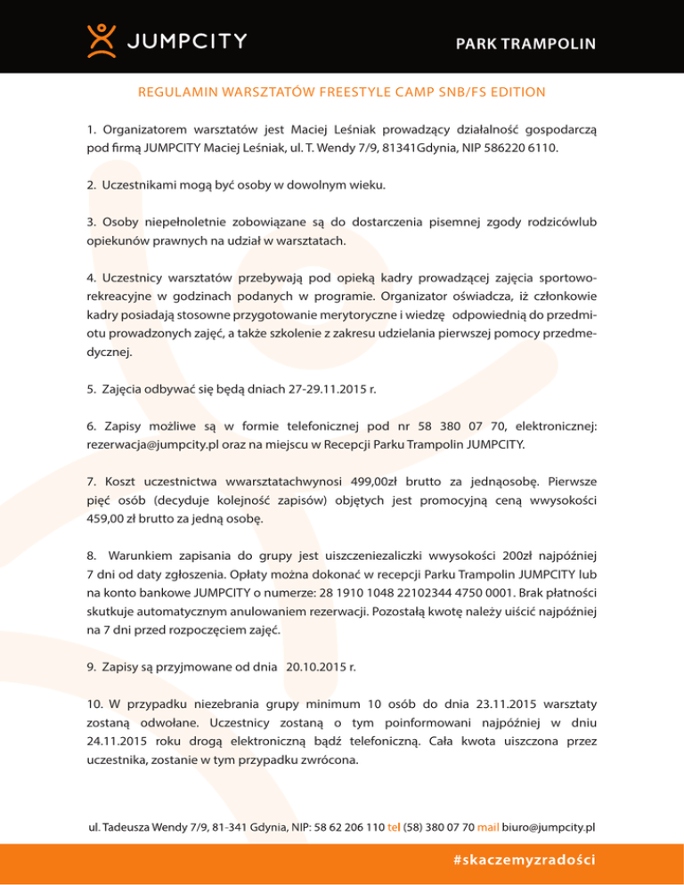 REGULAMIN WARSZTATÓW FREESTYLE CAMP SNB/FS EDITION 1. Organizatorem warsztatów jest Maciej Leśniak prowadzący działalność gospodarczą pod firmą JUMPCITY Maciej Leśniak, ul. T. Wendy 7/9, 81341Gdynia, NIP 586220 6110. 2. Uczestnikami mogą być osoby w dowolnym wieku. 3. Osoby niepełnoletnie zobowiązane są do dostarczenia pisemnej zgody rodzicówlub opiekunów prawnych na udział w warsztatach. 4. Uczestnicy warsztatów przebywają pod opieką kadry prowadzącej zajęcia sportoworekreacyjne w godzinach podanych w programie. Organizator oświadcza, iż członkowie kadry posiadają stosowne przygotowanie merytoryczne i wiedzę odpowiednią do przedmiotu prowadzonych zajęć, a także szkolenie z zakresu udzielania pierwszej pomocy przedmedycznej. 5. Zajęcia odbywać się będą dniach 27-29.11.2015 r. 6. Zapisy możliwe są w formie telefonicznej pod nr 58 380 07 70, elektronicznej: [email protected] oraz na miejscu w Recepcji Parku Trampolin JUMPCITY. 7. Koszt uczestnictwa wwarsztatachwynosi 499,00zł brutto za jednąosobę. Pierwsze pięć osób (decyduje kolejność zapisów) objętych jest promocyjną ceną wwysokości 459,00 zł brutto za jedną osobę. 8. Warunkiem zapisania do grupy jest uiszczeniezaliczki wwysokości 200zł najpóźniej 7 dni od daty zgłoszenia. Opłaty można dokonać w recepcji Parku Trampolin JUMPCITY lub na konto bankowe JUMPCITY o numerze: 28 1910 1048 22102344 4750 0001. Brak płatności skutkuje automatycznym anulowaniem rezerwacji. Pozostałą kwotę należy uiścić najpóźniej na 7 dni przed rozpoczęciem zajęć. 9. Zapisy są przyjmowane od dnia 20.10.2015 r. 10. W przypadku niezebrania grupy minimum 10 osób do dnia 23.11.2015 warsztaty zostaną odwołane. Uczestnicy zostaną o tym poinformowani najpóźniej w dniu 24.11.2015 roku drogą elektroniczną bądź telefoniczną. Cała kwota uiszczona przez uczestnika, zostanie w tym przypadku zwrócona. 11. Cena zawiera: a. opiekę instruktorów b. 15 h zajęć akrobatycznych c. 3 dniowy karnet “no limit” na skakanie w Parku Trampolin JUMPCITY d. ubezpieczenie NNW e. wejście na 1,5 h do aquaparku w Sopocie f. dodatkowe animacje, jak video analiza, integracja oraz inne atrakcje przygotowane przez trenerów poza godzinami zajęć akrobatycznych. 12. W przypadku rezygnacji z udziału w warsztatach wpłacona zaliczka nie podlega zwrotowi. 13. Nie przewiduje się zwrotu wniesionej opłaty w przypadku rezygnacji z części bądź całości warsztatów po dniu 23.11.2015r. 14. W przypadku kontuzji doznanej podczas ćwiczeń w Parku Trampolin JUMPCITY, która uniemożliwia dalsze uczestnictwo w warsztatach, uczestnik otrzymuje proporcjonalny zwrot kosztów w postaci karnetu do Parku Trampolin JUMPCITY, ważnego przez pół roku od daty wystawienia. Zwrot odbywa się na podstawie paragonu (za wyjątkiem zaliczki), zaświadczenia od lekarza oraz pisemnego opisu sytuacji złożonego w Recepcji Parku trampolin JUMPCITY. 15. Liczebność grup wyniesie maksymalnie 20 uczestników. 16. Samowolne oddalenie się od opiekunów, niesubordynacja, niezdyscyplinowanie, niewykonywanie poleceń opiekunów, nieprzestrzeganie regulaminu będzie karane upomnieniem, naganą a w ostateczności wykluczeniem z warsztatów. 17. Organizator nie ponosi odpowiedzialnośćo za rzeczy i pieniądze pozostawione na obiekcie przez uczestników warsztatów. 18. Uczestnicy warsztatów mają obowiązek: a. bezwzględnie podporządkować się poleceniom opiekunów prowadzących zajęcia oraz aktywnie uczestniczyć we wszystkich zajęciach programowych; b. przestrzegać ramowego harmonogramu dnia; c. użytkować przekazany do ich dyspozycji sprzęt rekreacyjnosportowy zgodnie z jego przeznaczeniem, poszanowania tego sprzętu i utrzymani porządku na terenie Parku Trampolin JUMPCITY; d. stosować się do postanowień, przepisów i regulaminów obowiązujących w Parku Trampolin JUMPCITY, z którymi zostaną zapoznani. 19. Uczestnik jest świadomy i akceptuje fakt, że w trakcie korzystania z obiektu mogą być wykonywane krótkie filmy i fotografie wyłącznie dla celów reklamowych i marketingowych Macieja Leśniak prowadzącego działalność gospodarczą pod firmą JUMPCITY Maciej Leśniak i uiszczając opłatę za udział w warsztatach wyraża jednocześnie zgodę na rejestrację jego wizerunku oraz jego upublicznianie. 20. Organizator zastrzega sobie prawo do zmiany regulaminu oraz harmonogramu zajęć