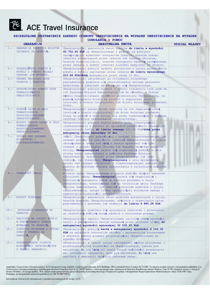SZCZEGÓŁOWE ZESTAWIENIE ZAKRESU OCHRONY UBEZPIECZENIE NA WYPADEK UBEZPIECZENIE NA WYPADEK ODWOŁANIA + POMOC GWARANCJE MAKSYMALNA KWOTA UDZIAŁ WŁASNY 1.- GWARANCJA POKRYCIA KOSZTÓW LECZENIA ZA GRANICĄ. 2.- PRZEDŁUŻENIE POBYTU W HOTELU Z POWODU NAGŁEJ CHOROBY LUB WYPADKU. PRZEWZ MEDYCZNY OSÓB CHORYCH I RANNYCH. 3.- 4.- PRZEDWCZESNY POWRÓT OSÓB TOWARZYSZĄCYCH UBEZPIECZONYCH. 5.- PODRÓŻ OSOBY W CELU TOWARZYSZENIA HOSPITALIZOWANEMU UBEZPIECZONEMU. KOSZTY POBYTU OSOBY W CELU TOWARZYSZENIA HOSPITALIZOWANEMU UBEZPIECZONEMU. 6.- 7.- OPIEKA NAD OSOBAMI NIELETNIMI I NIEPEŁNOSPRAWNYMI. 8.- TRANSPORT ZWŁOK. 9.- KOSZTY POGRZEBU. Ubezpieczyciel gwarantuje zwrot kosztów do limitu w wysokości 42 702.45 PLN na Ubezpieczonego i podróż, na pokrycie następujących wydatków: honorariów lekarza, kosztów zakupu lekarstw przepisanych przez lekarza lub lekarza chirurga, kosztów hospitalizacji, kosztów transportu karetką zarządzonego przez lekarza z jednej lokalnej placówki medycznej do drugiej. Ubezpieczyciel pokryje wydatki poniesione z tytułu przedłużenia pobytu w hotelu zapisanego przez lekarza do limitu wynoszącego 223.68 PLN/dobę maksymalnie przez okres 10 dni. Ubezpieczyciel natychmiast po otrzymaniu stosownego powiadomienia podejmie się skontaktowania swojego personelu medycznego z lekarzami opiekującymi się Ubezpieczonym. Ubezpieczyciel pokryje wydatki z tytułu transportu tych osób do ich Zwykłego Miejsca Zamieszkania lub do ośrodka, w którym będzie hospitalizowany wcześniej przewieziony Ubezpieczony, za pomocą wykupienia biletu na przelot w regularnej linii lotniczej w klasie turystycznej lub biletu kolejowego pierwszej klasy. Ubezpieczyciel wykupi bilet lotniczy na lot regularną linią lotniczą w klasie turystycznej lub bilet kolejowy pierwszej klasy na podróż w obie strony dla osoby towarzyszącej z państwa zwykłego miejsca zamieszkania ubezpieczonego. Ubezpieczyciel pokryje koszty pobytu osoby towarzyszącej (zakwaterowania w hotelu) po uprzednim przedłożeniu stosownych oryginalnych faktur do limitu równego 223.68 PLN/dobę przez maksymalny okres wynoszący 10 dni. Jeżeli Ubezpieczeni podróżujący z osobami niepełnosprawnymi lub osobami poniżej 14 roku życia (również Ubezpieczonymi) w czasie obowiązywania umowy nie będą w stanie opiekować się tymi osobami z powodu Nagłej Choroby lub Wypadku objętego zakresem Polisy, Ubezpieczyciel zajmie się organizacją podróży w obie strony osoby zamieszkałej w państwie Zwykłego Miejsca Zamieszkania, wyznaczonej przez Ubezpieczonego lub jego rodzinę, lub stewardesy Ubezpieczyciela w celu sprawowania opieki nad osobami nieletnimi i niepełnosprawnymi podczas ich powrotu do Zwykłego Miejsca Zamieszkania w najkrótszym możliwym czasie. W razie zgonu Ubezpieczonego w czasie podróży objętej zakresem niniejszej umowy, Ubezpieczyciel zajmie się organizacją i realizacją transportu zwłok do miejsca pochówku w kraju Ubezpieczonego, mieszczącego się na terytorium gminy Zwykłego Miejsca Zamieszkania, jak również pokryciem wydatków z tytułu zabalsamowania, zakupu trumny spełniającej minimalne wymogi i wypełniania formalności administracyjnych. Ubezpieczyciel gwarantuje zwrot wydatków poniesionych z tytułu kosztów pogrzebu Ubezpieczonego, włącznie z organizacja usług pogrzebowych i pochówku lub kremacji do limitu 4 880.28 PLN. 10.- WYSYŁANIE LEKARSTW ZA GRANICE. Ubezpieczyciel podejmie się wyszukania lekarstwa i przesłania go najkrótszą możliwą drogą zgodnie z miejscowym prawem. 11.- ZALICZKA NA POCZET KAUCJI W POSTĘPOWANIU KARNYM WYMAGANA ZA GRANICĄ. POKRYCIE WYDATKÓW Z TYTUŁU POMOCY PRAWNEJ ZA GRANICĄ. Ubezpieczyciel wypłaci Ubezpieczonemu zaliczkę równą wysokości kaucji w postępowaniu karnym wymaganą przez stosowne urzędy do maksymalnej wysokości wynoszącej 32 535.20 PLN. Ubezpieczyciel pokryję kwotę w maksymalnej wysokości 6 100.35 PLN na opłacenie honorariów obrońcy i pełnomocnika procesowego w zakresie pomocy prawnej przysługującej Ubezpieczonemu po wypadku drogowym. Ubezpieczyciel w ramach usługi całodobowej będzie przyjmował i przekazywał pilne wiadomości od Ubezpieczonych, zawsze pod warunkiem, że nie będą oni mieli innych możliwości przekazania ww. informacji adresatom, oraz pod warunkiem, że będą one wynikały z gwarancji objętych zakresem umowy. 12.- 13.- PRZEKAZYWANIE PILNYCH WIADOMOŚCI (WYNIKAJĄCYCH Z TREŚCI GWARANCJI. Angielskie Towarzystwo Ubezpieczeniowe ACE European Group Limited z siedzibą pod adresem ACE Building, 100 Leadenhall Street Londyn EC3A3BP. Ta umowa została zawarta z hiszpańskim oddziałem ww. Towarzystwa Ubezpieczeniowego z siedzibą pod adresem Francisco Gervás 13, 28020 Madryt – www.aceeurope.com, wpisanym do Rejestru Handlowego miasta Madryt, Tom 19.701, Księga 0, Karta 1, Sekcja 8, Strona M346611, do Księgi Spółek. Ww. odział został autoryzowany przez hiszpańską Generalną Dyrekcję Ubezpieczeń zgodnie z hiszpańskim Rozporządzeniem Ministerialnym z dnia 13.05.1987 roku. Posługuje się hiszpańskim numerem podatkowym NIF W-0067389-G. Jest jednym z towarzystw ubezpieczeń i reasekuracji należących do Grupy ACE. 14.- ODPOWIEDZIALNOŚĆ CYWILNA. 15.- OPÓŹNIENIE W ODBIORZE BAGAŻU. 16.- UTRATA, USZKODZENIE I KRADZIEŻ BAGAŻU POŁĄCZONA Z UŻYCIEM PRZEMOCY. 17 A.- 17 B.- 18.- 19.- 20.- ODWOŁANIE PODRÓŻY Zgon, poważna choroba lub poważny wypadek Ubezpieczonego ODWOŁANIE PODRÓŻY Wszelkie inne okoliczności za wyjątkiem wymienionych w wyłączeniach odpowiedzialności SPÓŹNIENIE NA LOT Niestawienie się na lot z przyczyn niezależnych od Ubezpieczonego ODWOŁANIE PODRÓŻY NIEWYPEŁNIENIE ZOBOWIĄZAŃ PRZEZ LINIE LOTNICZE, jeżeli do lotu nie dojdzie z powodu: 1) Problemów linii lotniczych; 2) Opóźnienia w wylocie powyżej 7 godzin OPÓZNIENIE WYLOTU, Opóźnienie wylotu (w locie regularnym, „low-cost” lub czarterowym) powyżej 4 godzin Ubezpieczenie gwarantu
