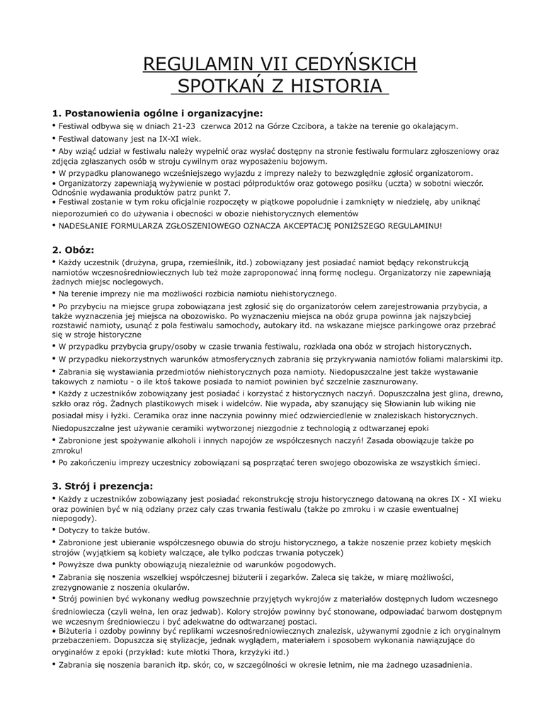 REGULAMIN VII CEDYŃSKICH SPOTKAŃ Z HISTORIA 1. Postanowienia ogólne i organizacyjne: • Festiwal odbywa się w dniach 21-23 czerwca 2012 na Górze Czcibora, a także na terenie go okalającym. • Festiwal datowany jest na IX-XI wiek. • Aby wziąć udział w festiwalu należy wypełnić oraz wysłać dostępny na stronie festiwalu formularz zgłoszeniowy oraz zdjęcia zgłaszanych osób w stroju cywilnym oraz wyposażeniu bojowym. • W przypadku planowanego wcześniejszego wyjazdu z imprezy należy to bezwzględnie zgłosić organizatorom. • Organizatorzy zapewniają wyżywienie w postaci półproduktów oraz gotowego posiłku (uczta) w sobotni wieczór. Odnośnie wydawania produktów patrz punkt 7. • Festiwal zostanie w tym roku oficjalnie rozpoczęty w piątkowe popołudnie i zamknięty w niedzielę, aby uniknąć nieporozumień co do używania i obecności w obozie niehistorycznych elementów • NADESŁANIE FORMULARZA ZGŁOSZENIOWEGO OZNACZA AKCEPTACJĘ PONIŻSZEGO REGULAMINU! 2. Obóz: • Każdy uczestnik (drużyna, grupa, rzemieślnik, itd.) zobowiązany jest posiadać namiot będący rekonstrukcją namiotów wczesnośredniowiecznych lub też może zaproponować inną formę noclegu. Organizatorzy nie zapewniają żadnych miejsc noclegowych. • Na terenie imprezy nie ma możliwości rozbicia namiotu niehistorycznego. • Po przybyciu na miejsce grupa zobowiązana jest zgłosić się do organizatorów celem zarejestrowania przybycia, a także wyznaczenia jej miejsca na obozowisko. Po wyznaczeniu miejsca na obóz grupa powinna jak najszybciej rozstawić namioty, usunąć z pola festiwalu samochody, autokary itd. na wskazane miejsce parkingowe oraz przebrać się w stroje historyczne • W przypadku przybycia grupy/osoby w czasie trwania festiwalu, rozkłada ona obóz w strojach historycznych. • W przypadku niekorzystnych warunków atmosferycznych zabrania się przykrywania namiotów foliami malarskimi itp. • Zabrania się wystawiania przedmiotów niehistorycznych poza namioty. Niedopuszczalne jest także wystawanie takowych z namiotu - o ile ktoś takowe posiada to namiot powinien być szczelnie zasznurowany. • Każdy z uczestników zobowiązany jest posiadać i korzystać z historycznych naczyń. Dopuszczalna jest glina, drewno, szkło oraz róg. Żadnych plastikowych misek i widelców. Nie wypada, aby szanujący się Słowianin lub wiking nie posiadał misy i łyżki. Ceramika oraz inne naczynia powinny mieć odzwierciedlenie w znaleziskach historycznych. Niedopuszczalne jest używanie ceramiki wytworzonej niezgodnie z technologią z odtwarzanej epoki • Zabronione jest spożywanie alkoholi i innych napojów ze współczesnych naczyń! Zasada obowiązuje także po zmroku! • Po zakończeniu imprezy uczestnicy zobowiązani są posprzątać teren swojego obozowiska ze wszystkich śmieci. 3. Strój i prezencja: • Każdy z uczestników zobowiązany jest posiadać rekonstrukcję stroju historycznego datowaną na okres IX - XI wieku oraz powinien być w nią odziany przez cały czas trwania festiwalu (także po zmroku i w czasie ewentualnej niepogody). • Dotyczy to także butów. • Zabronione jest ubieranie współczesnego obuwia do stroju historycznego, a także noszenie przez kobiety męskich strojów (wyjątkiem są kobiety walczące, ale tylko podczas trwania potyczek) • Powyższe dwa punkty obowiązują niezależnie od warunków pogodowych. • Zabrania się noszenia wszelkiej współczesnej biżuterii i zegarków. Zaleca się także, w miarę możliwości, zrezygnowanie z noszenia okularów. • Strój powinien być wykonany według powszechnie przyjętych wykrojów z materiałów dostępnych ludom wczesnego średniowiecza (czyli wełna, len oraz jedwab). Kolory strojów powinny być stonowane, odpowiadać barwom dostępnym we wczesnym średniowieczu i być adekwatne do odtwarzanej postaci. • Biżuteria i ozdoby powinny być replikami wczesnośredniowiecznych znalezisk, używanymi zgodnie z ich oryginalnym przebaczeniem. Dopuszcza się stylizacje, jednak wyglądem, materiałem i sposobem wykonania nawiązujące do oryginałów z epoki (przykład: kute młotki Thora, krzyżyki itd.) • Zabrania się noszenia baranich itp. skór, co, w szczególności w okresie letnim, nie ma żadnego uzasadnienia. Zabrania się także chodzenia na tzw. "gołą klatę" itp. nieprzystających we wczesnym średniowieczu konfiguracji ubraniowych. Formuła festiwalu nie przewiduje używania spodni typu "szarawary" zszywane z pasów, dopuszcza jednak np. bryczesy z materiału tkanego w pasy. 4. Bitwa, uzbrojenie - zobacz „Regułę bitewną”. 5. Program: • Uczestnicy festiwalu zobowiązani są do brania udziału w obowiązkowych punktach programu (min niedzielna inscenizacja bitwy). • Organizatorzy zachęcają do czynnego udziału we wszystkich punktach programu. • Organizatorzy zastrzegają sobie prawo do zmiany programu podczas festiwalu. 6. Rzemiosło oraz handel: • Rzemieślnicy winni prezentować swoje rzemiosło zgodnie z technologiami produkcji sprzed tysiąca lat przy użyciu historycznych narzędzi. • Kupcy i inni handlarze mogą sprzedawać wyłącznie wyroby historyczne (czyli repliki znalezisk archeologicznych, lub też repliki i rekonstrukcje wykonane na podstawie materiałów ikonograficznych). 7. Porządek i zachowanie: • Spożywanie alkoholu podczas imprezy nie jest zabronione, zaleca się umiarkowane picie, aby być zdolnym do uczestniczenia w programie. • Aby zminimalizować ilość niehistorycznych rzeczy w obozie, półproduktu wydawane będą w specjalnym namiocie, zlokalizowanym poza obozowiskiem, tylko i wyłącznie w wyznaczonych godzinach i tylko do historycznych naczyń/zasobników itp. • Nikotyna - palenie papierosów, a także używanie drewnianych i glinianych fajek jest dozwolone w specjalnie do tego wyznaczonej strefie. Zabrania się palenia w miejscach nie wyznaczonych do tego. Szczególnie surowo wzbronione jest palenie na