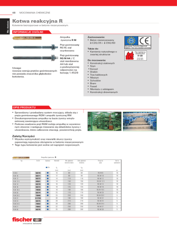 Moc. chemiczne 48 MOCOWANIA CHEMICZNE Kotwa reakcyjna R Kotwienie bezrozporowe w betonie niezarysowanym. INFORMACJE OGÓLNE Zastosowanie: ▪ Beton niezarysowany ≧ C20/25 i ≦ C50/60 Ampułka żywiczna R M Pręt gwintowany RG M, stal ocynkowana Uwaga: nowsza wersja prętów gwintowanych nie posiada znacznika głębokości kotwienia. Także do: ▪ Kamienia naturalnego o zwartej strukturze Pręt gwintowany RG M A4 / C stal nierdzewna A4 lub stal o podwyższonej odporności na korozję 1.4529 Do mocowania: ▪ Konstrukcji stalowych ▪ Szyn ▪Konsol ▪ Drabin ▪ Tras kablowych ▪ Maszyn ▪ Schodów ▪ Bram ▪ Fasad ▪ Montażu z odstępem ▪ Konstrukcji drewnianych OPIS PRODUKTU ▪ Sprawdzony i przebadany system mocujący, składa się z pręta gwintowanego RGM i ampułki żywicznej RM ▪ Dwukomponentowa ampułka na bazie żywicy winyloestrowej zawierająca utwardzacz. ▪ Podczas osadzania pręt RGM rozbija ampułkę w wywierconym otworze i następuje mieszanie się składników żywicy i utwardzacza, które całkowicie otaczają powierzchnię pręta. Zalety/Korzyści ▪ Wysoka wytrzymałość oraz niewielki skurcz żywicy zapewniają najwyższe obciążenia w betonie niezarysowanym ▪ Tego typu kotwienie jest wolne od naprężeń rozporowych. Ampułka żywiczna R Typ RM8 R M 10 R M 12 R M 12 E R M 14 R M 16 R M 16 E R M 20 R M 20 E R M 22 R M 24 R M 24 E R M 27 R M 30 Art.-Nr 50270 50271 50272 48501 50278 50273 79838 50274 79840 512763 50275 79842 79843 50276 Aprobata Wiertło-Ø ■ ETA do [mm] 10 12 14 14 16 18 18 25 25 30 28 28 32 35 ■ ■ ■ ■ ■ ■ ■ ■ ■ ■ ■ ■ ■ Min. głębokość wiercenia otworu Efekt. głębokość kotwienia t [mm] hef [mm] 80 90 110 150 120 125 190 170 240 190 210 290 250 280 80 90 110 150 120 125 190 170 240 190 210 290 250 280 Pasuje do pręta Ilość w opakowaniu RG M 8 RG M 10 RG M 12 RG M 12 E RG M 14 RG M 16 RG M 16 E RG M 20 RG M 20 E RG M 22 RG M 24 RG M 24 E RG M 27 RG M 30 10 10 10 10 10 10 10 10 5 5 5 5 5 5 szt. 49 MOCOWANIA CHEMICZNE Moc. chemiczne Kotwa reakcyjna R DANE TECHNICZNE Pręt gwintowany RG M, stal ocynkowana klasy 5.8 Typ RG M 8 x 110 RG M 8 x 150 RG M 8 x 250 RG M 10 x 130 RG M 10 x 165 RG M 10 x 190 RG M 10 x 250 RG M 10 x 350 RG M 12 x 160 RG M 12 x 180 RG M 12 x 220 RG M 12 x 250 RG M 12 x 300 RG M 12 x 380 RG M 12 x 200 E RG M 12 x 230 E RG M 12 x 290 E RG M 14 x 170 RG M 16 x 165 RG M 16 x 190 RG M 16 x 250 RG M 16 x 275E RG M 16 x 300 RG M 16 x 380 RG M 16 x 500 RG M 16 x 235 E RG M 20 x 220 RG M 20 x 260 RG M 20 x 350 RG M 20 x 500 RG M 20 x 330 E RG M 22 x 280 RG M 24 x 280 RG M 24 x 400 RG M 24 x 600 RG M 24 x 380 E RG M 27 x 340 RG M 30 x 380 RG M 30 x 500 Art.-Nr 2) 2) 2) 2) 2) 1) 1) 1) 1) 1) 1) 1) 1) 1) Aprobata Efekt. głębokość kotwienia Maks. długość użytkowa Rodzaj osadzaka ■ ETA hef [mm] t fix [mm] [mm] [mm] 80 80 80 90 90 90 90 90 110 110 110 110 110 110 150 150 150 120 125 125 125 190 125 125 125 190 170 170 170 170 240 190 210 210 210 290 250 280 280 13 60 160 20 57 82 150 250 25 50 90 120 170 255 30 60 120 38 13 35 98 60 148 235 355 20 25 65 155 305 60 65 65 165 365 60 60 65 185 5 5 5 7 7 7 7 7 8 8 8 8 8 8 8 8 10 12 12 12 12 12 12 12 12 12 12 - 13 13 13 17 17 17 17 17 19 19 19 19 19 19 19 19 19 22 24 24 24 24 24 24 24 24 30 30 30 30 30 32 36 36 36 36 41 46 46 50256 95698 95699 50257 50280 50281 95703 95718 50258 512248 50283 50284 50285 95720 50572 50574 50575 50286 50287 50259 50288 090717 50289 95722 95723 90716 512251 50260 95707 95725 90718 512252 50261 95727 95728 90719 90720 50262 95730 ■ ■ ■ ■ ■ ■ ■ ■ ■ ■ ■ ■ ■ ■ ■ ■ ■ ■ ■ ■ ■ ■ ■ ■ ■ ■ ■ ■ ■ ■ ■ ■ ■ ■ ■ ■ ■ Rozmiar klucza Pasuje do ampułki Ilość w opakowaniu 50270 RM 8 50270 RM 8 50270 RM 8 50271 RM 10 50271 RM 10 50271 RM 10 50271 RM 10 50271 RM 10 50272 RM 12 50272 RM 12 50272 RM 12 50272 RM 12 50272 RM 12 50272 RM 12 48501 RM 12 E 48501 RM 12 E 48501 RM 12 E 50278 RM 14 50273 RM 16 50273 RM 16 50273 RM 16 79838 RM 16 E 50273 RM 16 50273 RM 16 50273 RM 16 79838 RM 16 E 50274 RM 20 50274 RM 20 50274 RM 20 50274 RM 20 79840 RM 20 E 512763 RM 22 50275 RM 24 50275 RM 24 50275 RM 24 79842 RM 24 E 79843 RM 27 50276 RM 30 50276 RM 30 10 10 10 10 10 10 10 10 10 10 10 10 10 10 10 10 10 10 10 10 10 10 10 10 10 10 10 10 10 10 10 5 10 10 5 5 5 5 5 SW 1) pręt ścięty, wymagany dodatkowy osadzak (patrz str. 51) 2) pręt ścięty, osadzak w opakowaniu. MONTAŻ Rodzaj montażu ▪ Montaż wstępny Informacje montażowe ▪ Możliwość stosowania w mokrym betonie. ▪ Osadzanie musi odbyć się przy pomocy wiertarki z udarem (równocześnie należy zapewnić ruch obrotowy i udarowy) . ▪ Szczotka do betonu zobacz str. 50. szt. Moc. chemiczne 50 MOCOWANIA CHEMICZNE DANE TECHNICZNE Pręt gwintowany RG M, stal nierdzewna A4 Typ Art.-Nr RG M 8 x 110 A4 RG M 8 x 150 A4 RG M 8 x 250 A4 RG M 10 x 130 A4 RG M 10 x 165 A4 RG M 10 x 190 A4 RG M 10 x 250 A4 RG M 10 x 350 A4 RG M 12 x 160 A4 RG M 12 x 220 A4 RG M 12 x 250 A4 RG M 12 x 300 A4 RG M 12 x 380 A4 RG M 12 x 600 A4 RG M 12 x 200 E A4 RG M 12 x 230 E A4 RG M 12 x 290 E A4 RG M 16 x 165 A4 RG M 16 x 190 A4 RG M 16 x 250 A4 RG M 16 x 300 A4 RG M 16 x 380 A4 RG M 16 x 500 A4 RG M 16 x 235 E A4 RG M 16 x 275 E A4 RG M 20 x 260 A4 RG M 20 x 350 A4 RG M 24 x 300 A4 RG M 24 x 400 A4 RG M 27 x 340 A4 RG M 30 x 380 A4 2) 2) 2) 2) 2) 1) 1) 1) 1) 1) 50263 50293 95700 50264 50294 50296 95701 95709 50265 50297 95702 95705 95710 95711 50576 50577 50578 95704 50266 50298 50299 95712 95713 90721 90722 50267 95706 50268 95715 90725 90726 96316 96217 96218 96219 RG M 8 x 110 C RG M 10 x 130 C RG M 12 x 160 C RG M 16 x 190 C 1) 512247 512250 RG M 12 x 160 fvz RG M 16 x 190 fvz Pręt gwintowany RG M, stal o podwyższonej odporności na korozję 1.4529 Aprobata Efekt. głębokość kotwienia Maks. długość użytkowa Rodzaj osadzaka ■ ETA hef [mm] t fix [mm] [mm] [mm] 80 80 80 90 90 90 90 90 110 110 110 110 110 110 150 